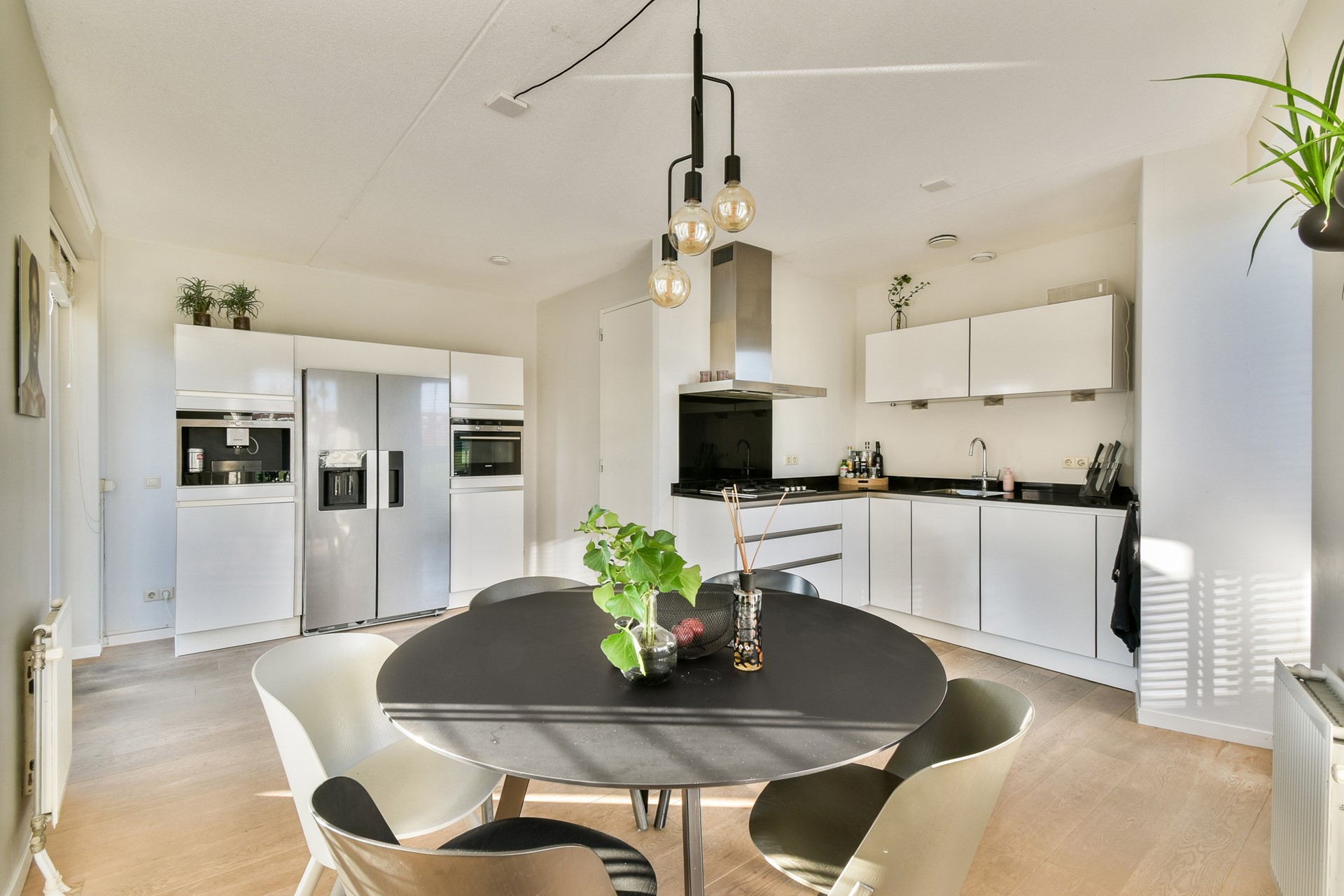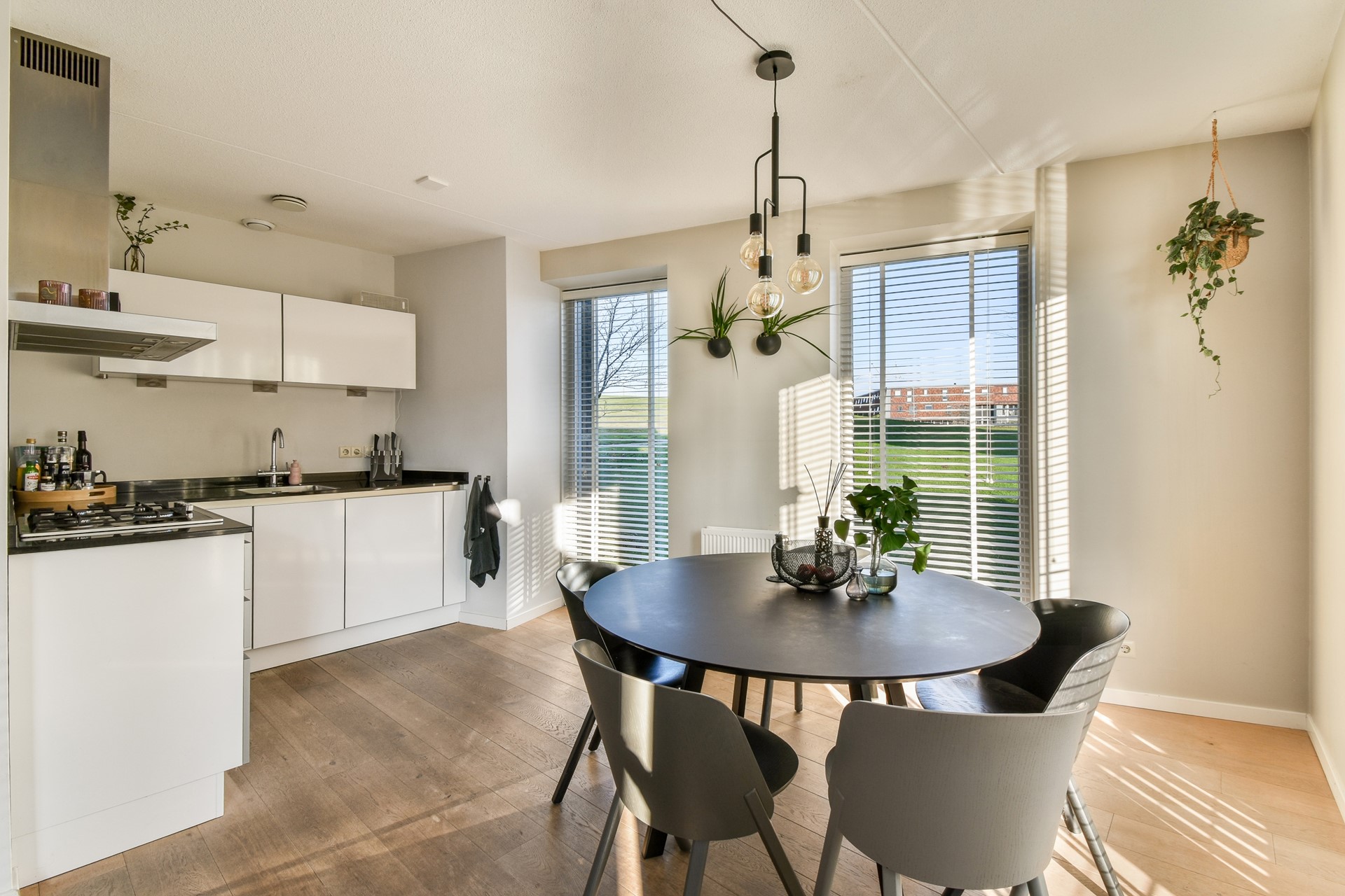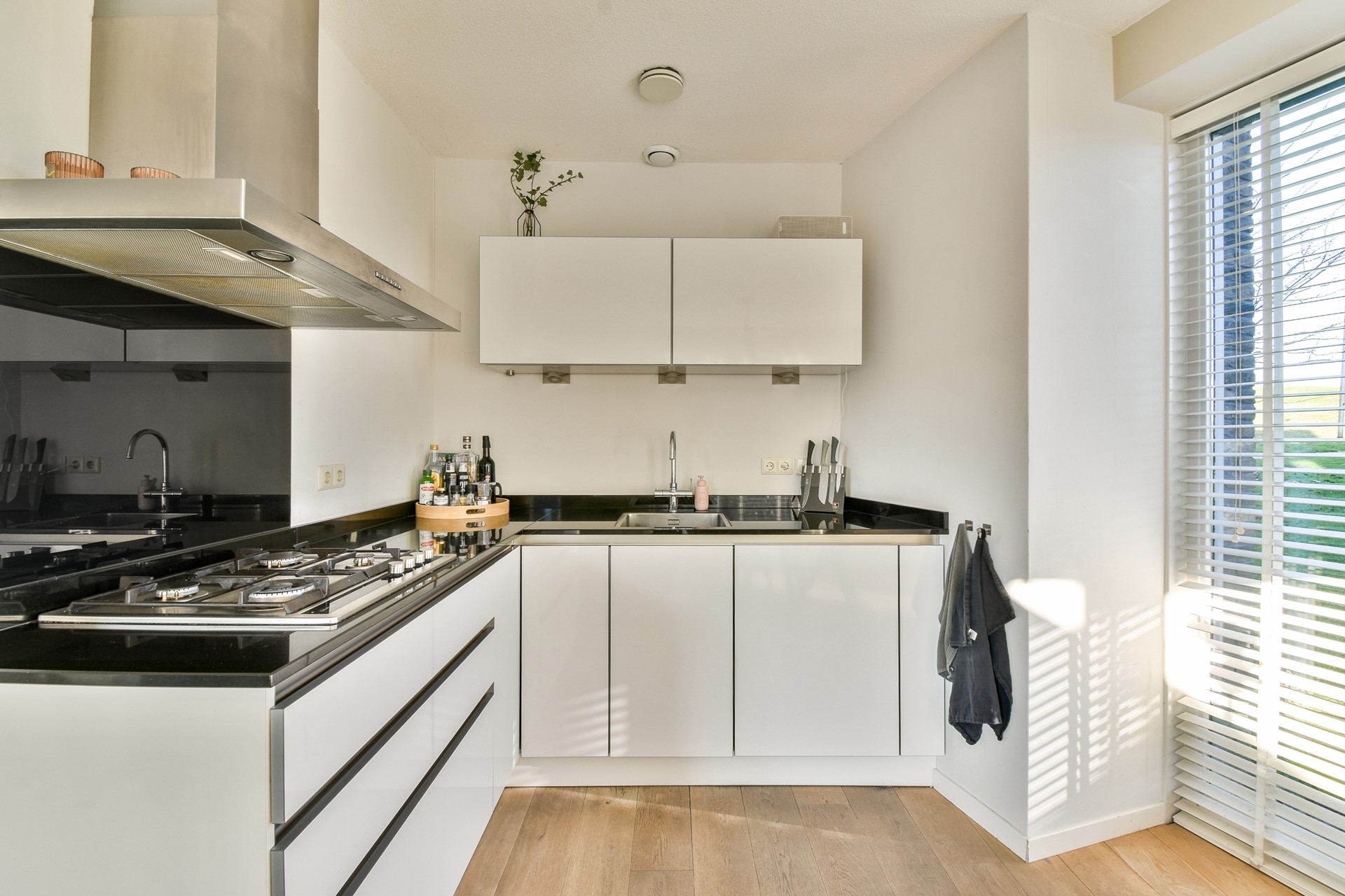 Loop je door, dan kom je in de lichte en gezellige woonkeuken/eetkamer. De grote ramen rondom zorgen hier voor een fantastische natuurlijke lichtinval. De keuken is strak vormgegeven, tijdloos wit en voorzien van alle apparatuur die je maar nodig hebt: een gaskookplaat, vaatwasser, koelkast, vriezer, Quooker, oven én een ingebouwde koffiemachine voor de perfecte start van je ochtend.