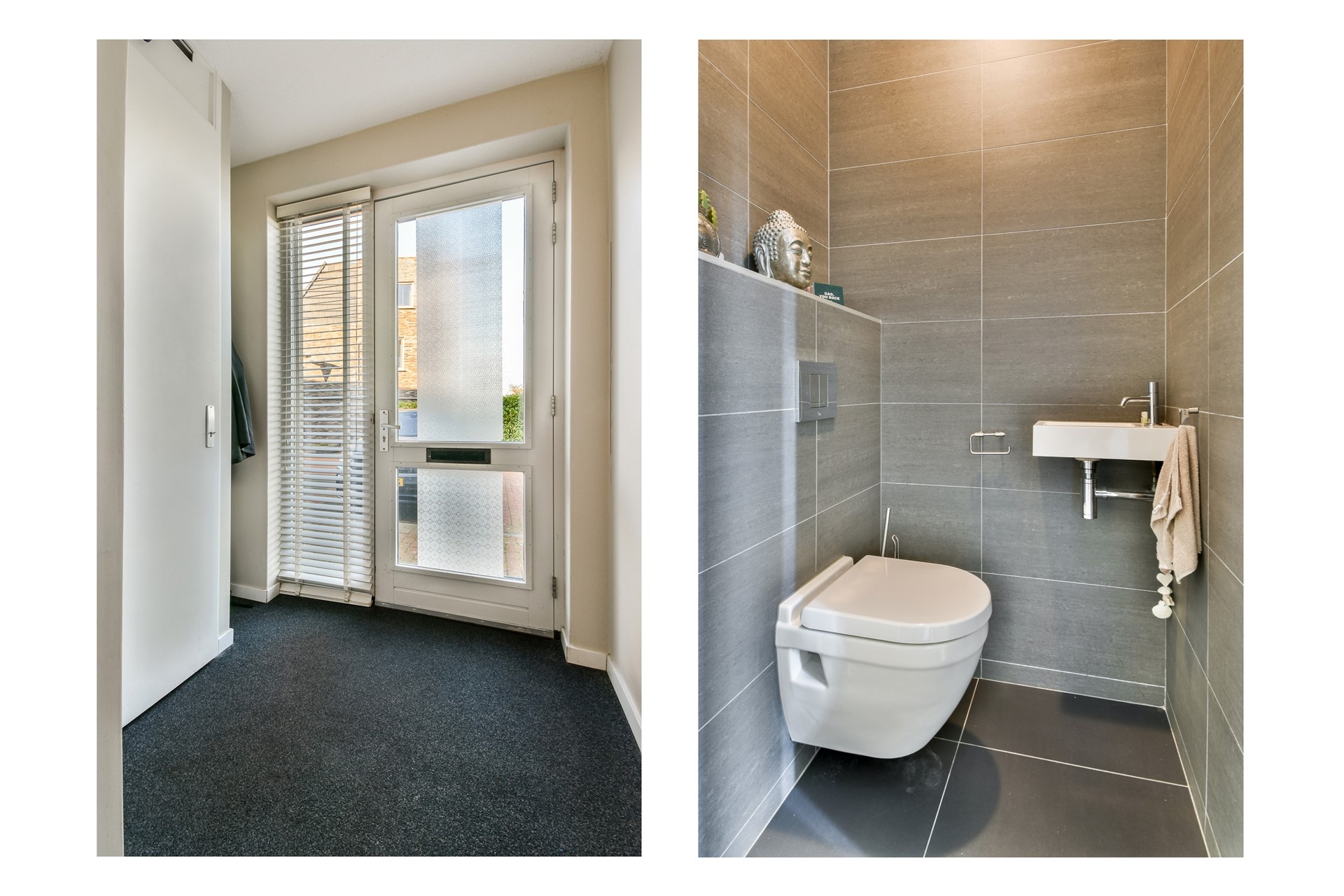 Welkom! Je komt binnen in een keurige, lichte hal waar meteen de fijne sfeer van het huis voelbaar wordt. Hier vind je toegang tot de ruime inpandige berging, een enorme plus die je niet vaak ziet bij woningen in deze bouwstijl. Ideaal voor bijvoorbeeld fietsen, voorraad en gereedschap. Daarnaast is er een keurig afgewerkt toilet, trapkast en de trapopgang naar de woonverdieping.