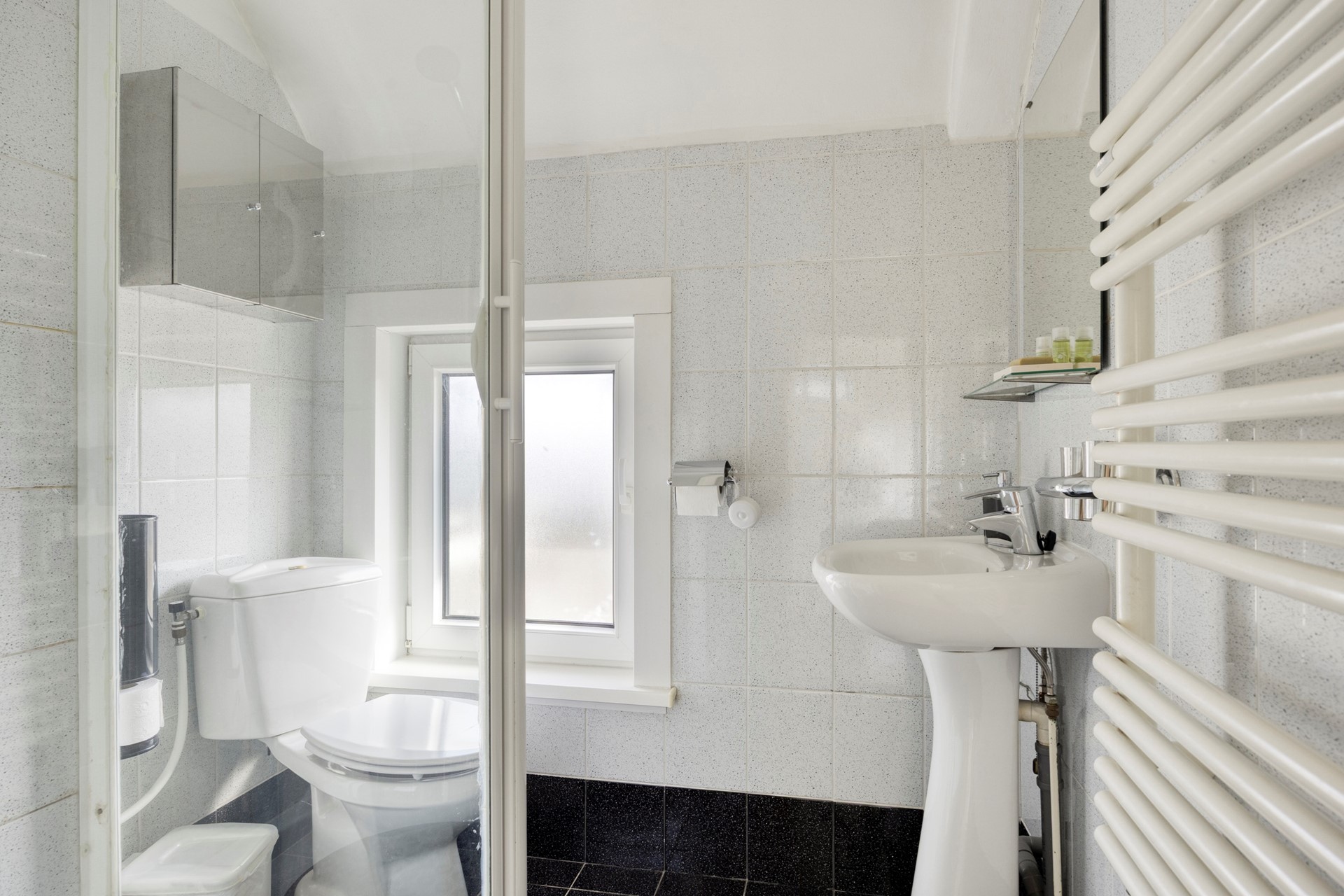 Op de eerste verdieping vind je de overloop, twee slaapkamers en de badkamer. De slaapkamer aan de achterzijde heeft toegang tot het royale dakterras, een heerlijke plek waar je volop van de zon kunt genieten. De tweede slaapkamer is ook fijn van formaat en daardoor geschikt als slaap-, werk- of logeerkamer. De badkamer is praktisch ingedeeld en voorzien van douche, wastafel en toilet.