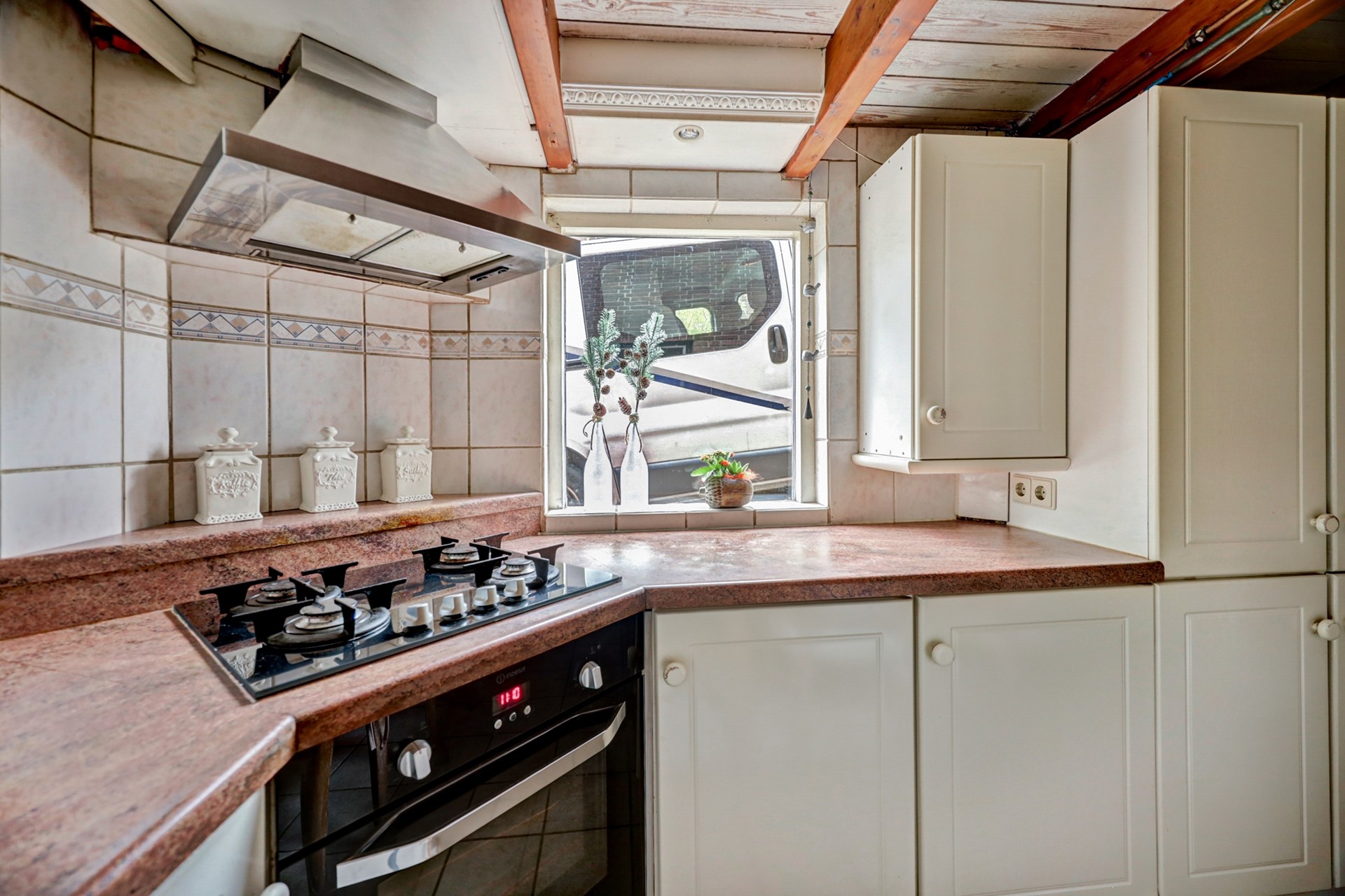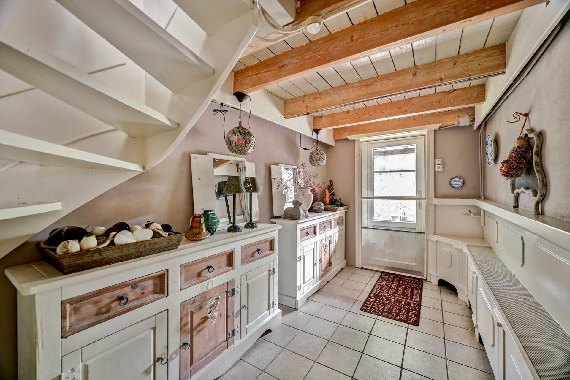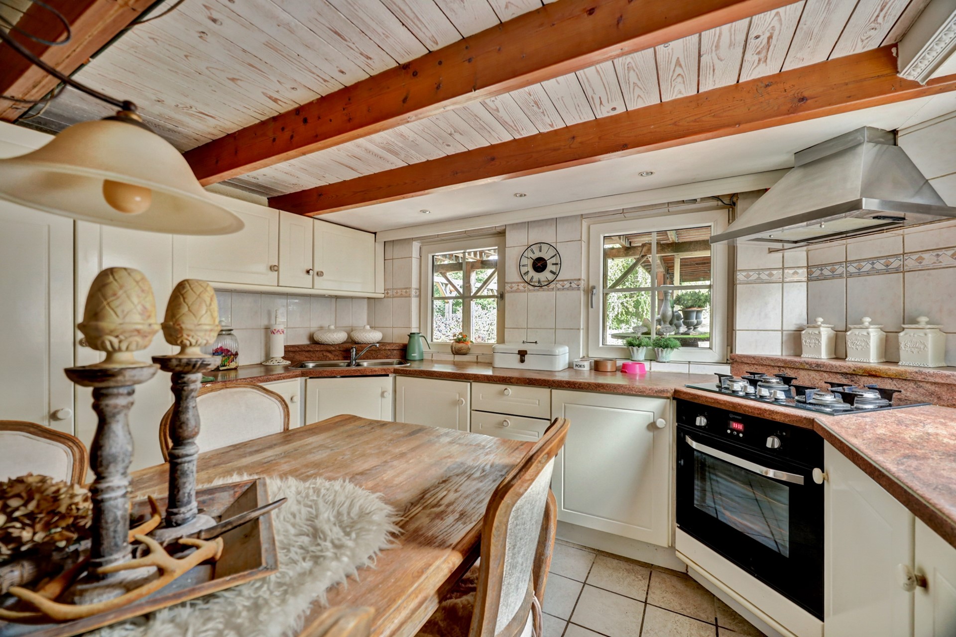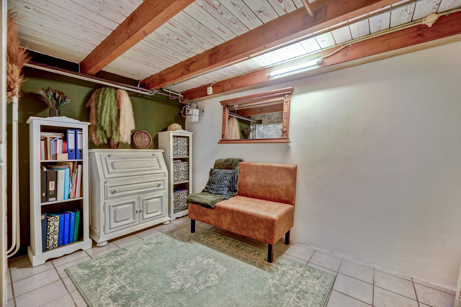 In het souterrain is de indeling als volgt: ruime hal met loopdeur naar de tuin en toegang tot de c.v.-/wasruimte en de woonkeuken (422 x 364 met balkenplafond en keurige hoekinbouwkeuken v.v. -apparatuur) met toegang tot een grote binnenberging (364 x 220).