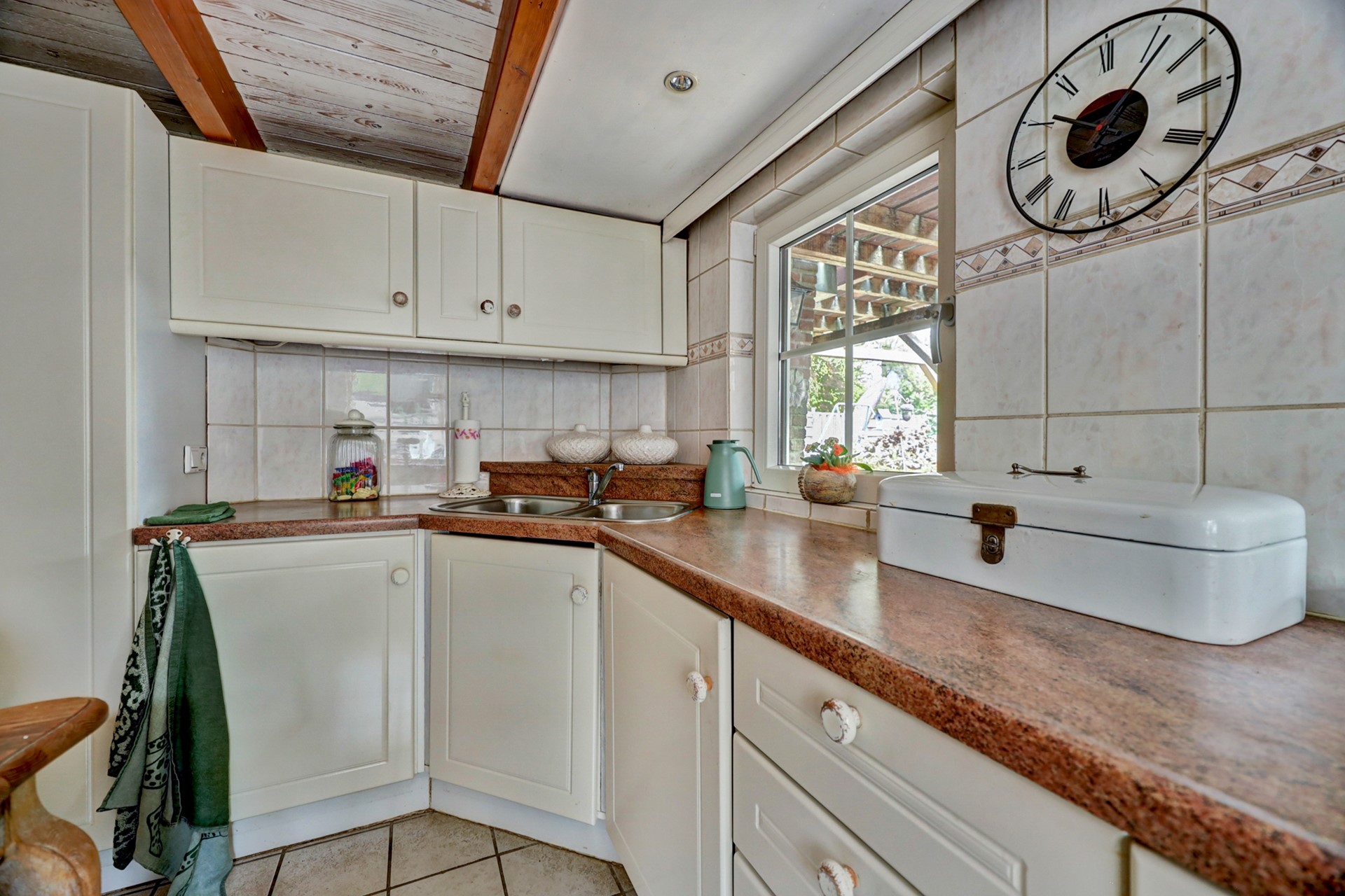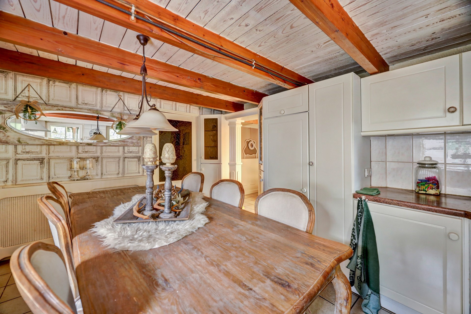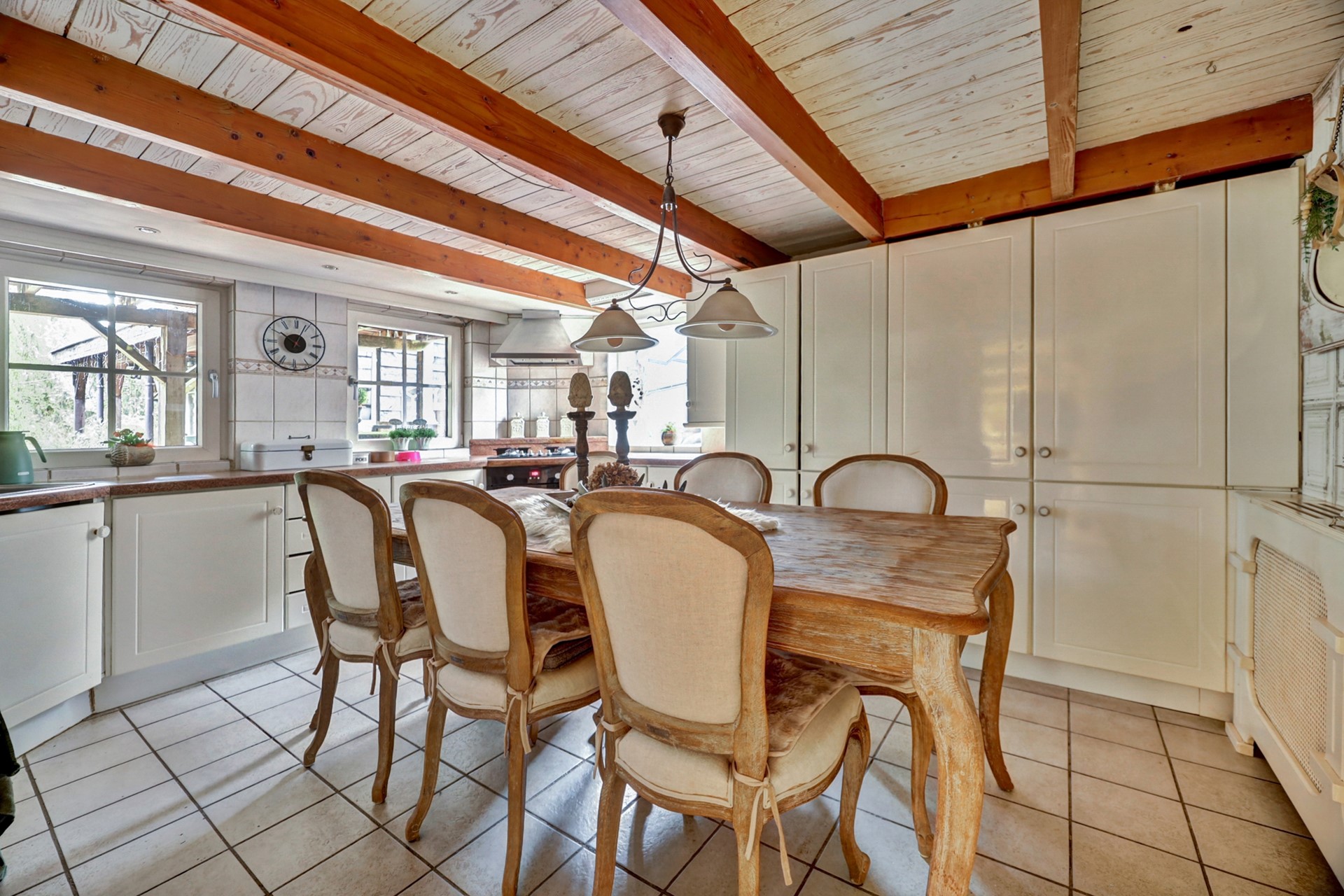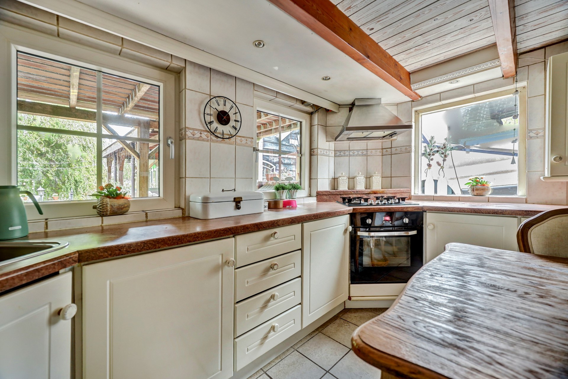 In het souterrain is de indeling als volgt: ruime hal met loopdeur naar de tuin en toegang tot de c.v.-/wasruimte en de woonkeuken (422 x 364 met balkenplafond en keurige hoekinbouwkeuken v.v. -apparatuur) met toegang tot een grote binnenberging (364 x 220).