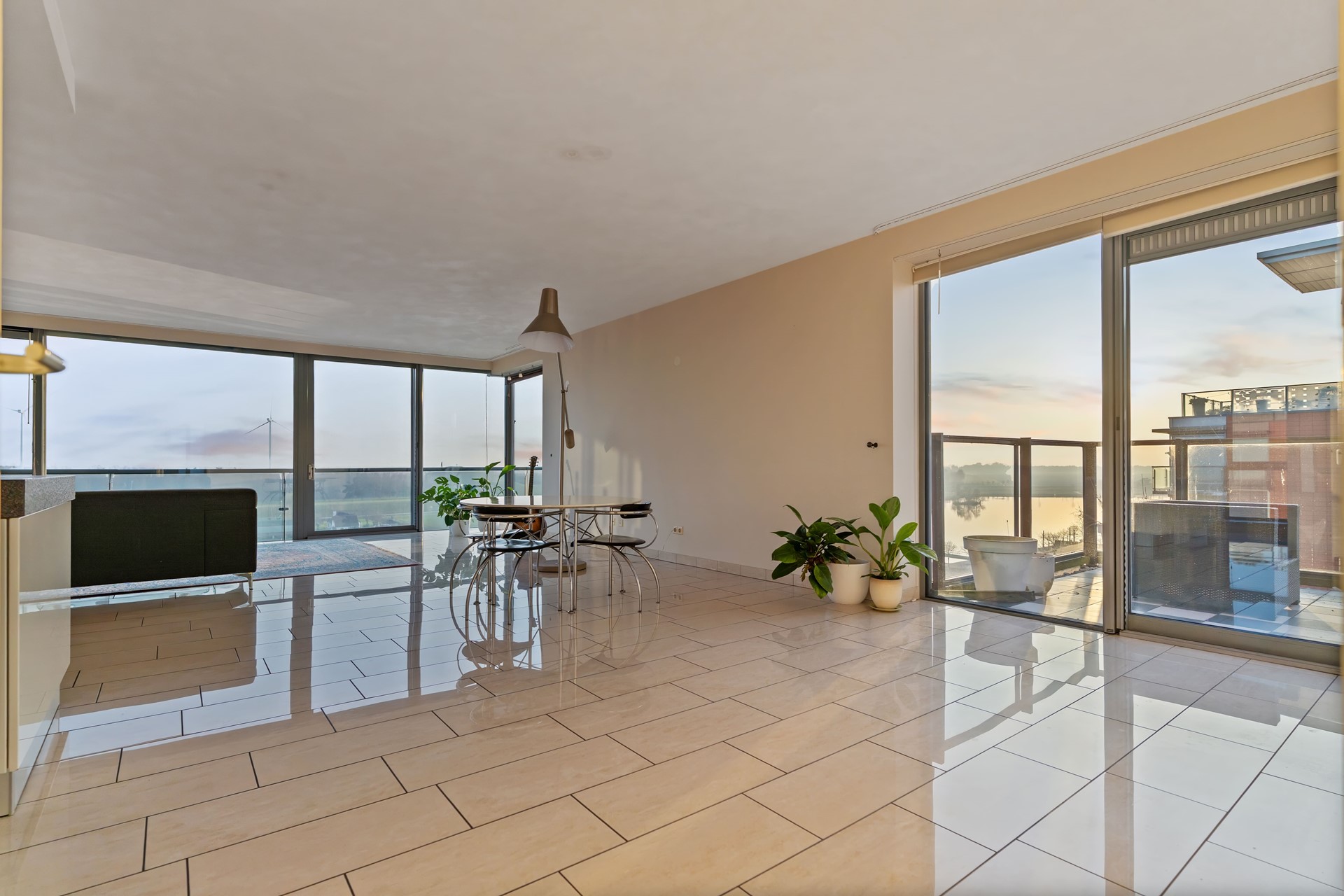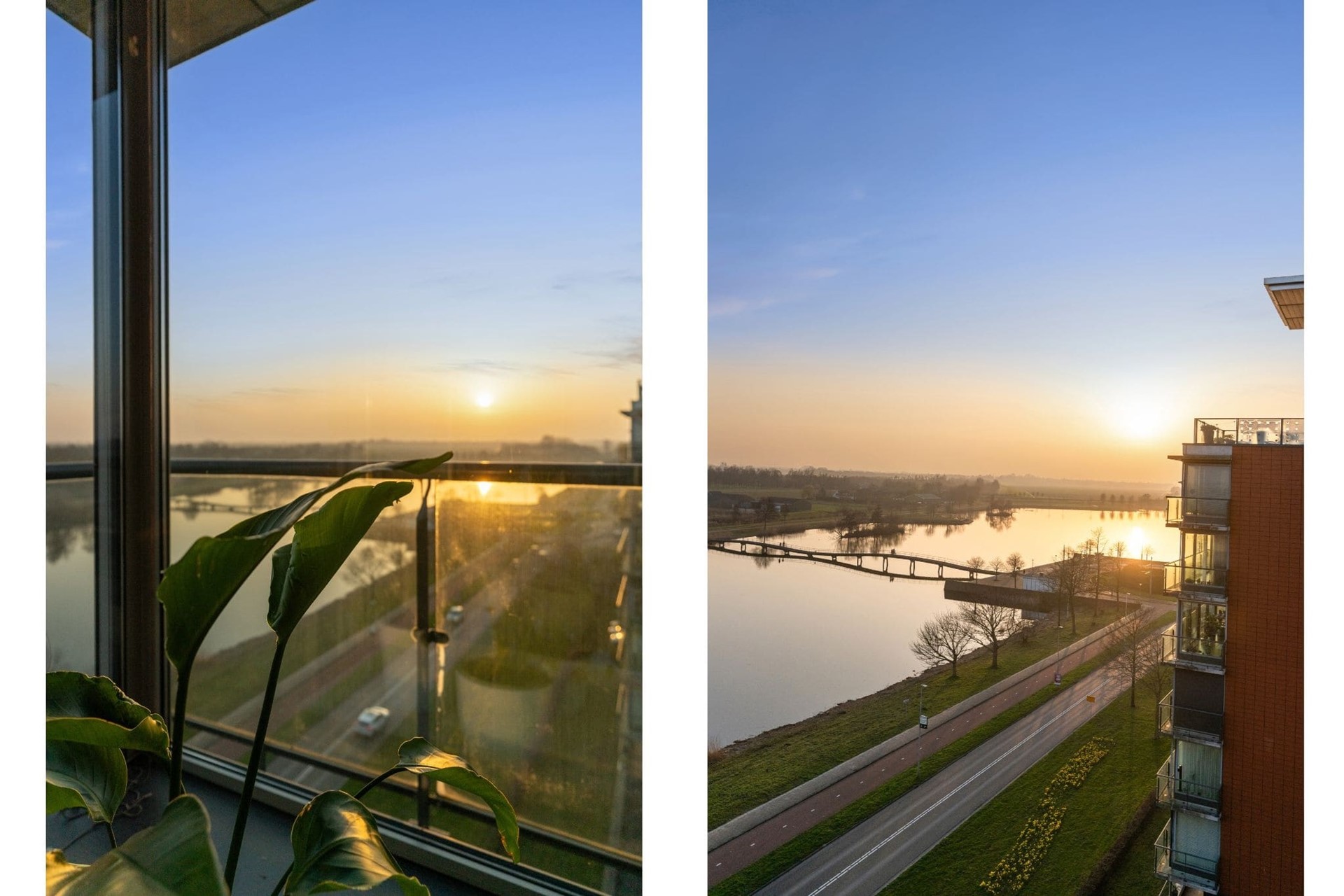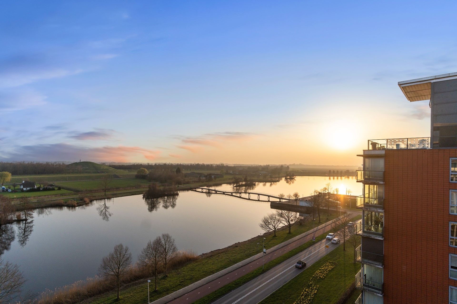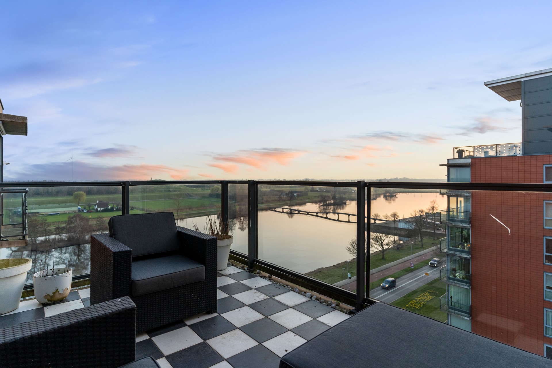 Vanuit de leefruimte bereikt u het ruime balkon, een heerlijke plek om te ontspannen en te genieten van het spectaculaire uitzicht over het water, de brug en het uitgestrekte landschap. Hier sluit u de avond af met een indrukwekkende zonsondergang.