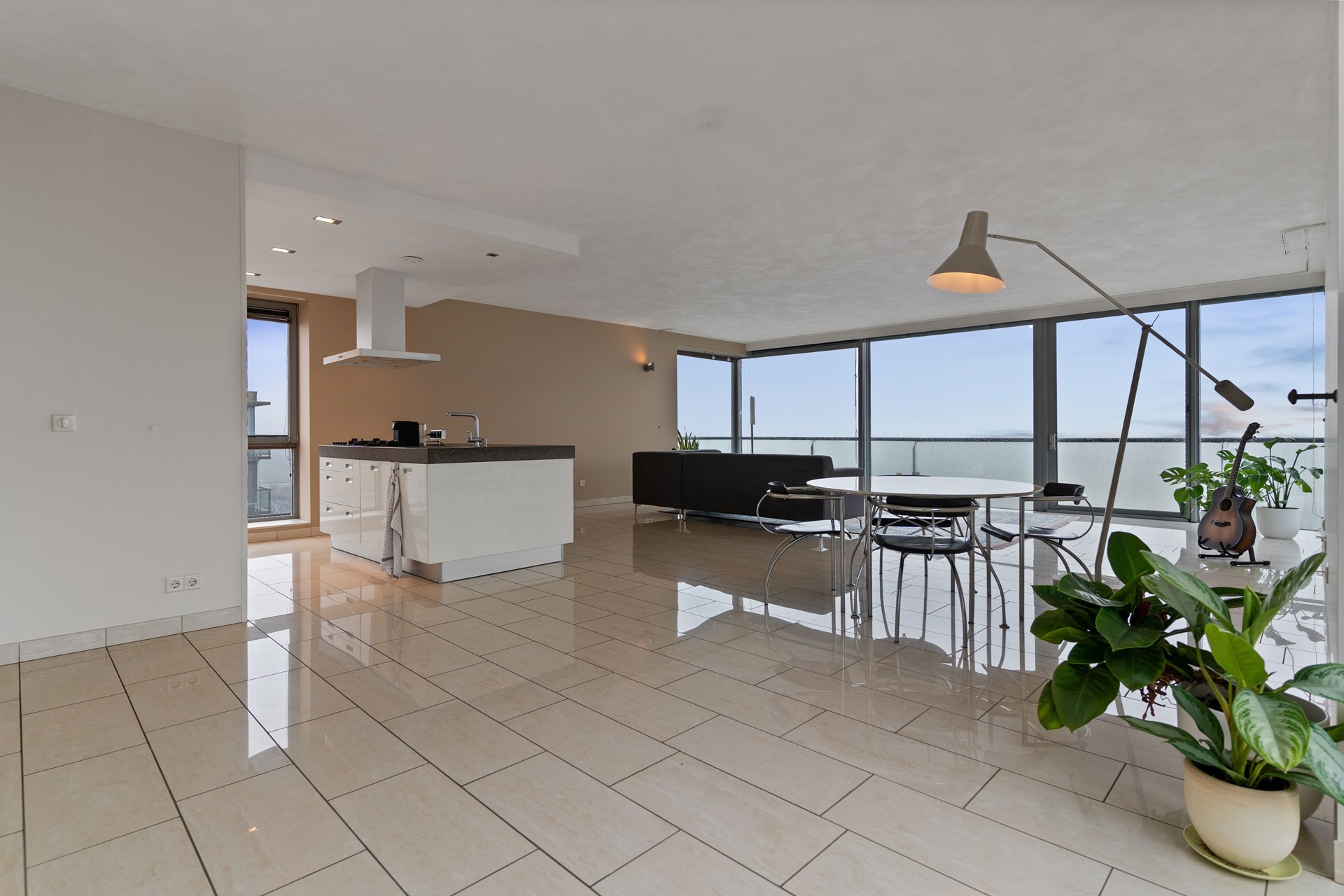 De ruime woonkamer met open keuken vormt het hart van de woning. Dankzij de royale maatvoering en grote raampartijen valt hier veel natuurlijk licht naar binnen en ontstaat een bijzonder prettige leefruimte met adembenemend uitzicht. De keuken is praktisch opgesteld met een kookeiland, waardoor koken en samenzijn naadloos in elkaar overlopen.