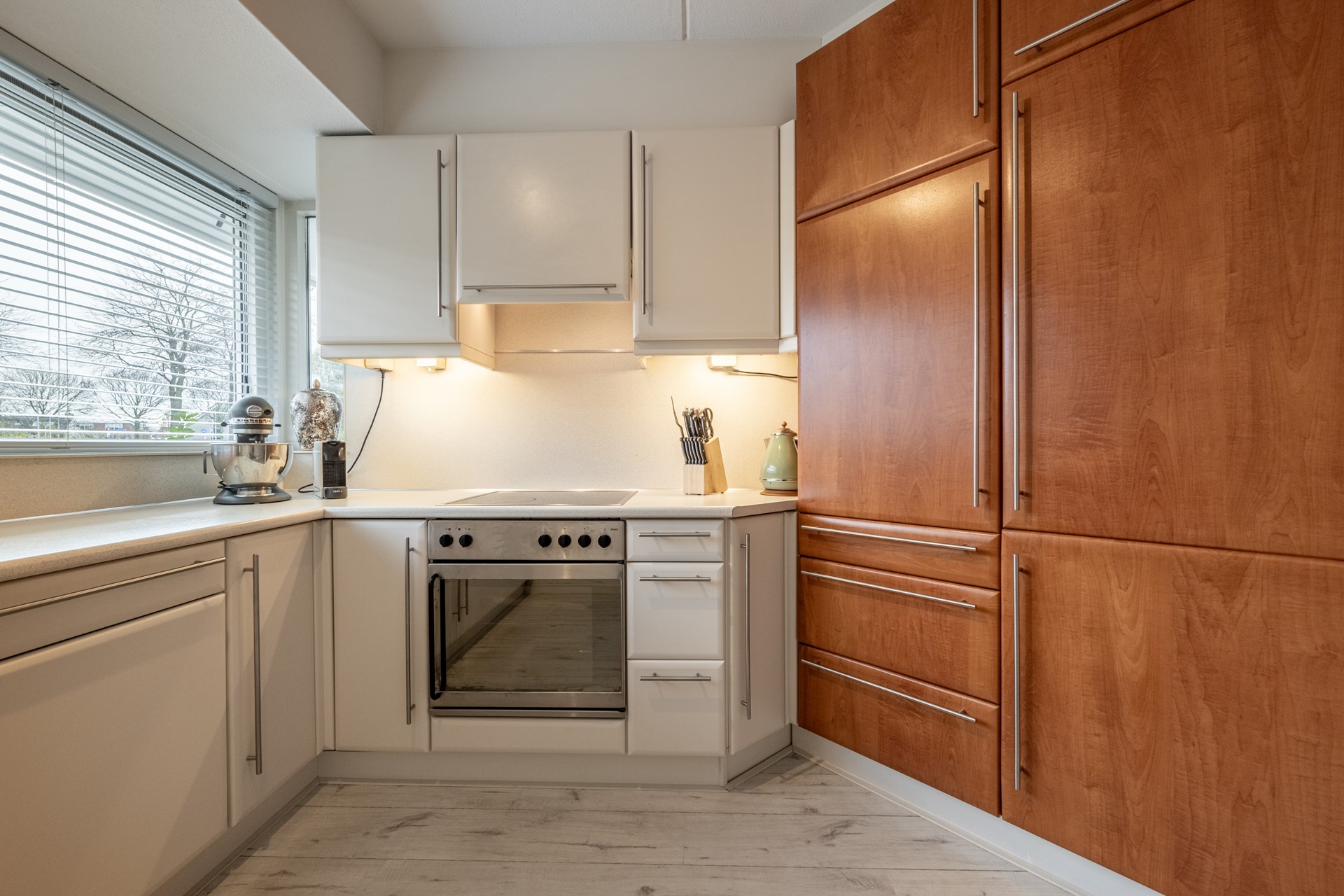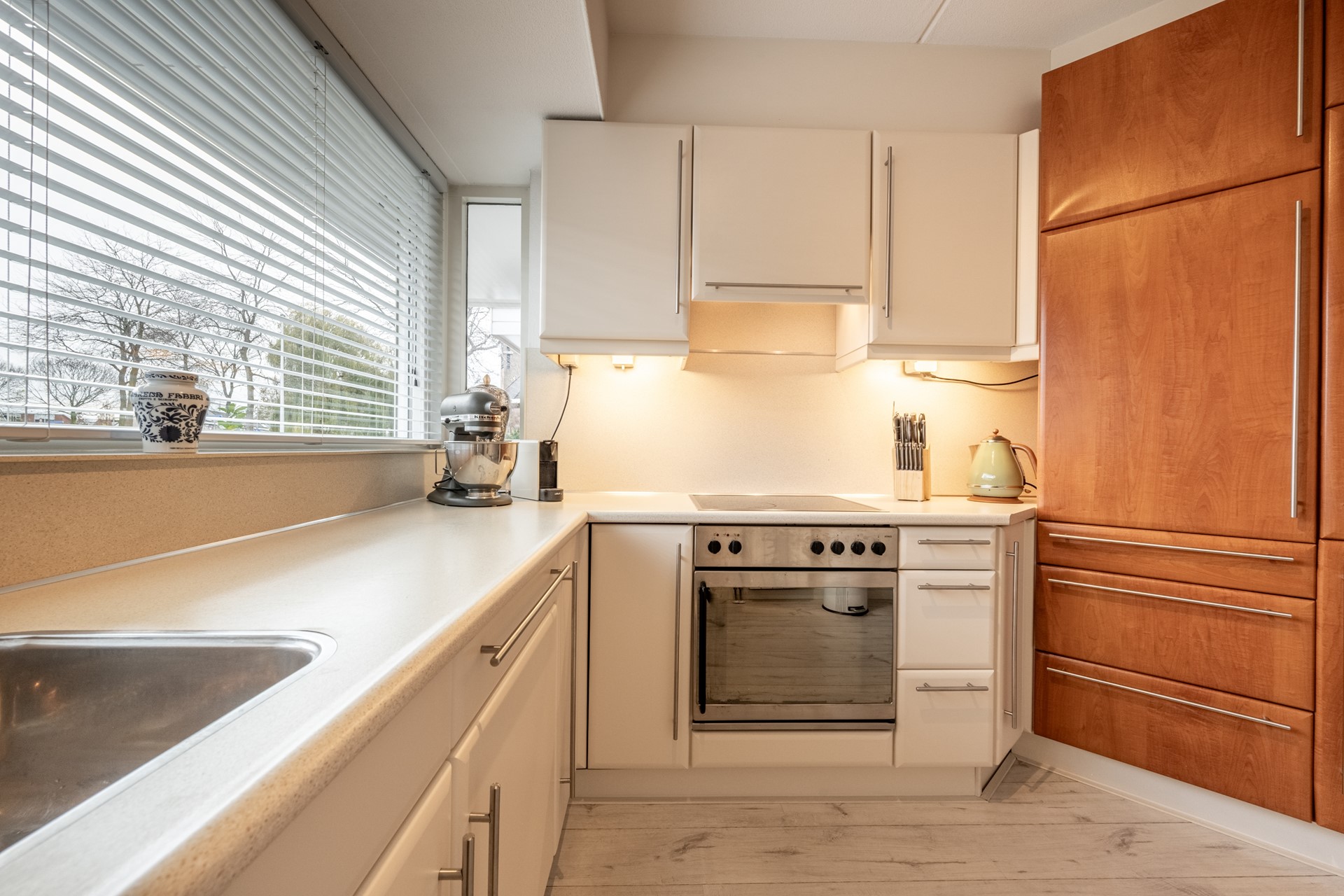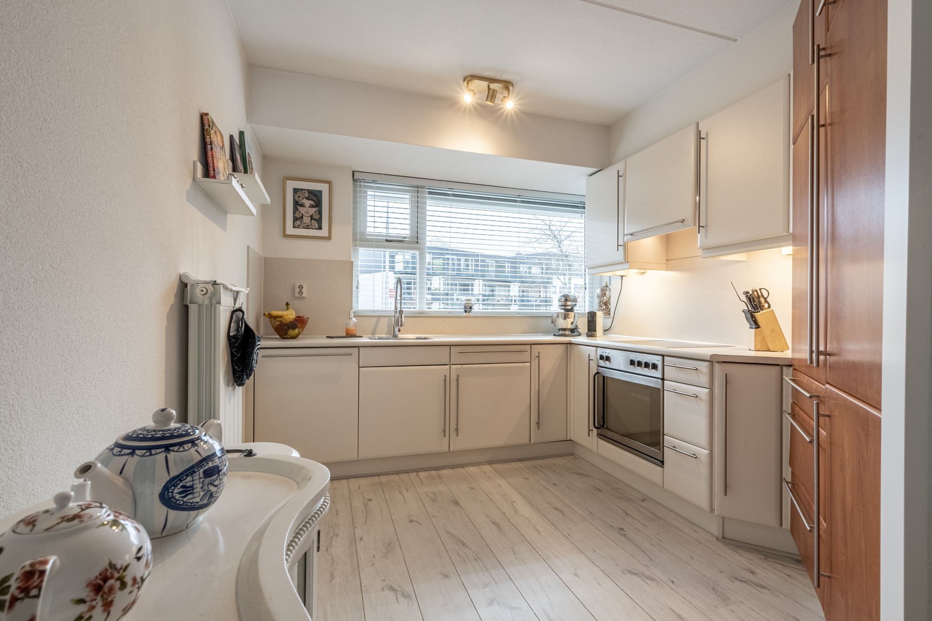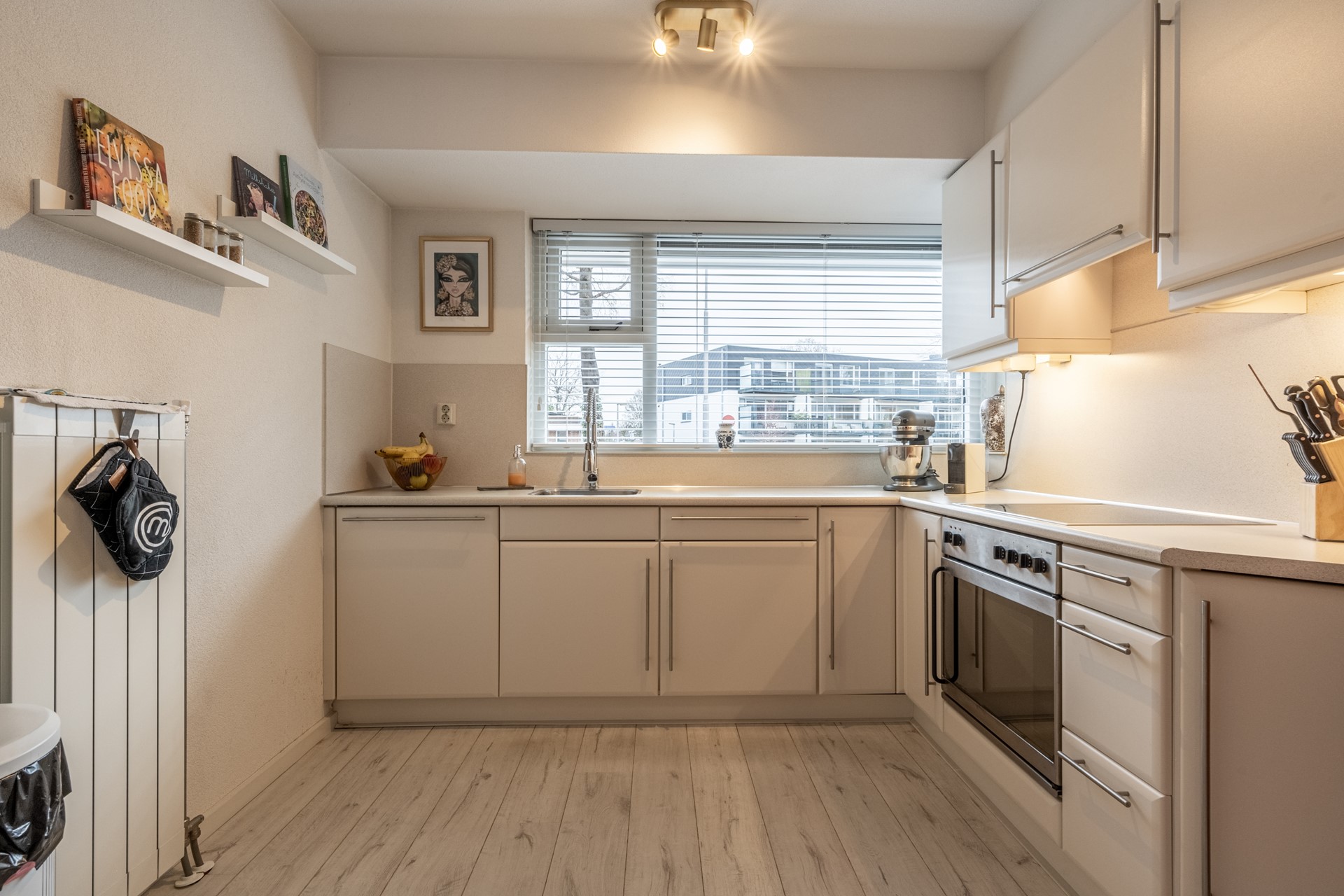 Aan de voorzijde van de woning bevindt zich de keuken in L-opstelling, voorzien van diverse inbouwapparatuur. Door de fijne indeling heb je hier verrassend veel werk- én kastruimte. De gehele begane grond is voorzien van vloerverwarming.