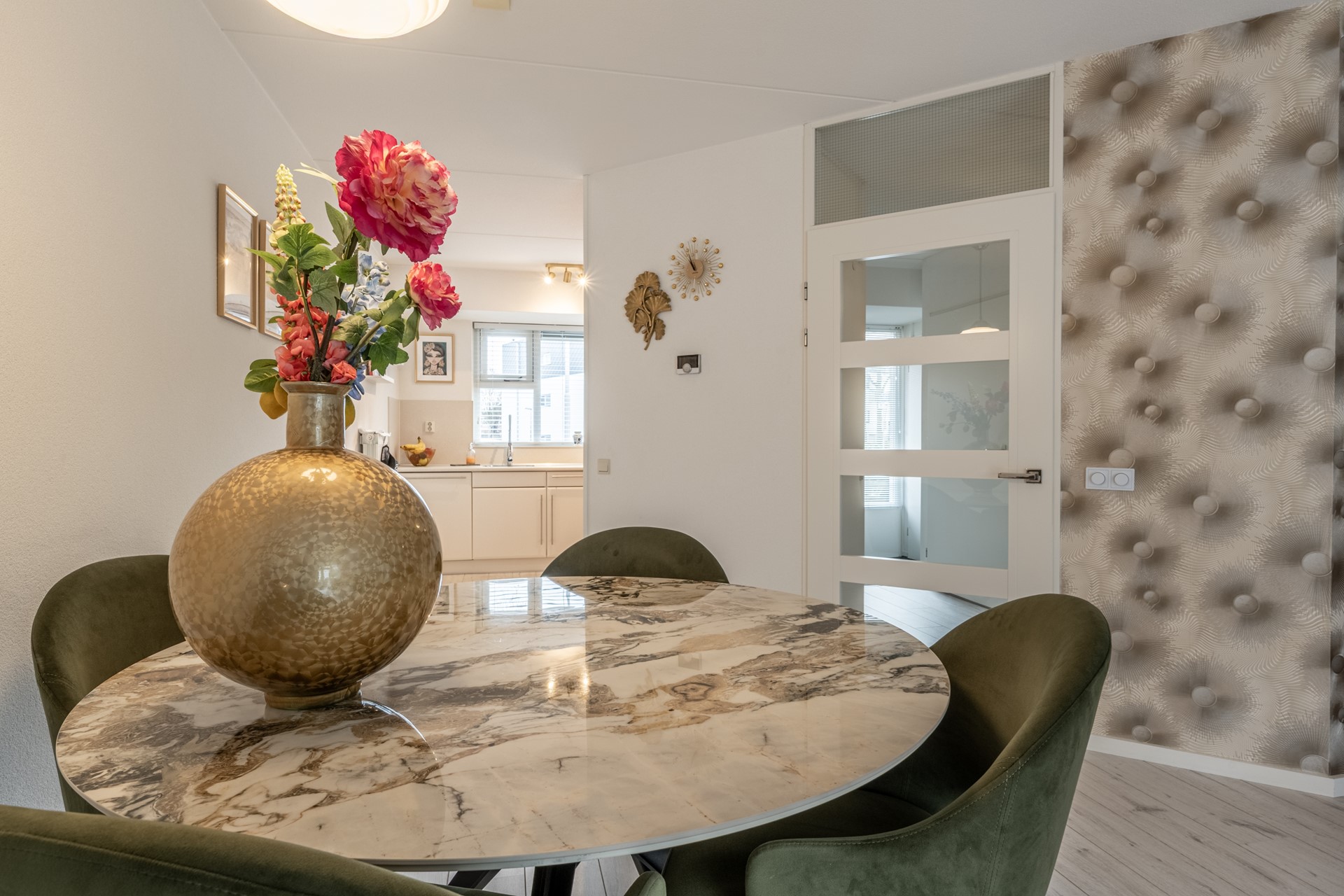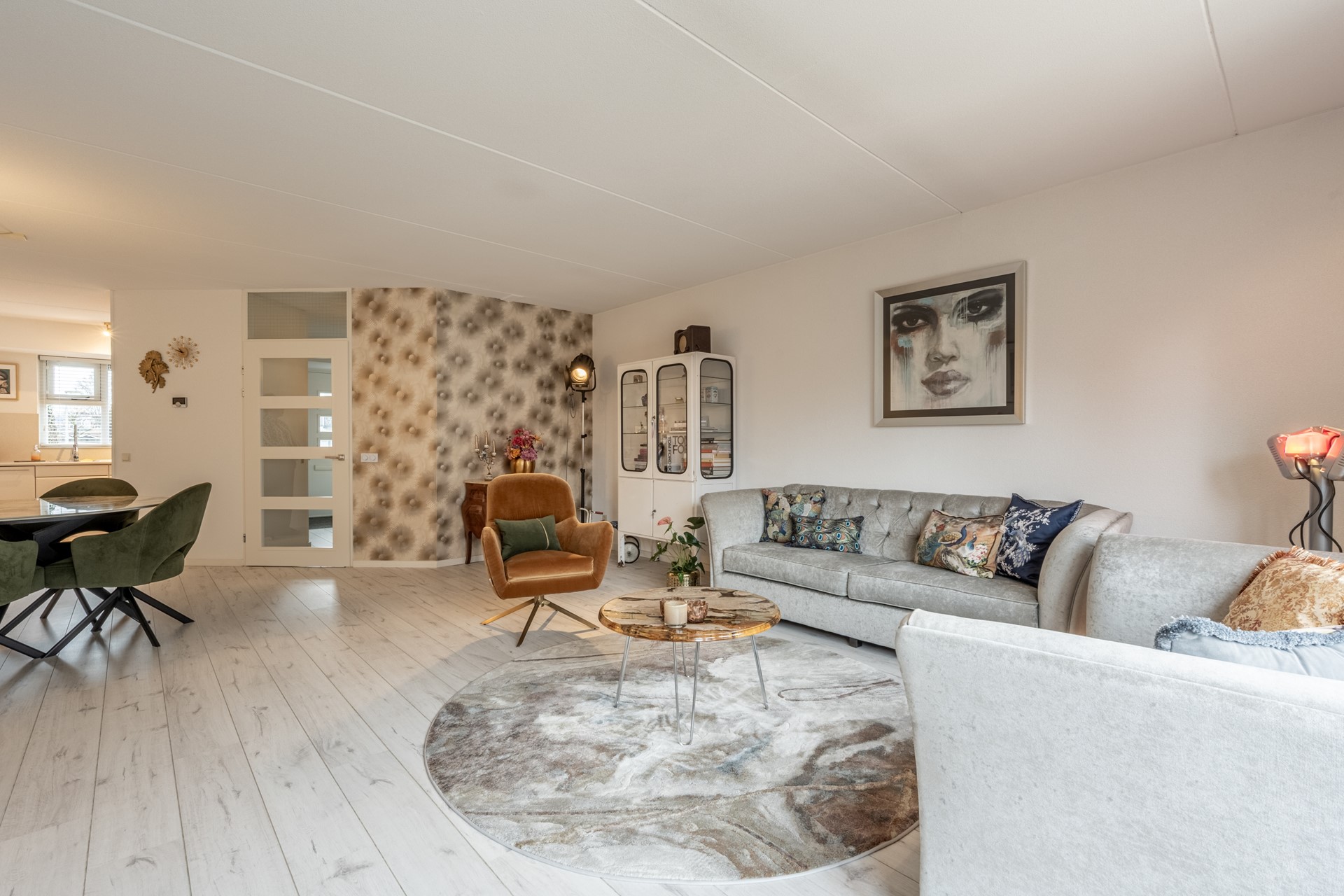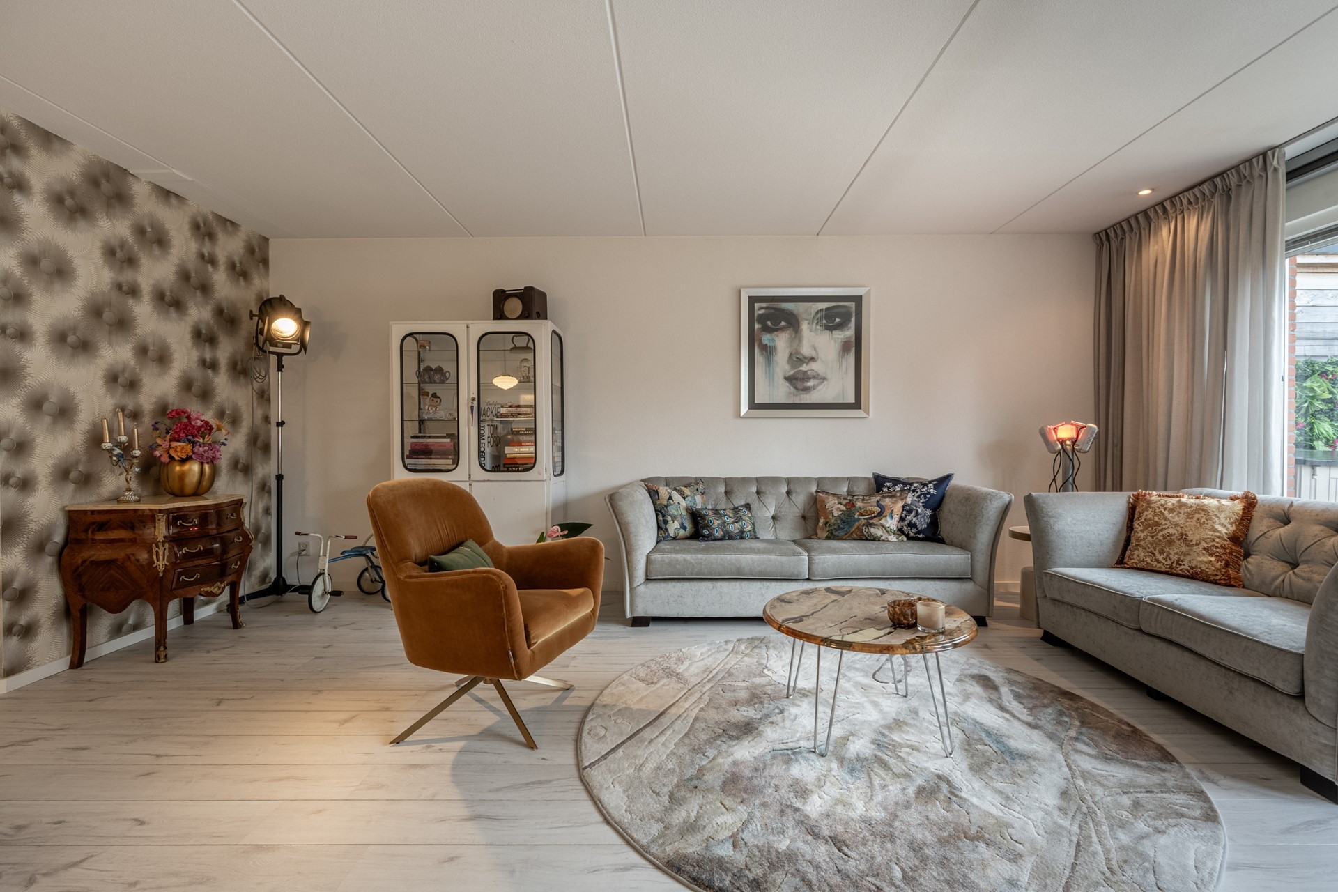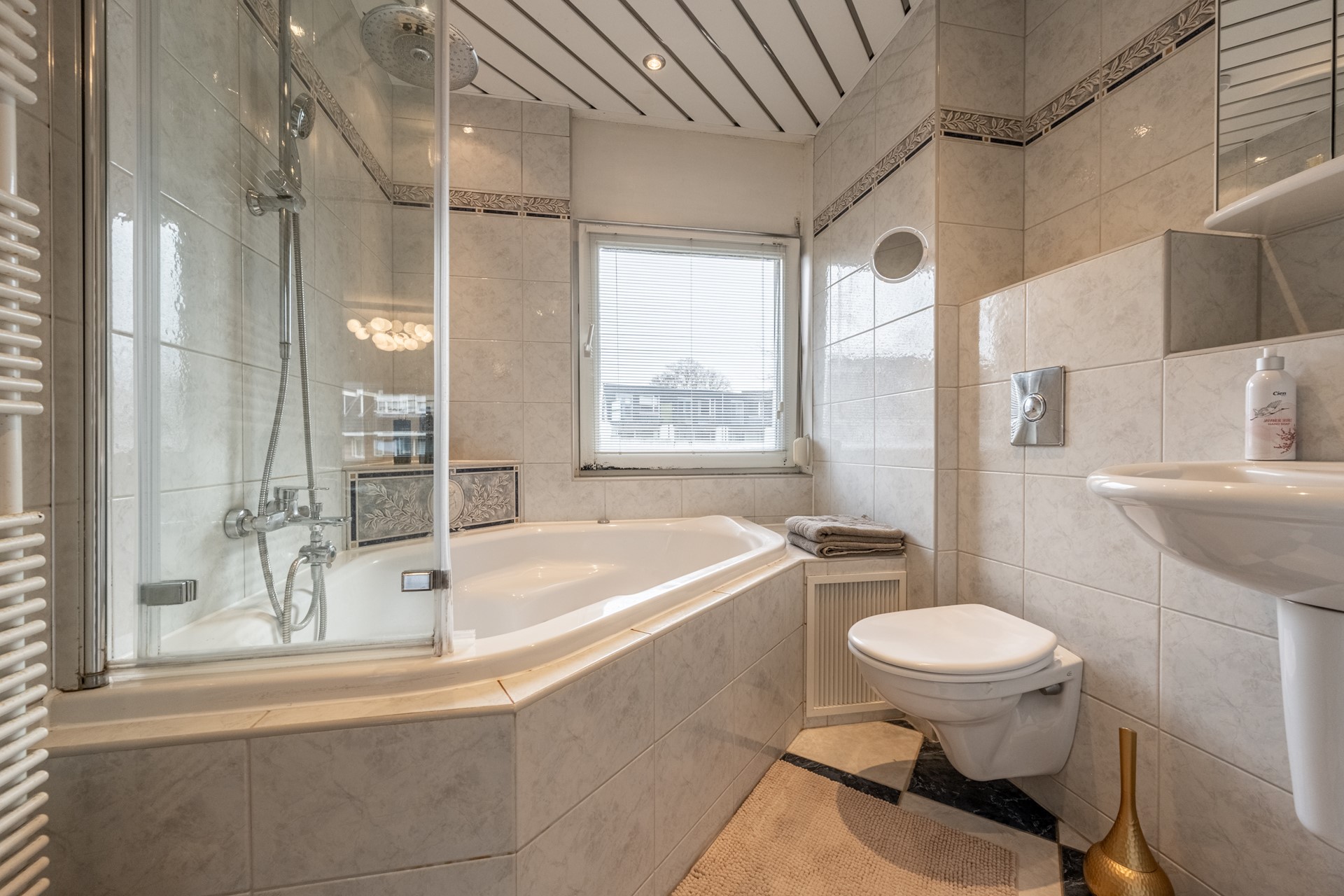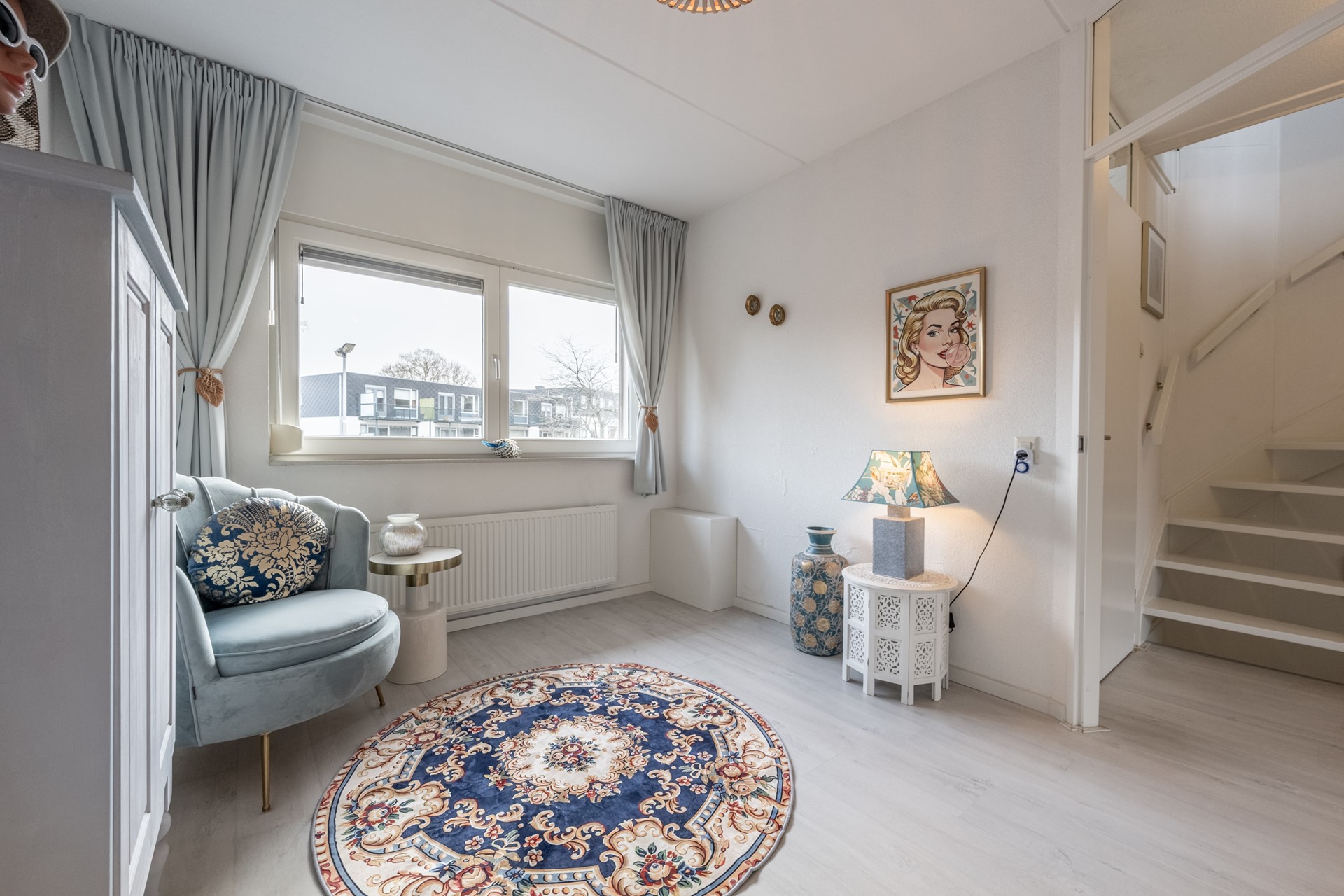 Je komt binnen in de nette hal met de luxe toiletruimte (2023), een echte eyecatcher dankzij de marmerlook wand en het stijlvolle hexagon-tegelwerk. In de hal is er ook een vaste kast met hier de opstelplaats van de cv-ketel (Remeha 2025) en de trap naar de 1e verdieping. Vanuit de hal bereik je de royale, tuingerichte woonkamer. De woonkamer is extra ruim dankzij de uitbouw, heeft grote raampartijen en voelt heerlijk licht en sfeervol. Hier kun je direct je meubels neerzetten en genieten.