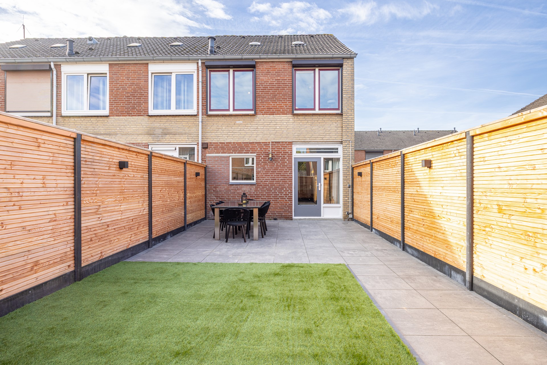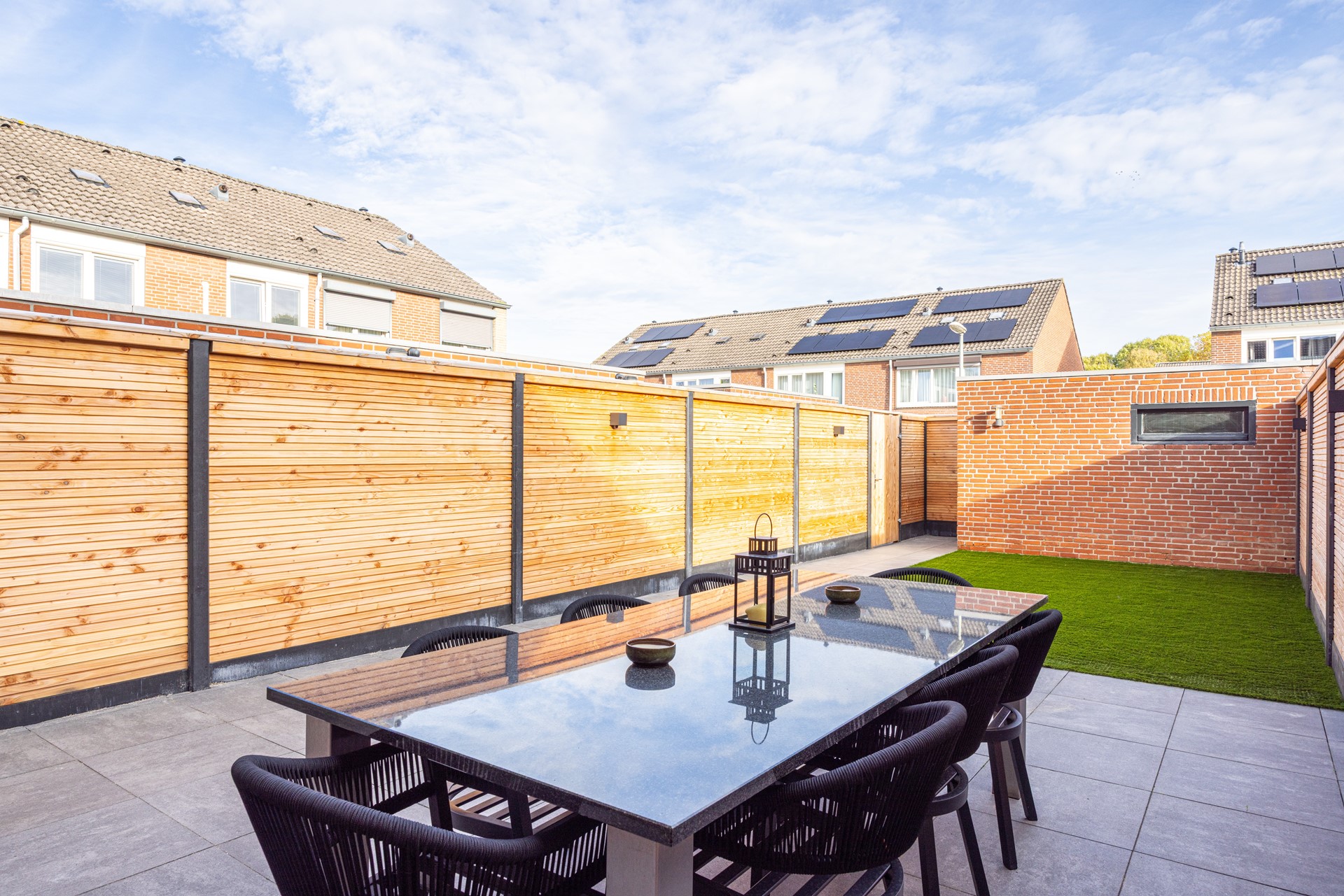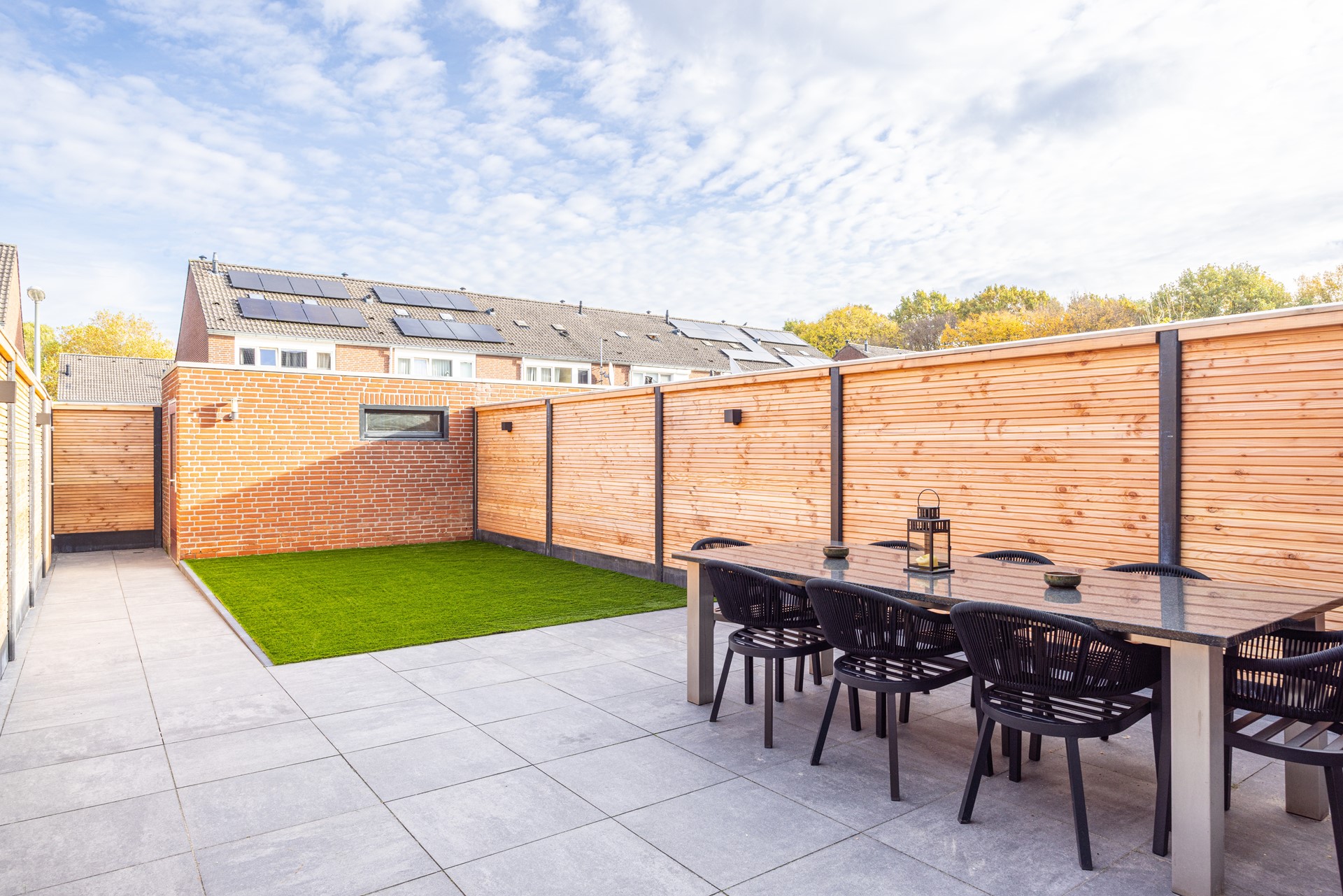 De achtertuin is met zorg aangelegd en vormt een fijne verlenging van de leefruimte binnen. Grote siertegels en een grasveld zorgen voor een onderhoudsvriendelijke en nette uitstraling. Dankzij de houten erfafscheiding geniet je hier van optimale privacy en rust.
