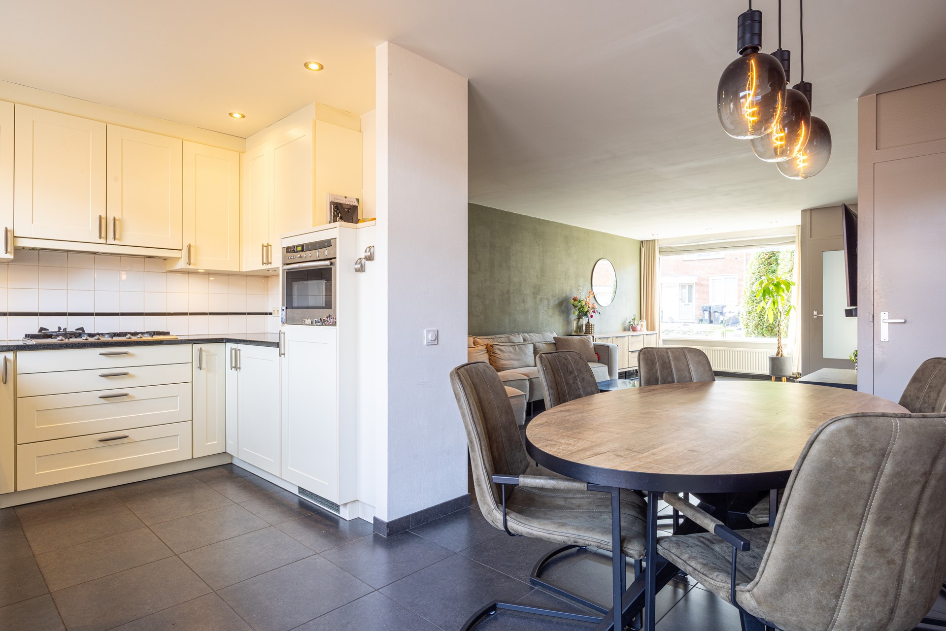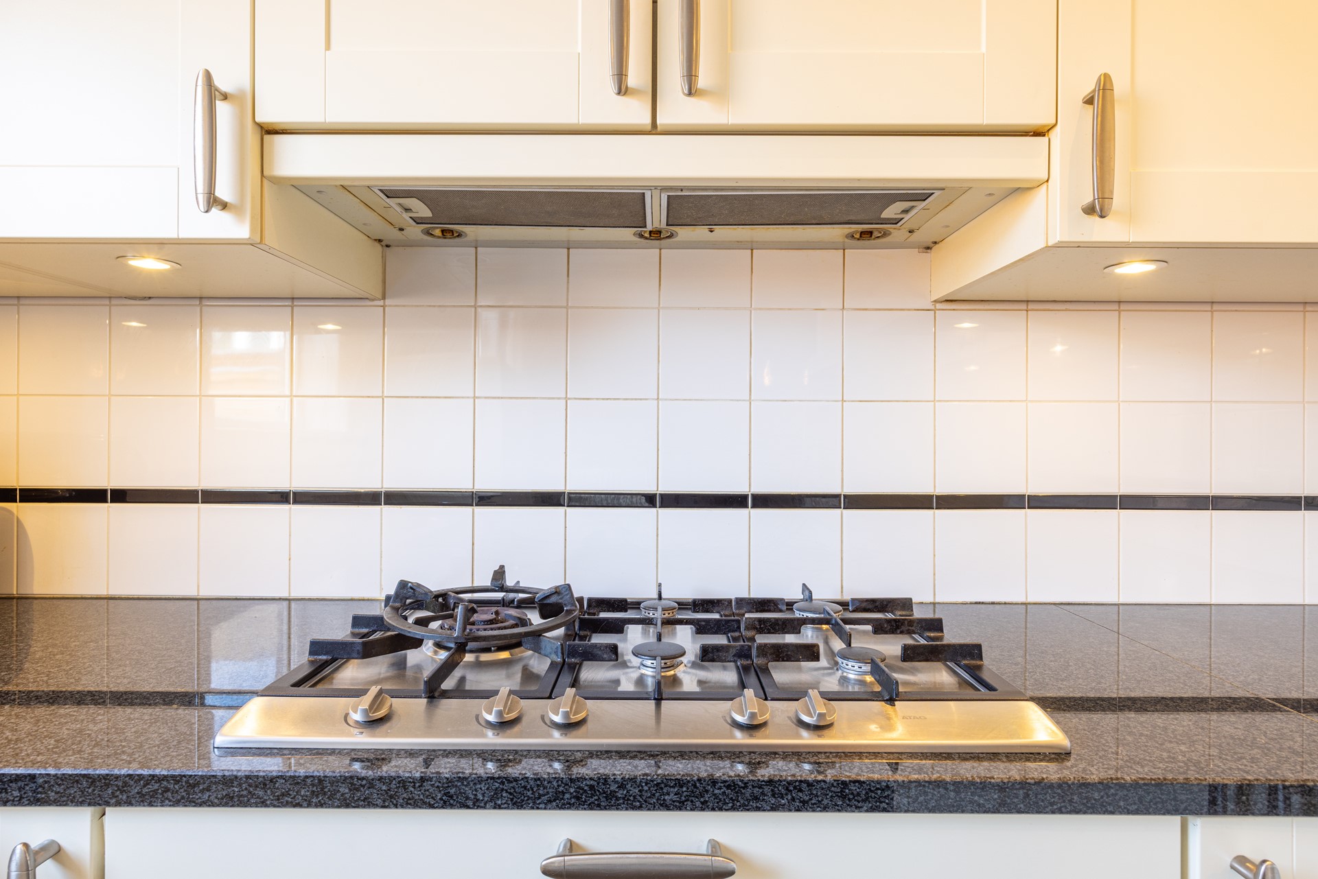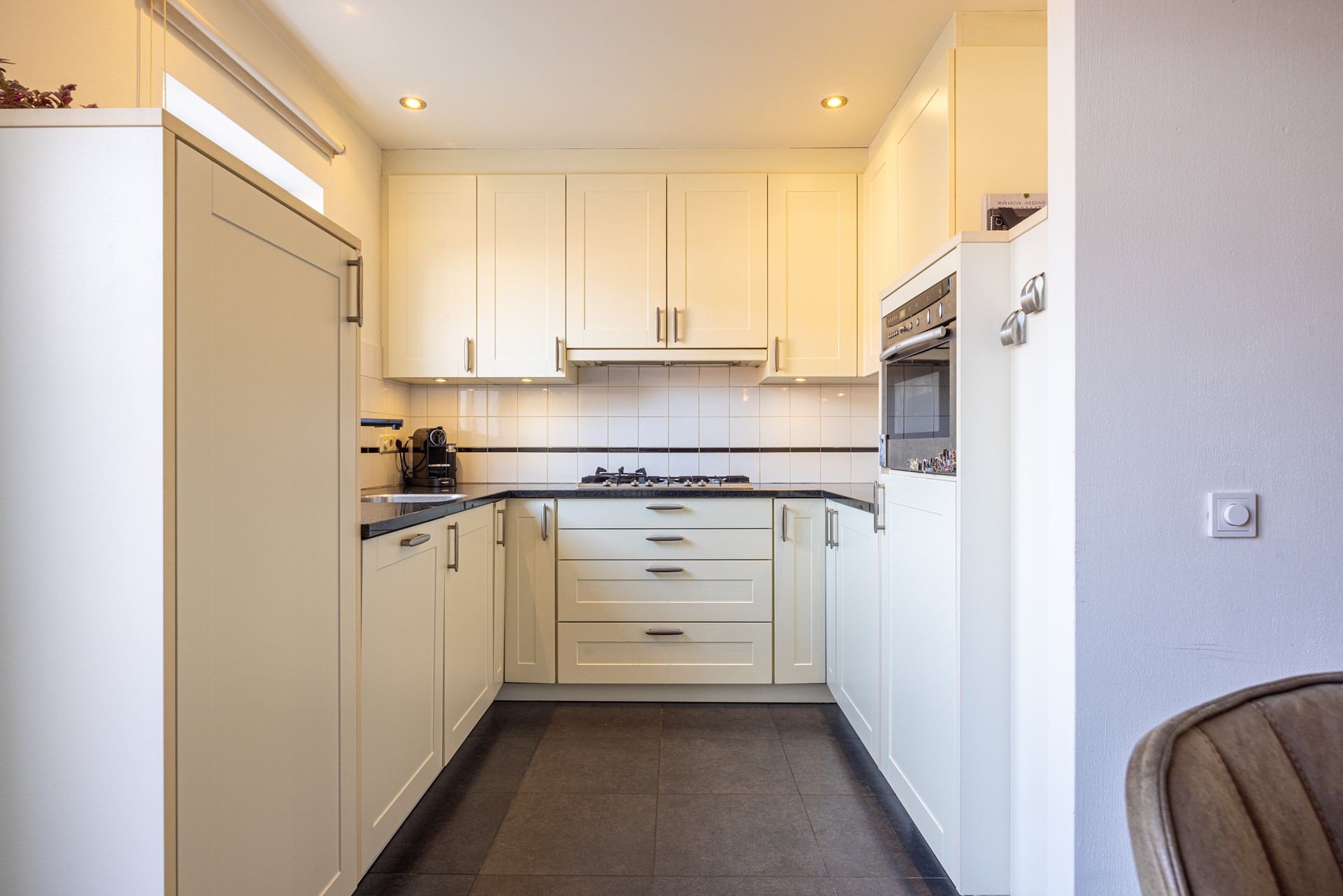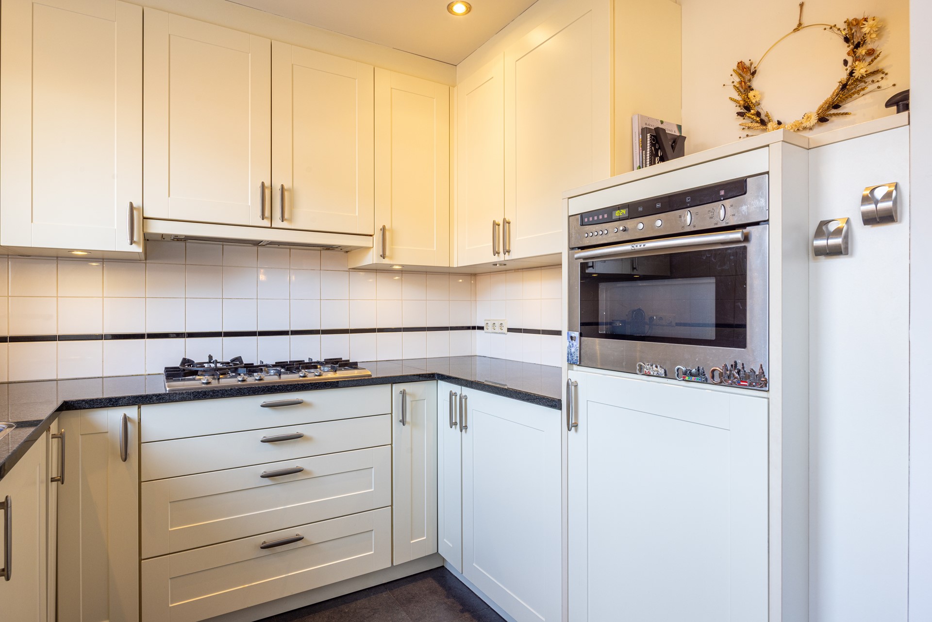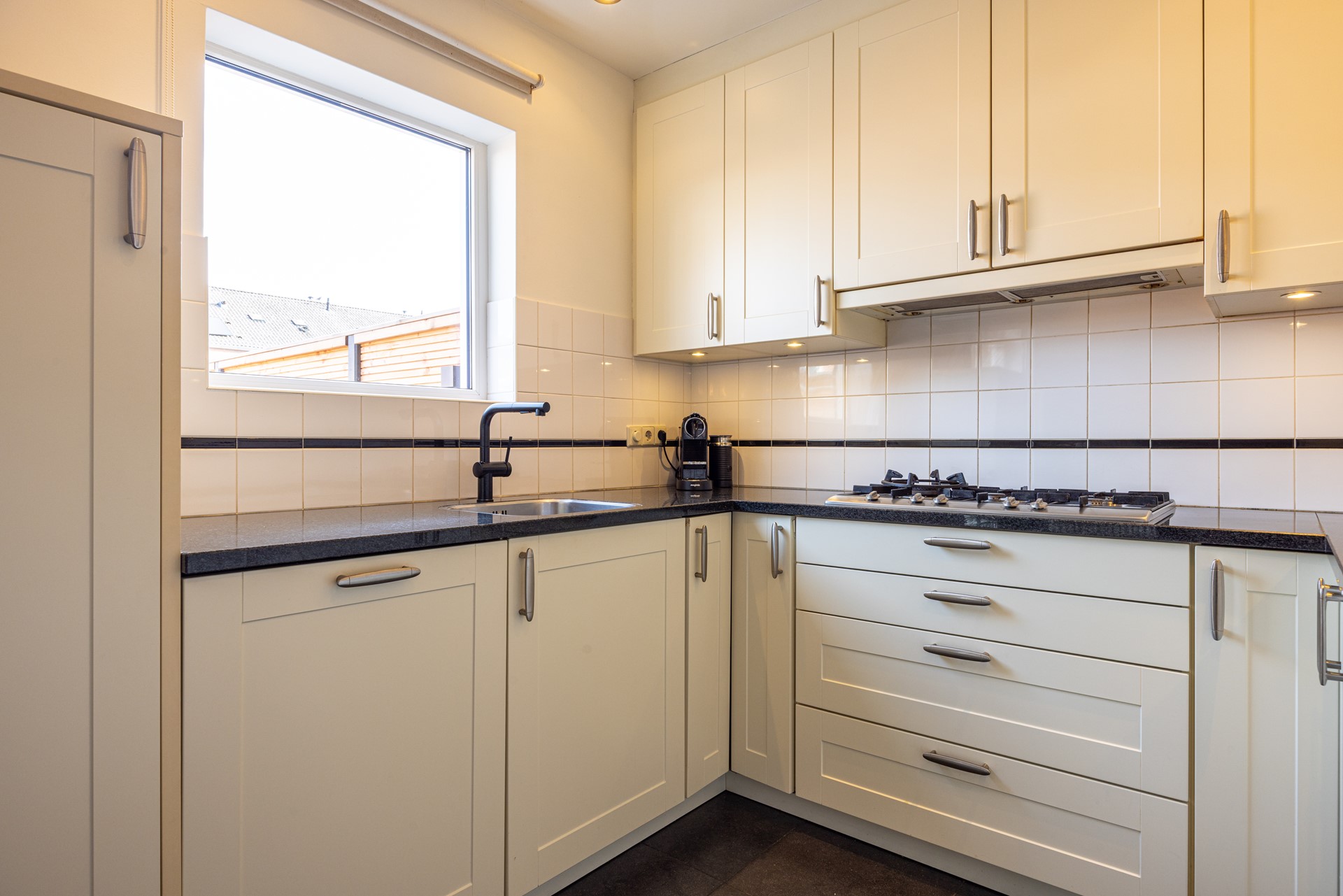 De open keuken sluit naadloos aan op de eetruimte en is uitgevoerd in een praktische U-opstelling. Hierdoor is er volop kast- en werkruimte beschikbaar. De lichte fronten en het donkere werkblad vormen een tijdloze combinatie. De keuken is compleet uitgerust met een 5-pits gaskookplaat, combi-oven, koelkast en vaatwasser. Dankzij de logische indeling en de open verbinding met de woonkamer blijf je tijdens het koken altijd in contact met familie of gasten. Een fijne plek waar koken en gezelligheid samenkomen.