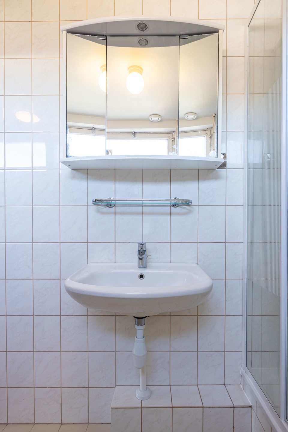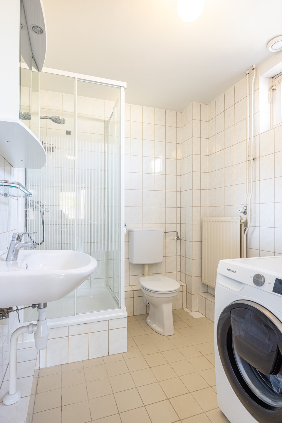 De badkamer is volledig betegeld en functioneel ingedeeld, met alles wat je nodig hebt op één plek. Er is een wastafel met spiegel en verlichting, een douche met glazen deur, een toilet, radiator en een aansluiting voor de wasmachine. Dankzij het raam is er natuurlijke ventilatie en daglicht, wat de ruimte fris en comfortabel houdt.