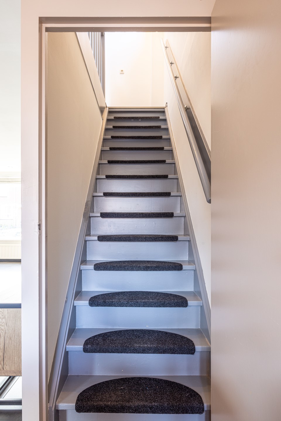 Via de overloop zijn drie slaapkamers en de badkamer bereikbaar. De overloop is netjes afgewerkt en vormt een lichte en overzichtelijke verbinding tussen de verschillende kamers.