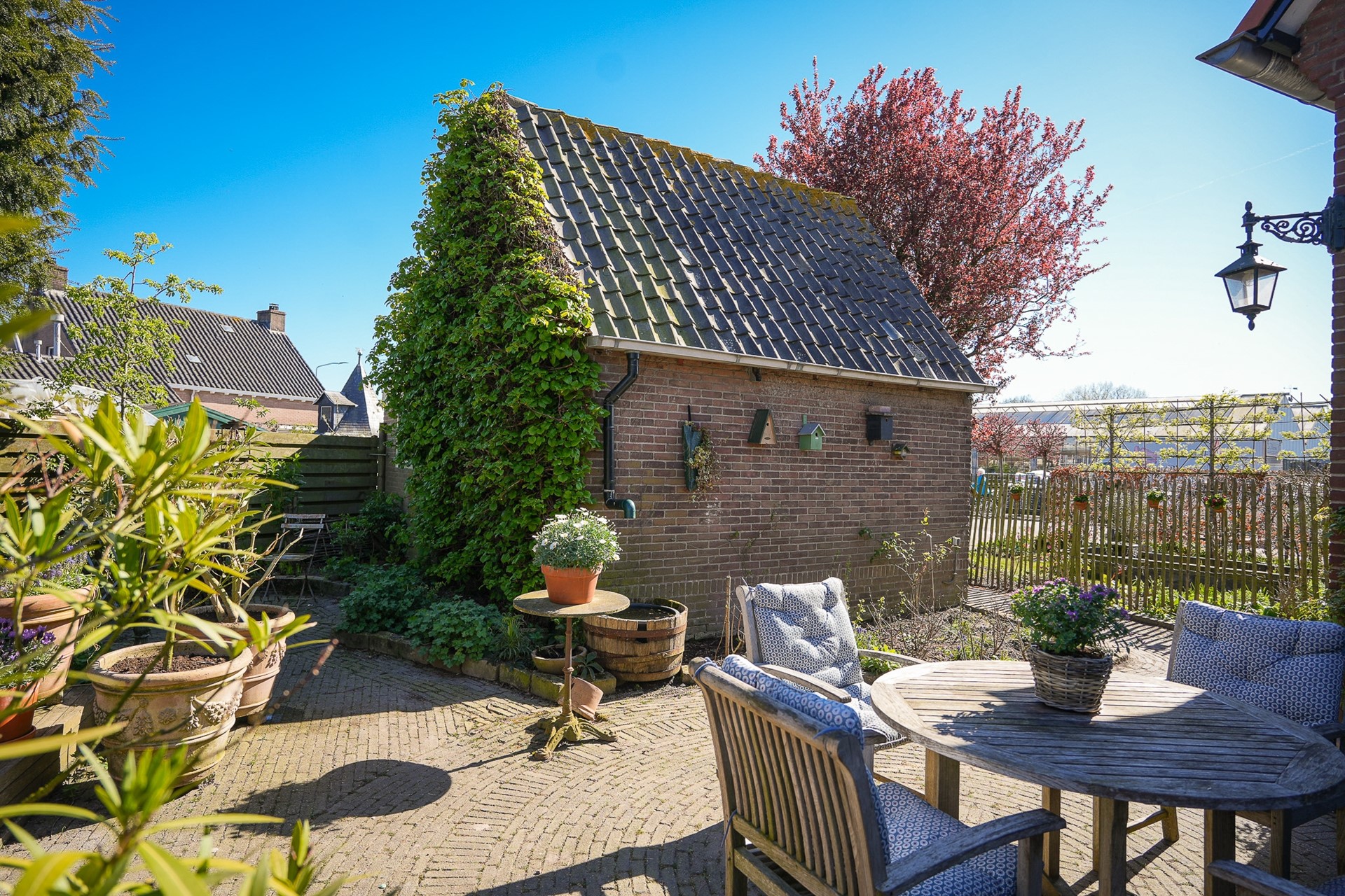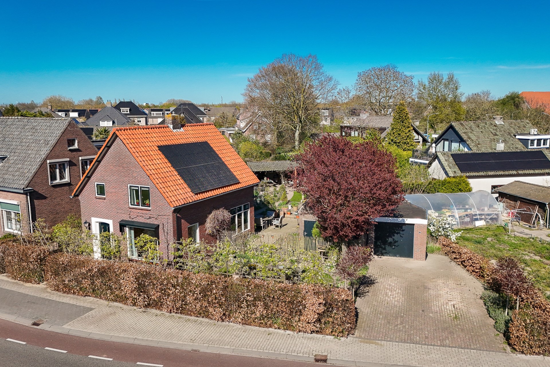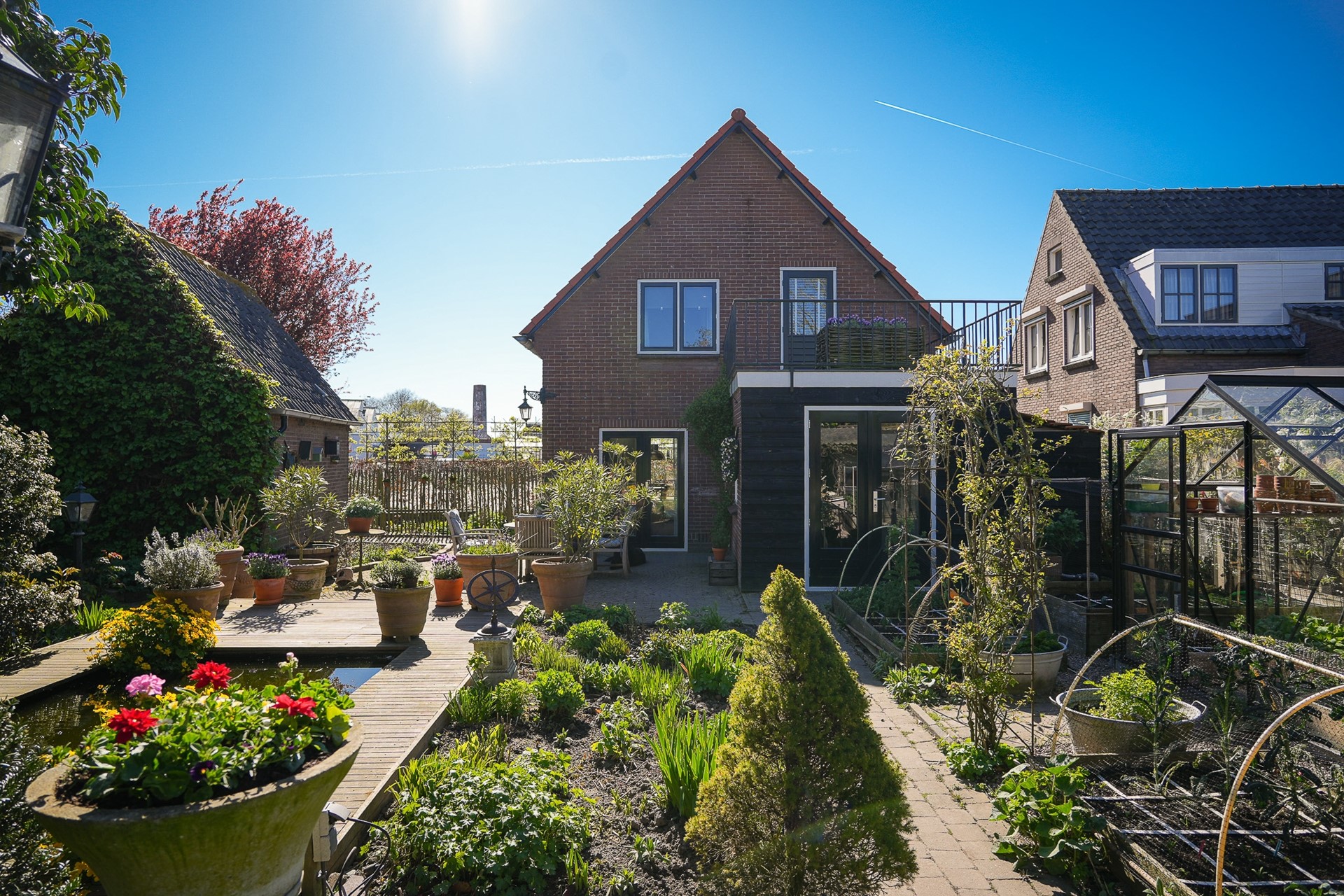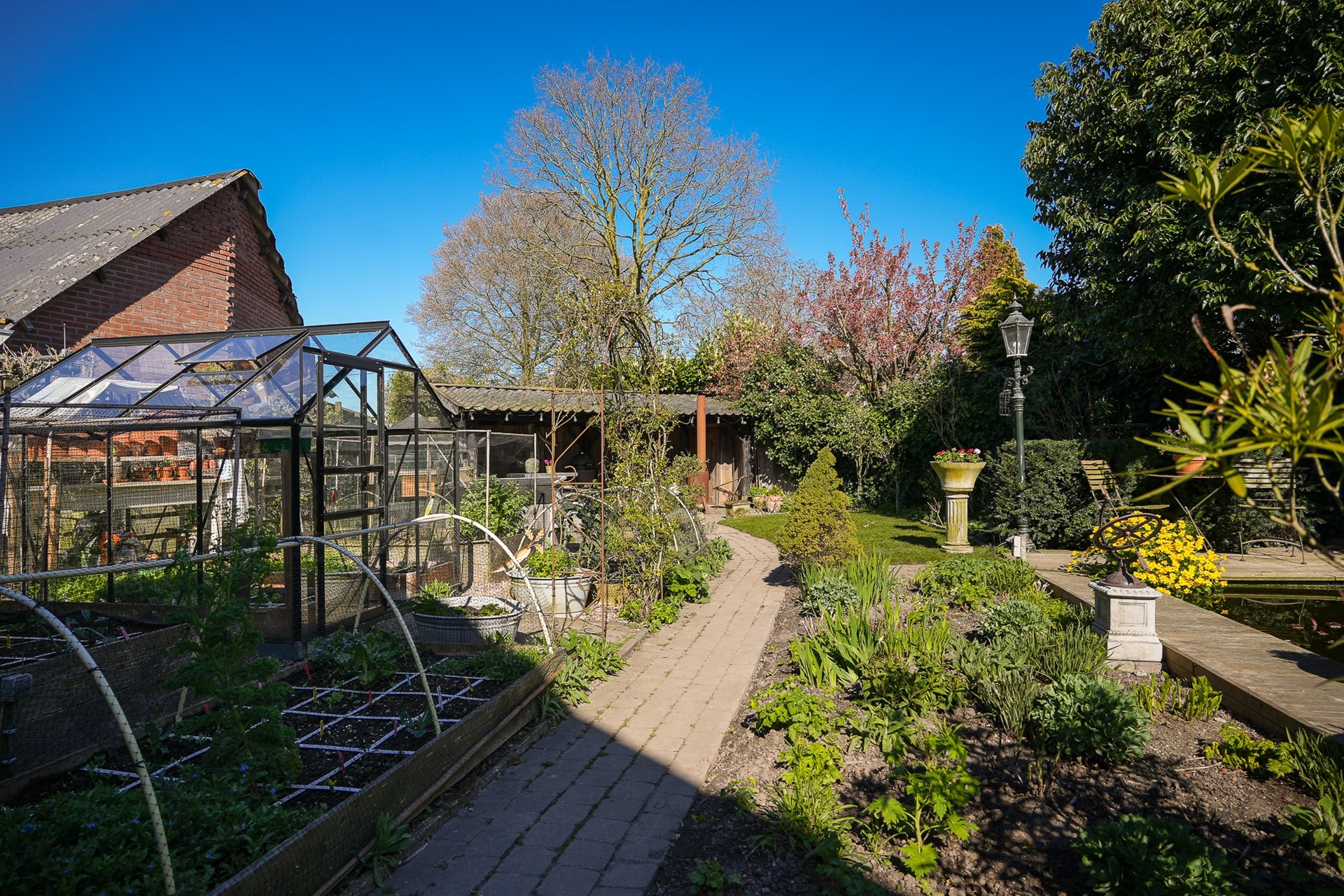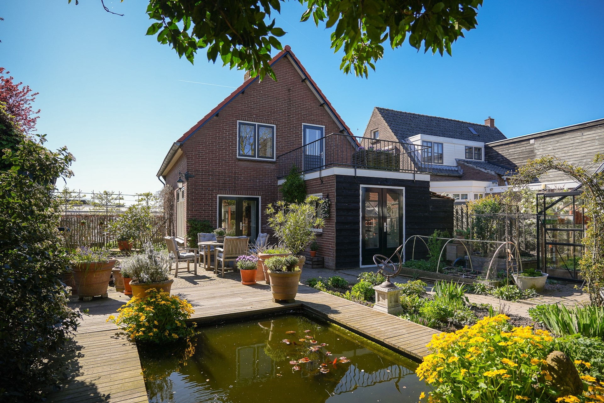 Ook buiten is het volop genieten: de tuin is speels aangelegd met meerdere terrassen, twee vijvers en een gezellige overkapping. Daarnaast beschikt het perceel over een vrijstaande schuur met aangebouwde garage, een kas en diverse moestuinbakken – ideaal voor wie graag buiten leeft.