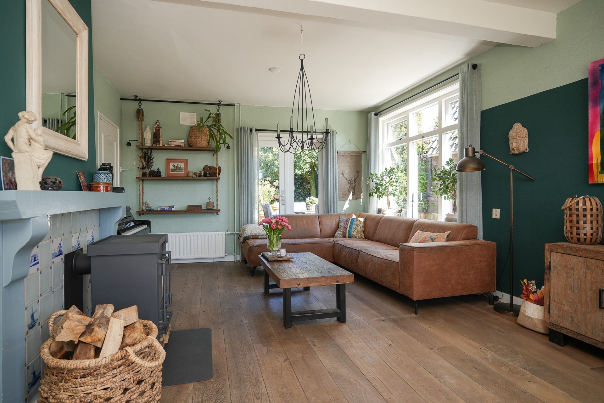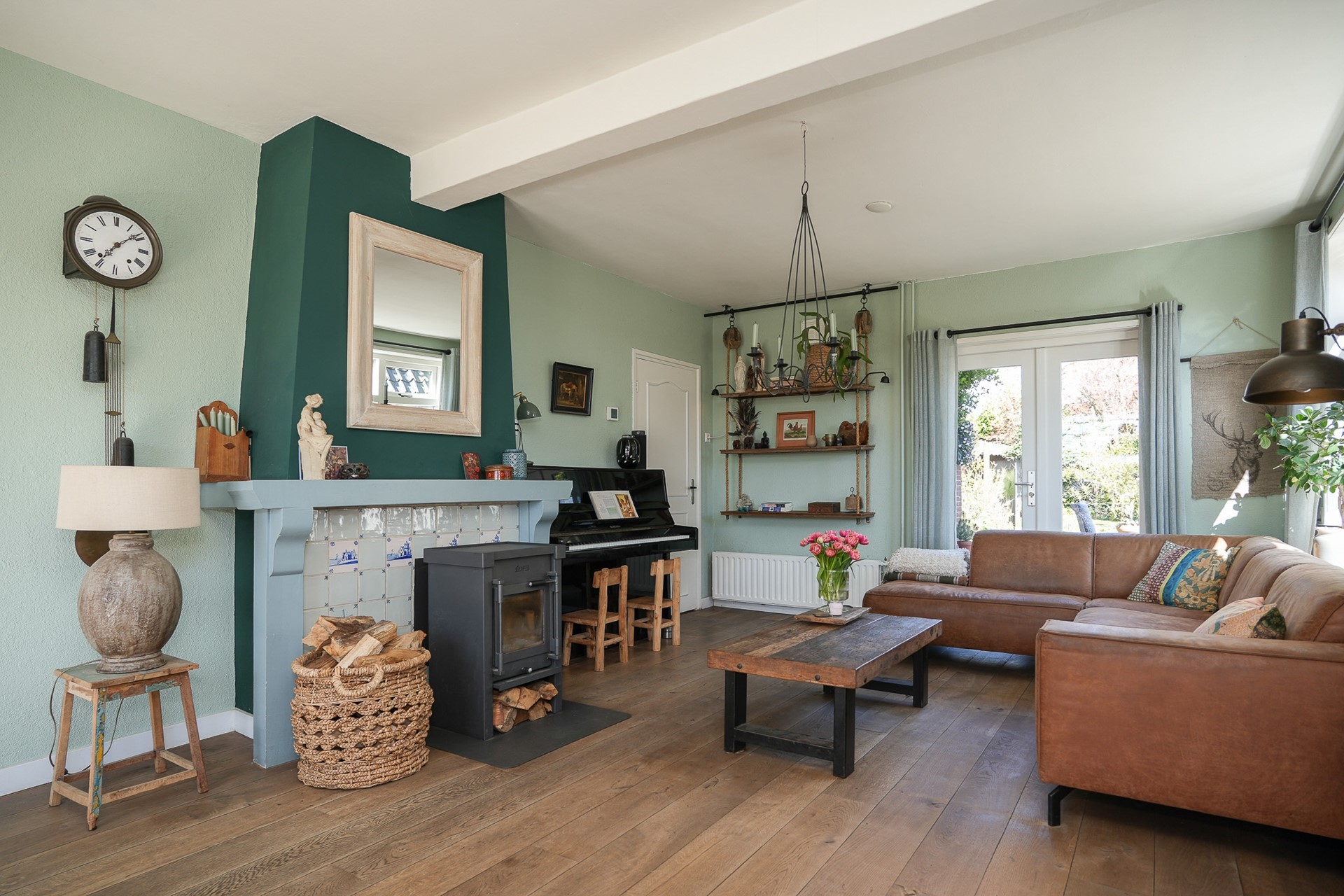 De woonkamer is een fijne, lichte leefruimte met ramen aan twee zijden en openslaande deuren aan de achterzijde naar de tuin. De schouw met houtkachel vormt een sfeervol middelpunt en maakt dit een plek waar je graag zit. Op de vloer liggen eikenhouten delen.