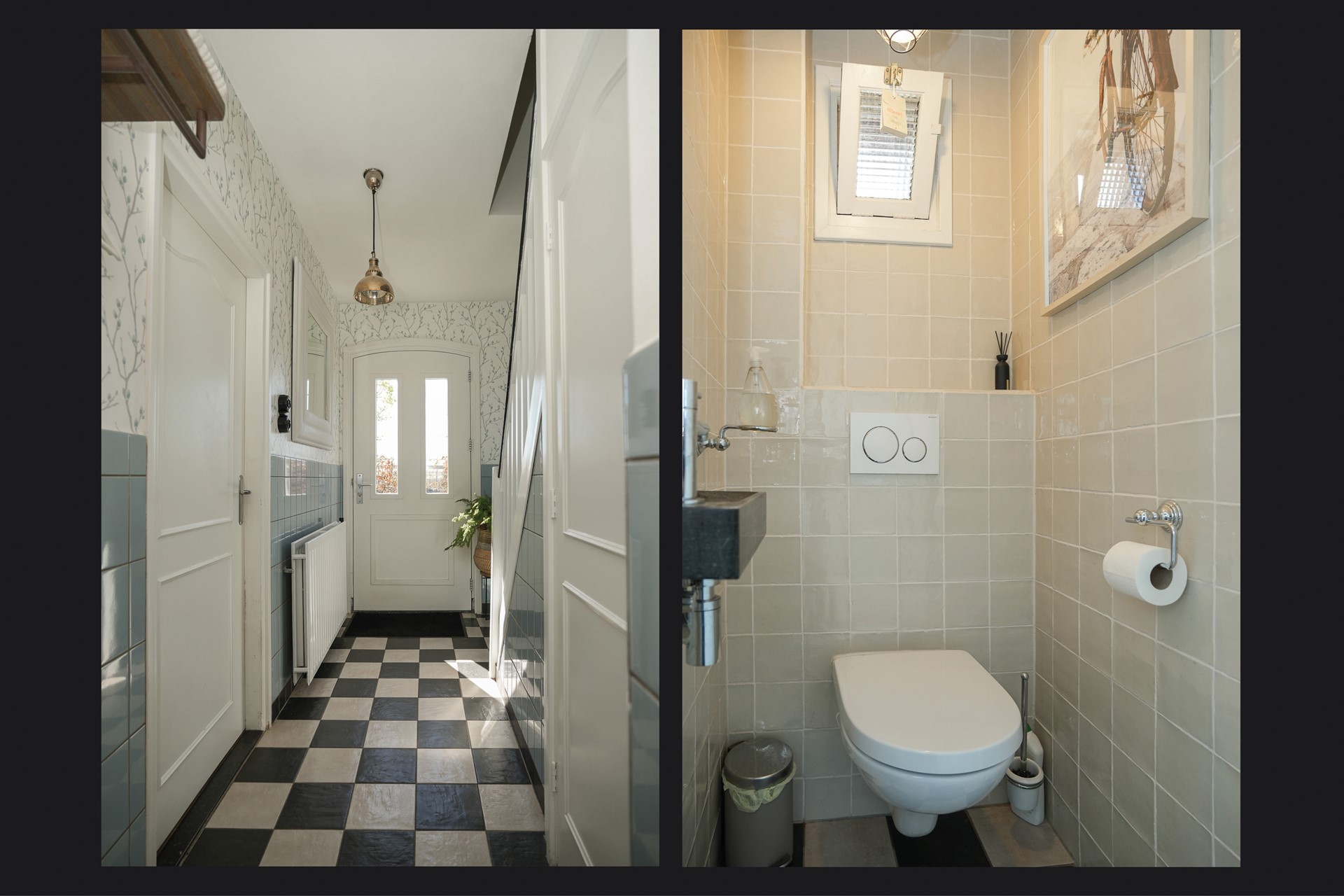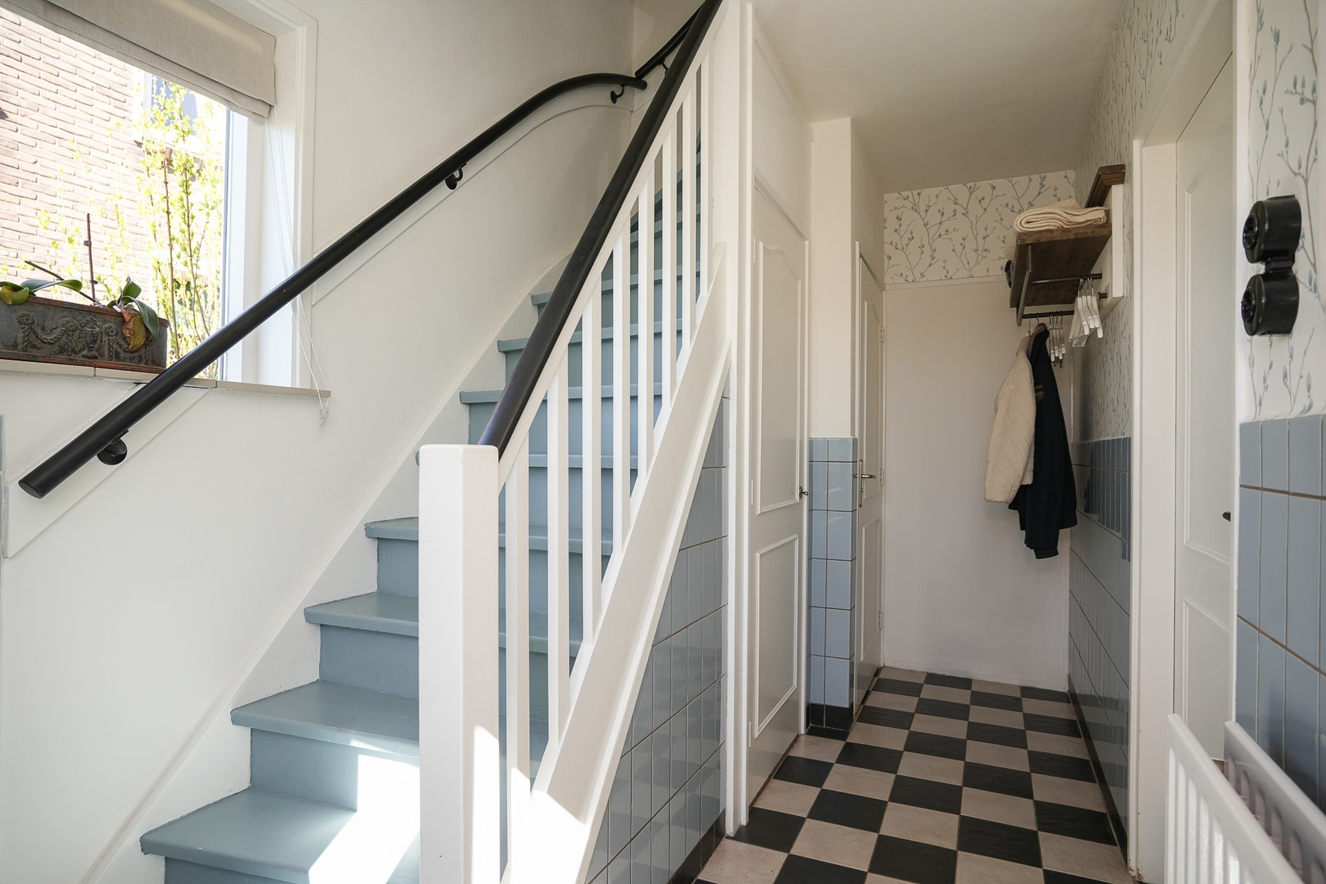 Je komt binnen in de hal, waar de zwart-witte tegelvloer direct een verzorgde eerste indruk geeft. Vanuit hier heb je toegang tot de trapkast, het toilet, de trapopgang en de woonkamer.