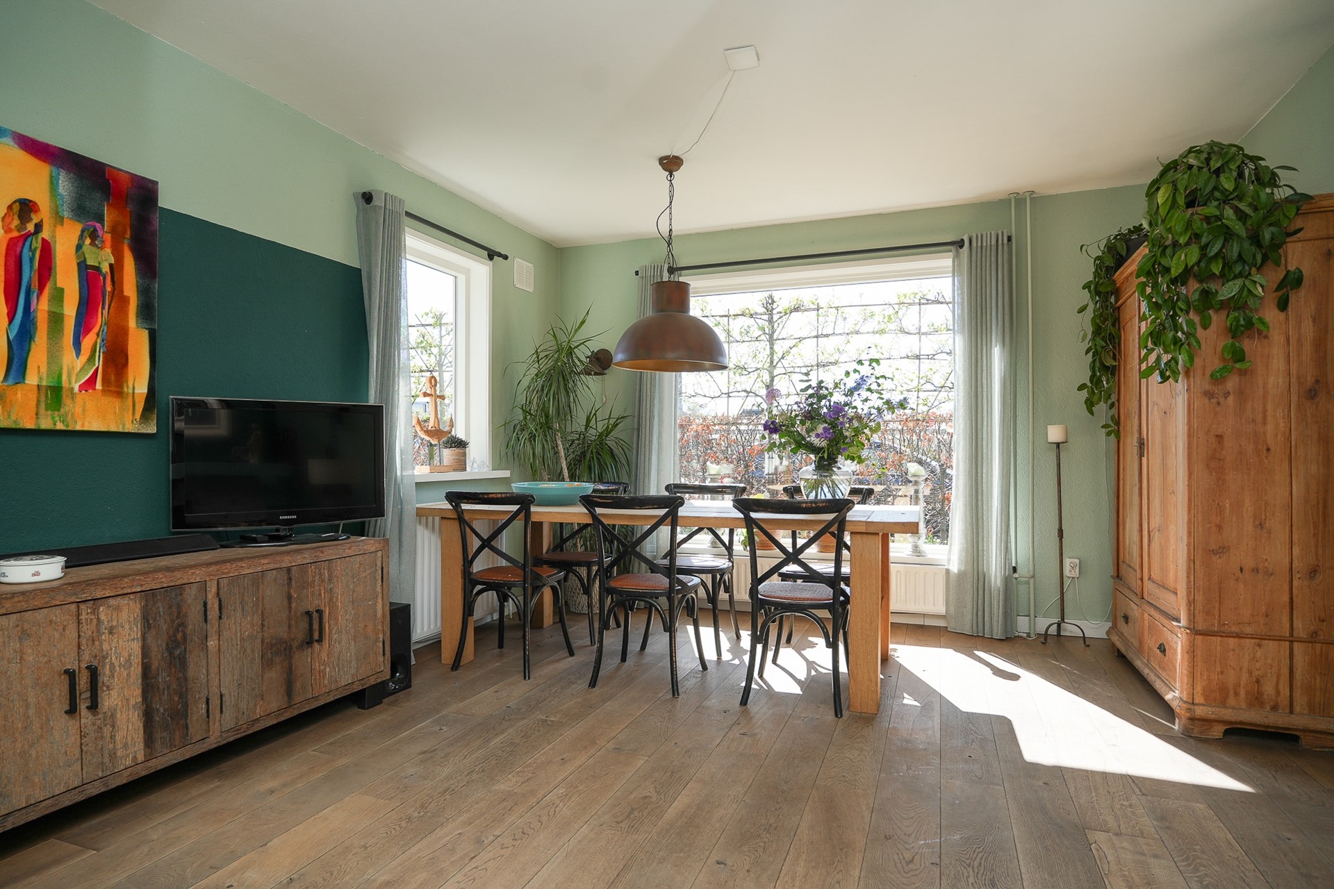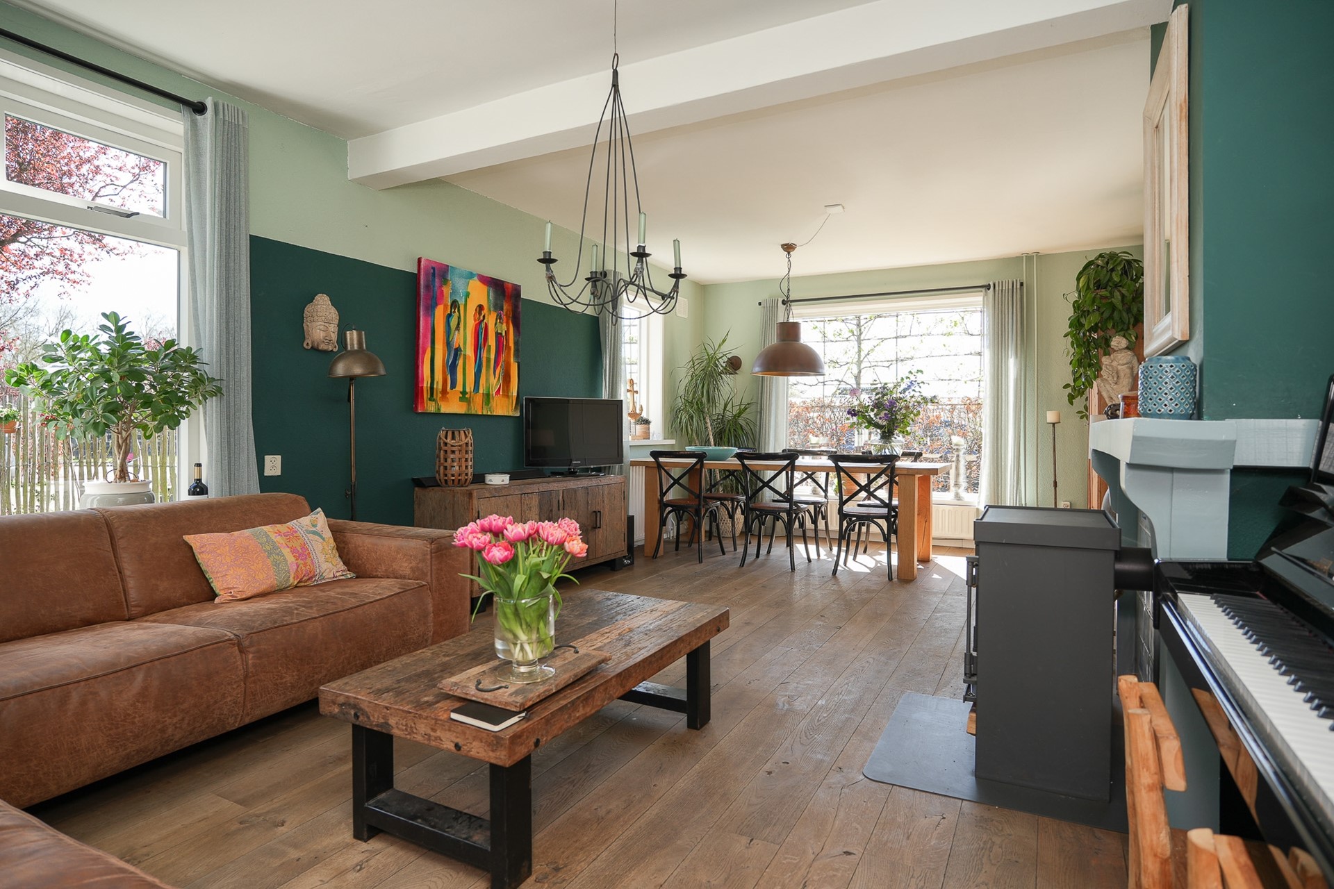 Aan de voorzijde van de ruimte staat de eethoek met zicht op het groen.