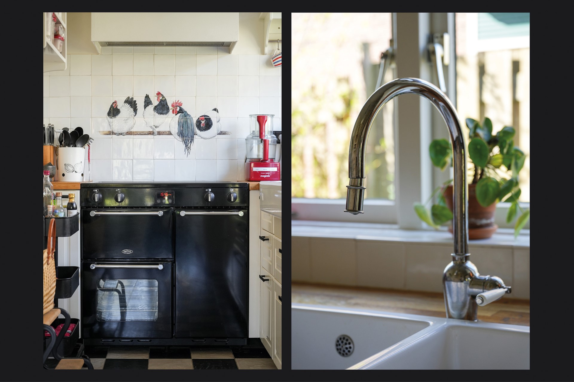 De sfeervolle keuken, die in 2022 vernieuwd is, is compleet ingericht. Een “Belling”-fornuis met inductie kookplaat, 3 ovens, inbouw afzuigkap en een dubbele porseleinen spoelbak met mengkraan. In het aangrenzende gedeelte met het gezellige zitje is over de hele wand een meubel geplaatst met inbouwapparatuur, waaronder een koelkast en magnetron, en veel praktische bergruimte.