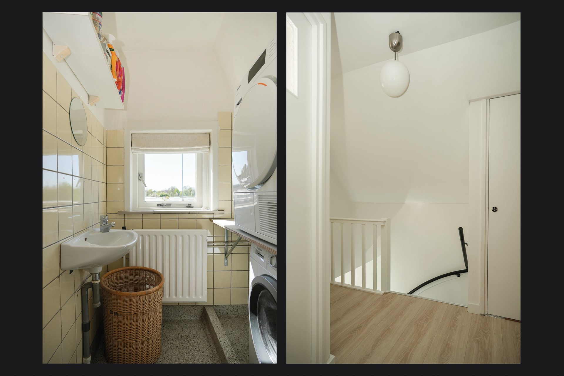 Daarnaast is er een aparte wasruimte op deze verdieping met originele granieten vloer. De wasmachine en droger zijn hier opgesteld en er is een wastafel met mengkraan aanwezig.