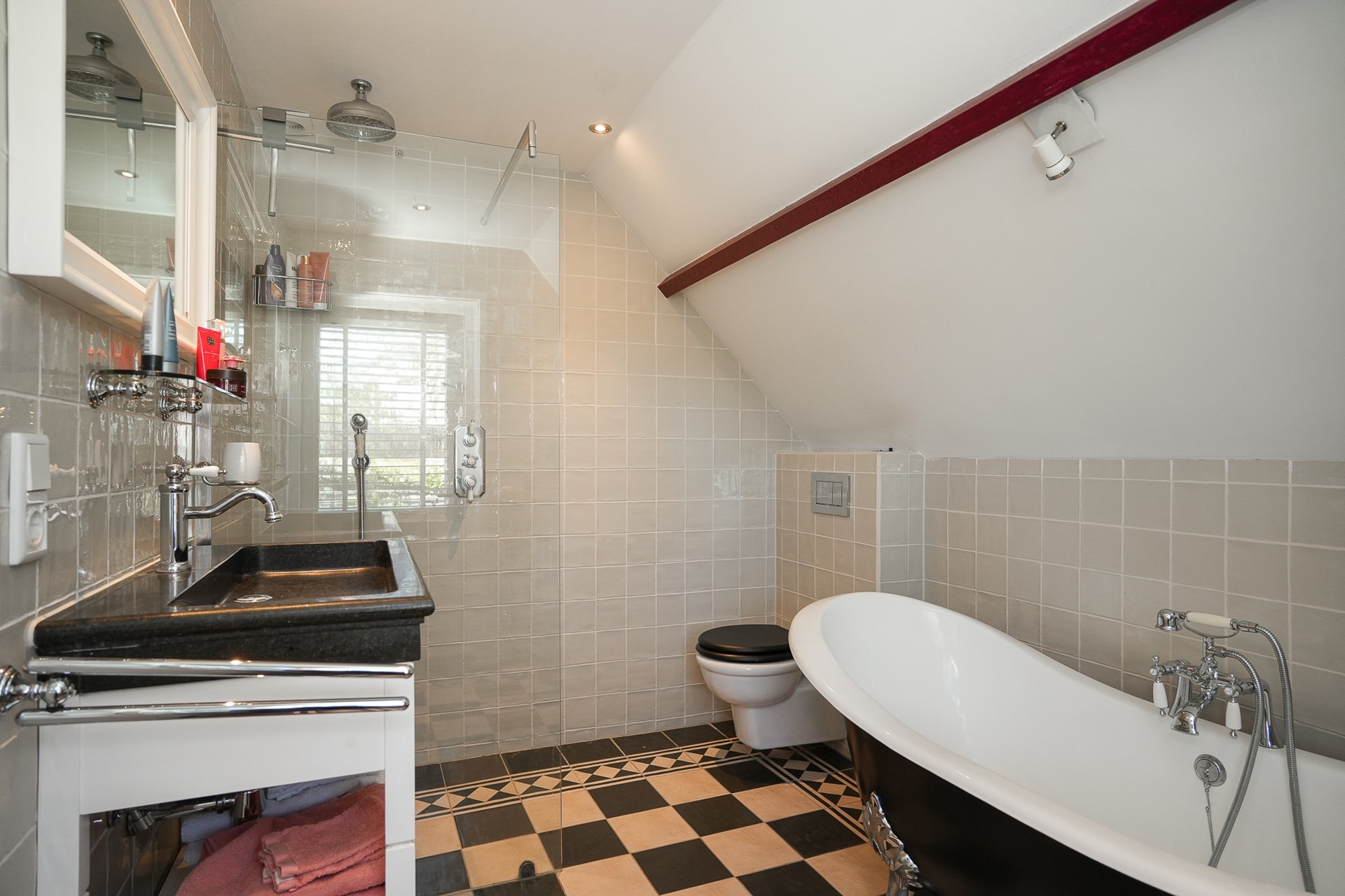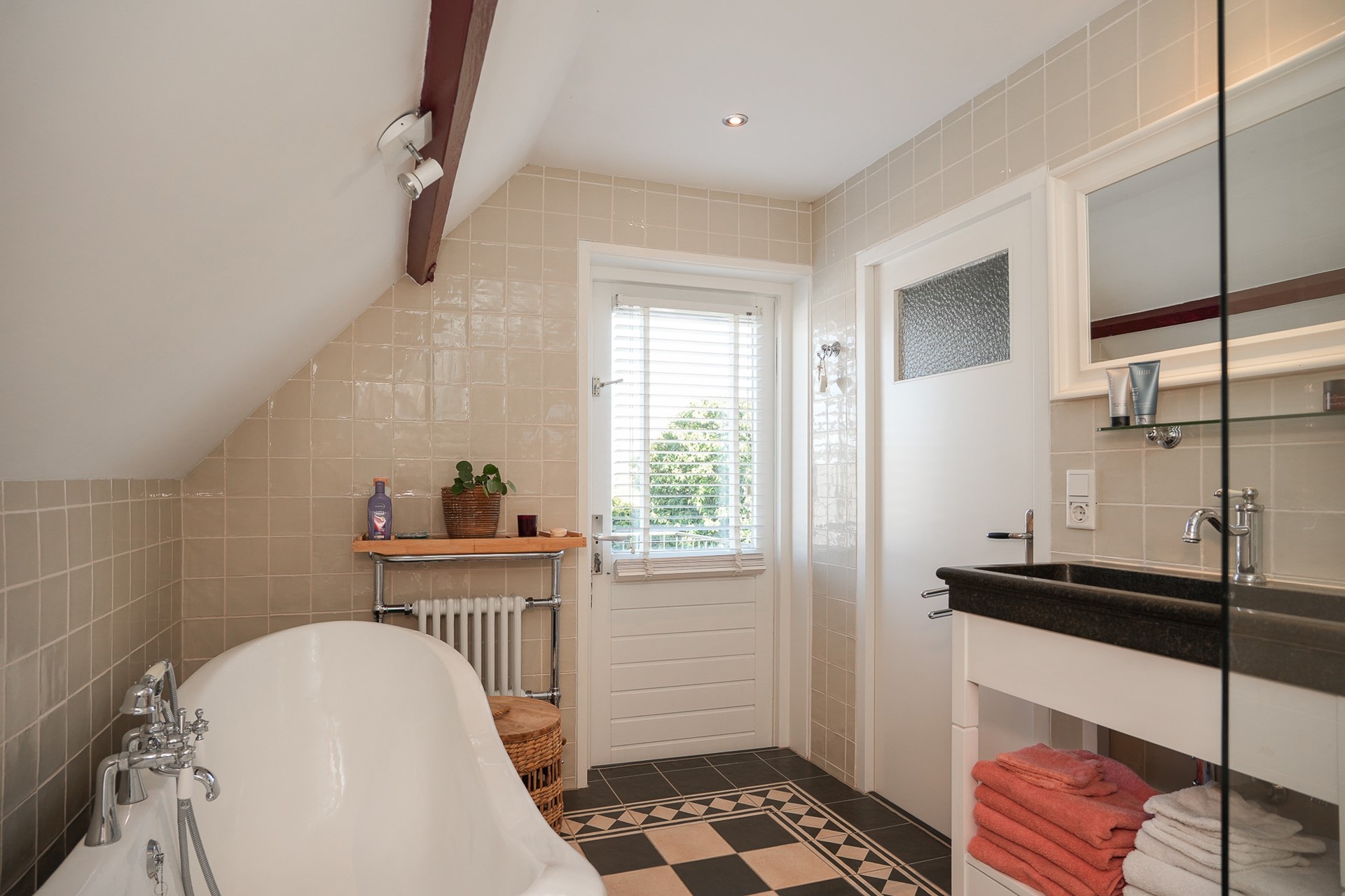 De badkamer (vernieuwd in 2016) is compleet ingericht met een bijzonder ligbad op pootjes, inloopdouche met glazen afscheiding, een wastafel van Belgisch hardsteen en een toilet. De combinatie van materialen en de indeling geven de ruimte een verzorgde uitstraling. Via een deur loop je zo tot het balkon op, een fijne plek om even buiten te zitten en met mooi uitzicht op de tuin.