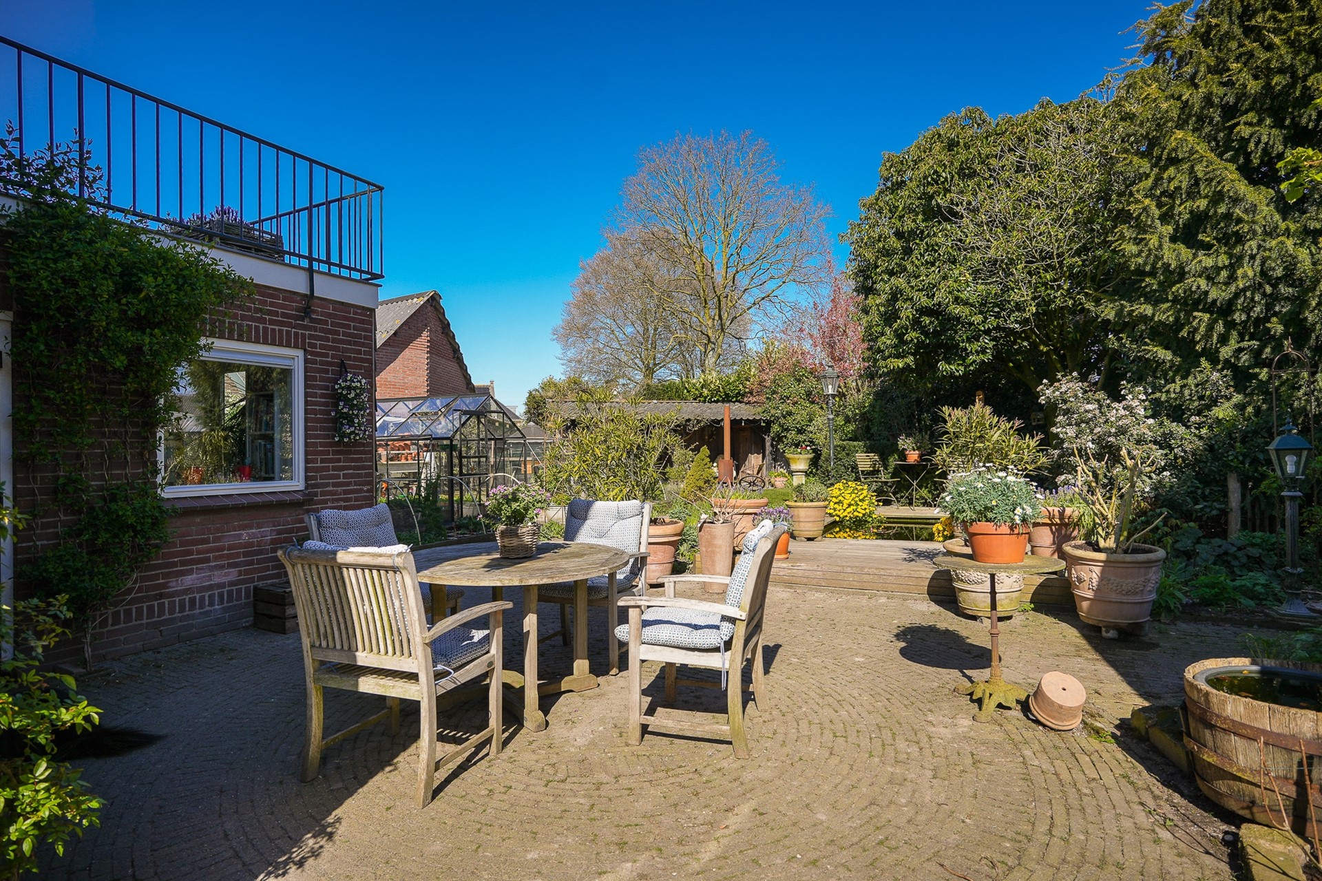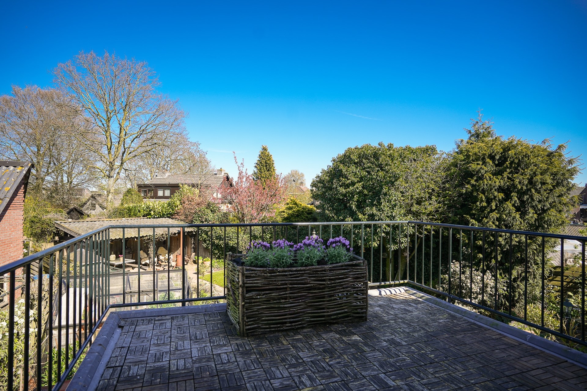 Het balkon is een fijne plek om even buiten te zitten met mooi uitzicht op de tuin.