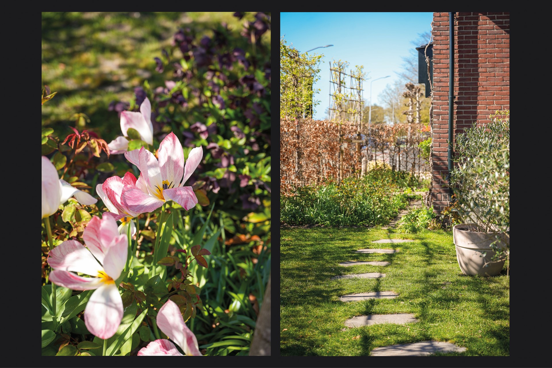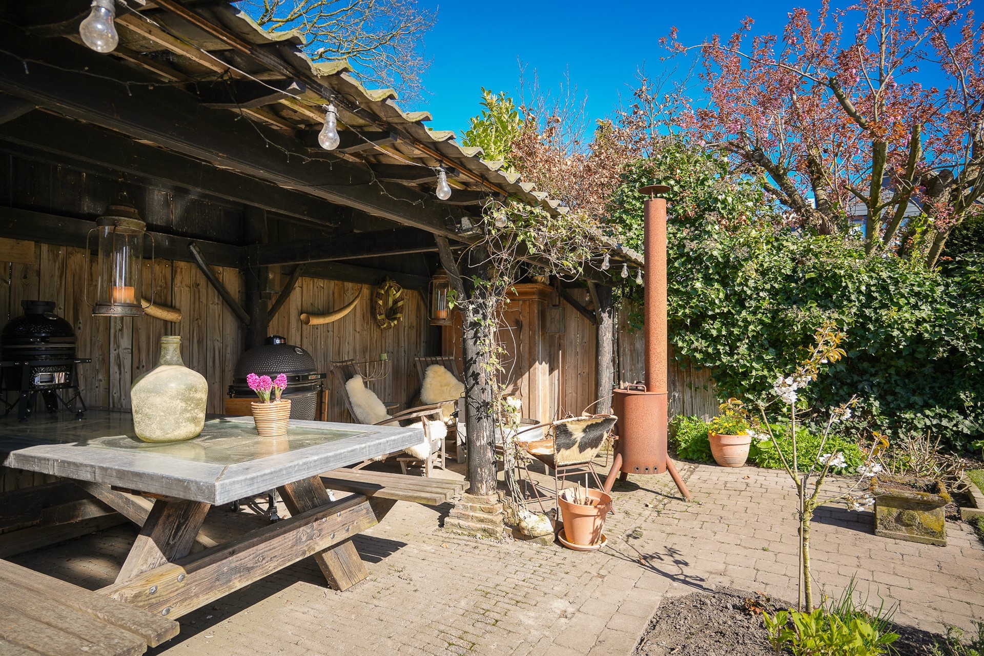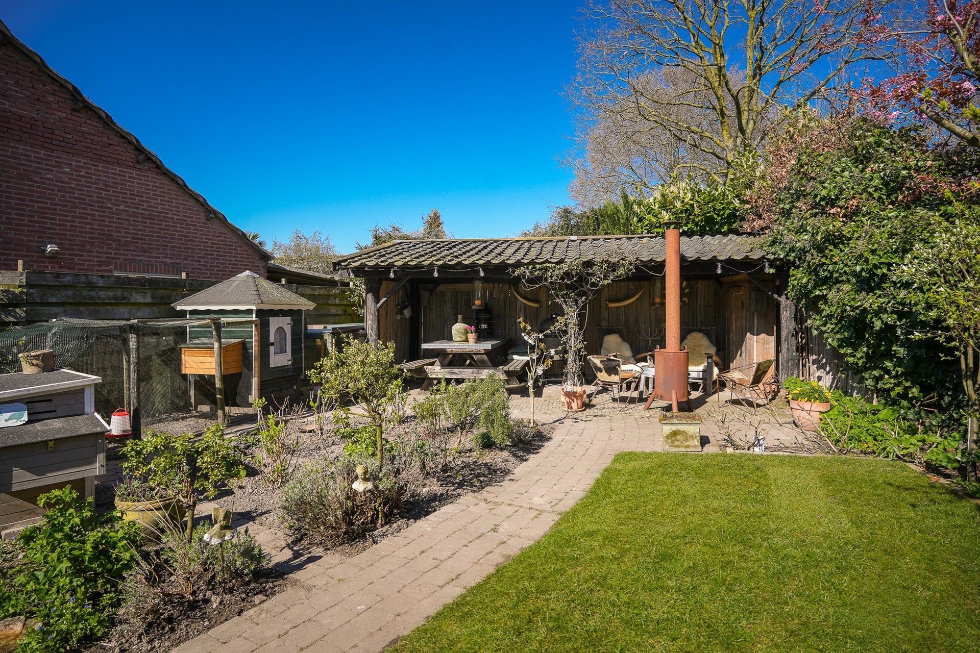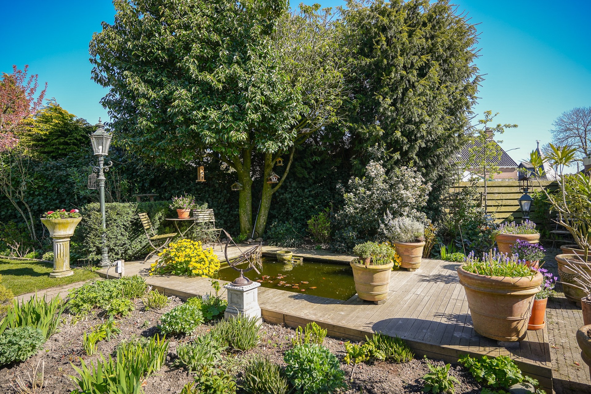 De tuin is verrassend groot en is gevarieerd aangelegd. Het biedt meerdere terrassen waaronder een vlonderterras, twee vijvers en een afwisseling van groen en bestrating. Achter in de tuin staat een sfeervolle overkapping. Dus er is altijd wel een fijne plek om te genieten met familie of vrienden… of je nu in de zon wilt zitten, juist wat beschutting zoekt of gezellig wilt bbq-en.
