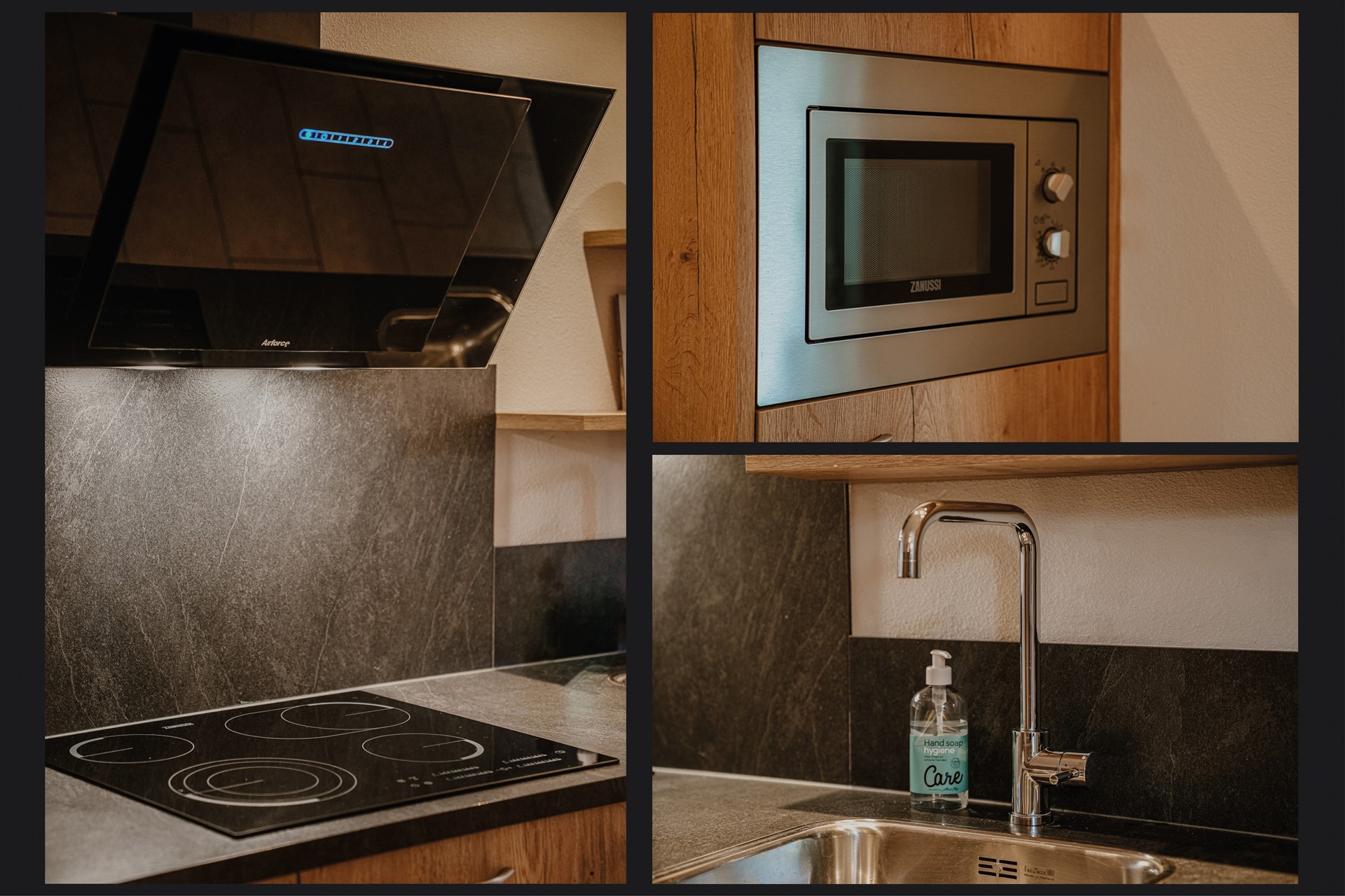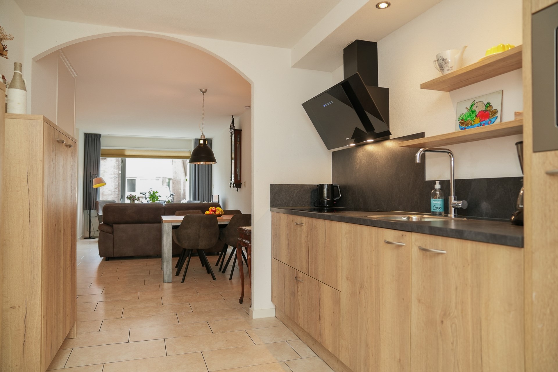 De keuken is in 2020 vernieuwd en uitgevoerd in een moderne, houtkleurige opstelling met donker werkblad. Er is inbouwapparatuur aanwezig, waaronder een keramische kookplaat, afzuigkap, combi-oven/magnetron en koelkast. Extra bergruimte is er in de beide wandkasten.