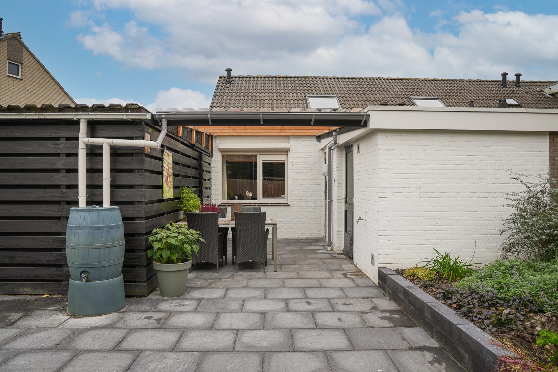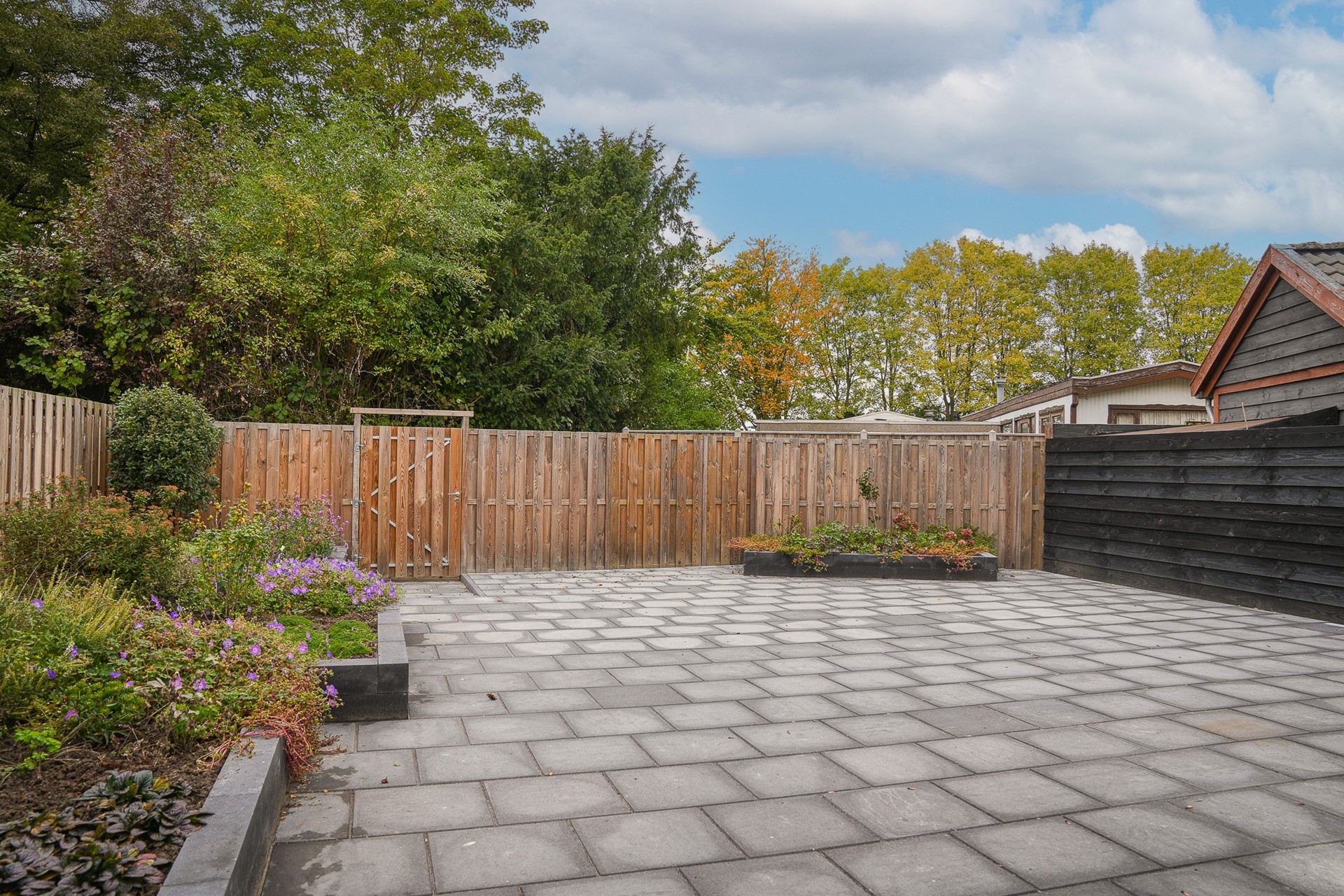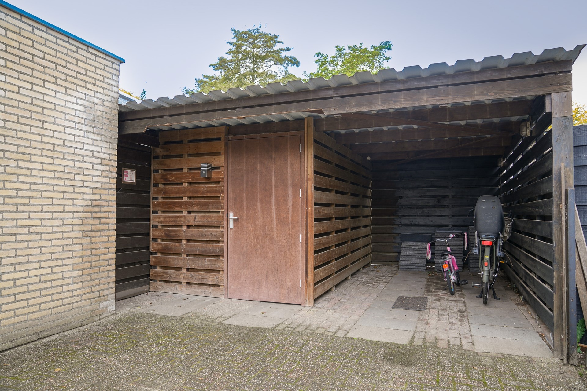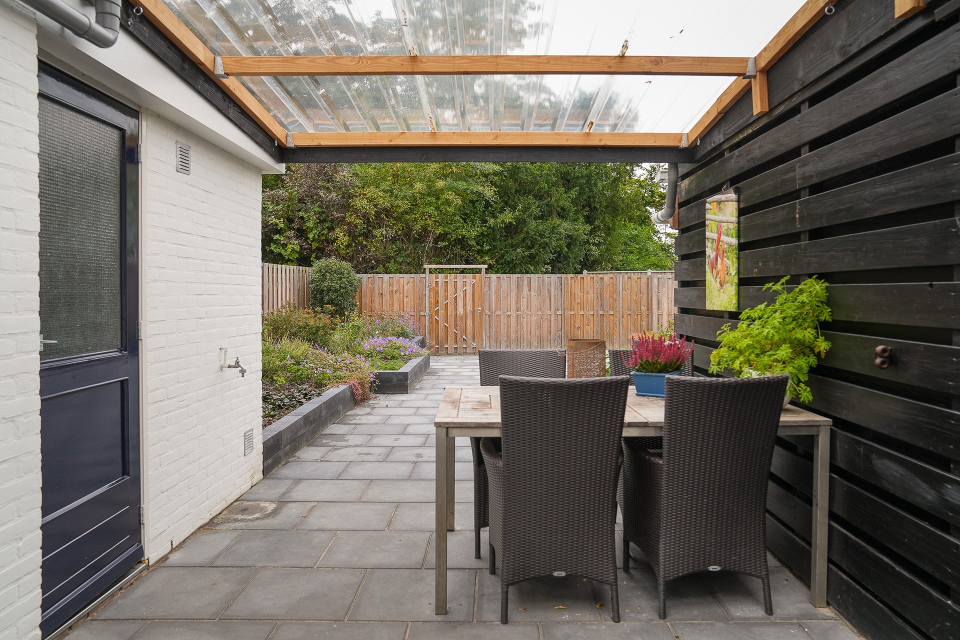Via een houten poort kom je in de achtertuin. Onder de overkapping zit je beschut en heerlijk privé. Aansluitend aan de woning is nog een berging beschikbaar.
