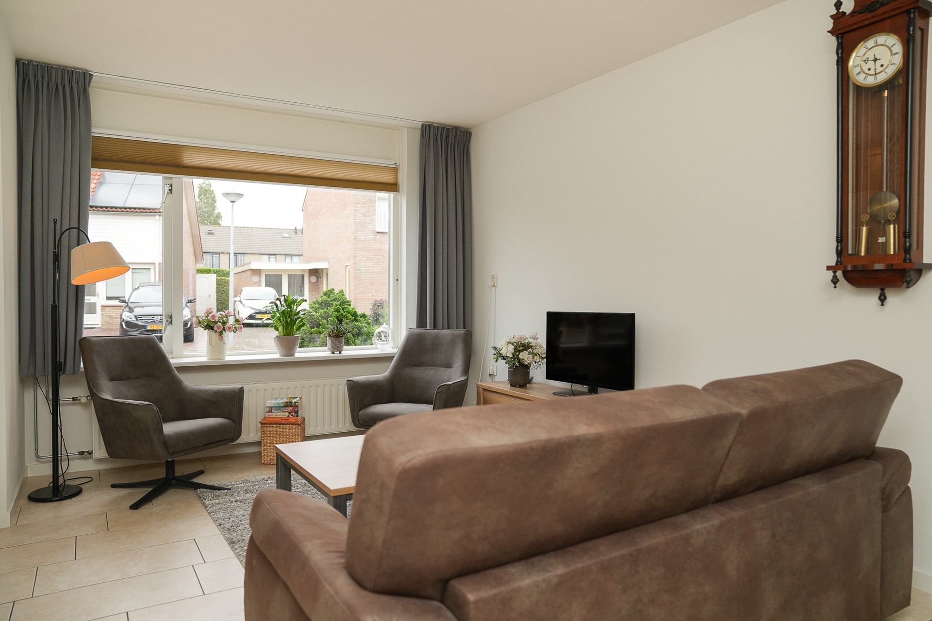 Aan de voorzijde ligt de gezellige woonkamer. Het grote raam zorgt voor een fijne lichtinval en een vrij uitzicht op de straat. Er is ruimte genoeg voor een eethoek tussen de zithoek en de keuken.
