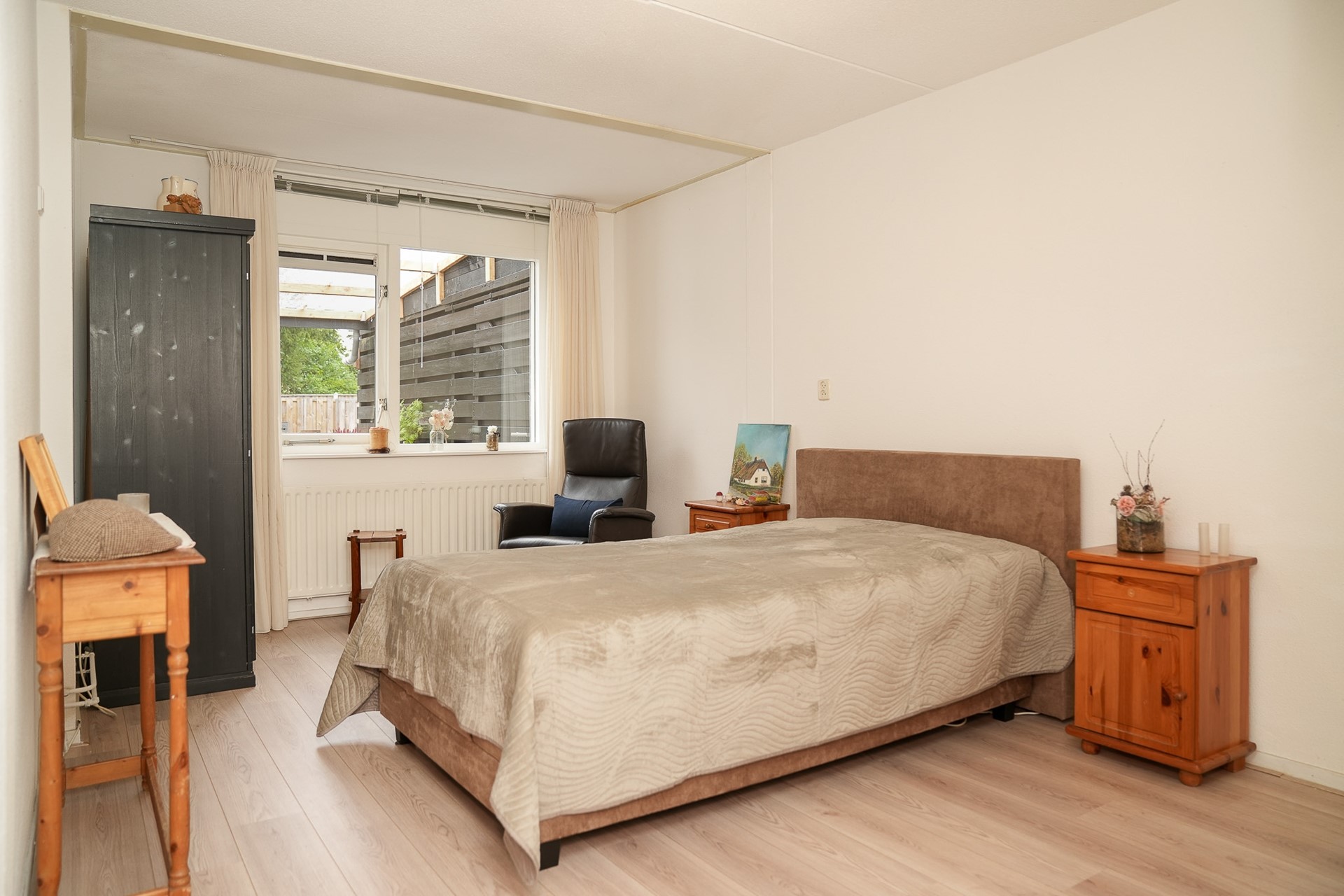 Aan de achterzijde van de woning bevindt zich een ruime slaapkamer op de begane grond. Deze kamer is rustig gelegen en kijkt uit op de tuin.