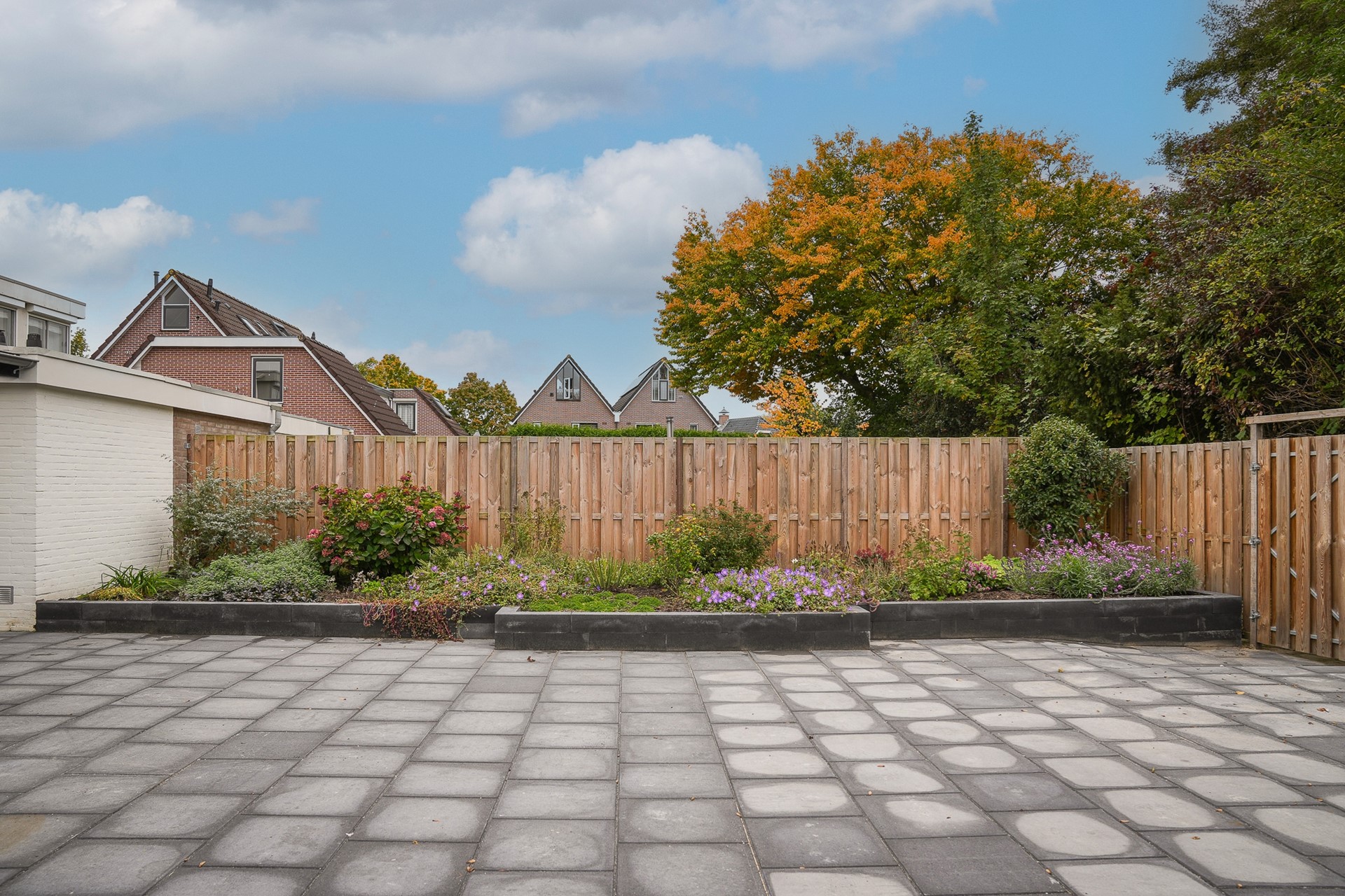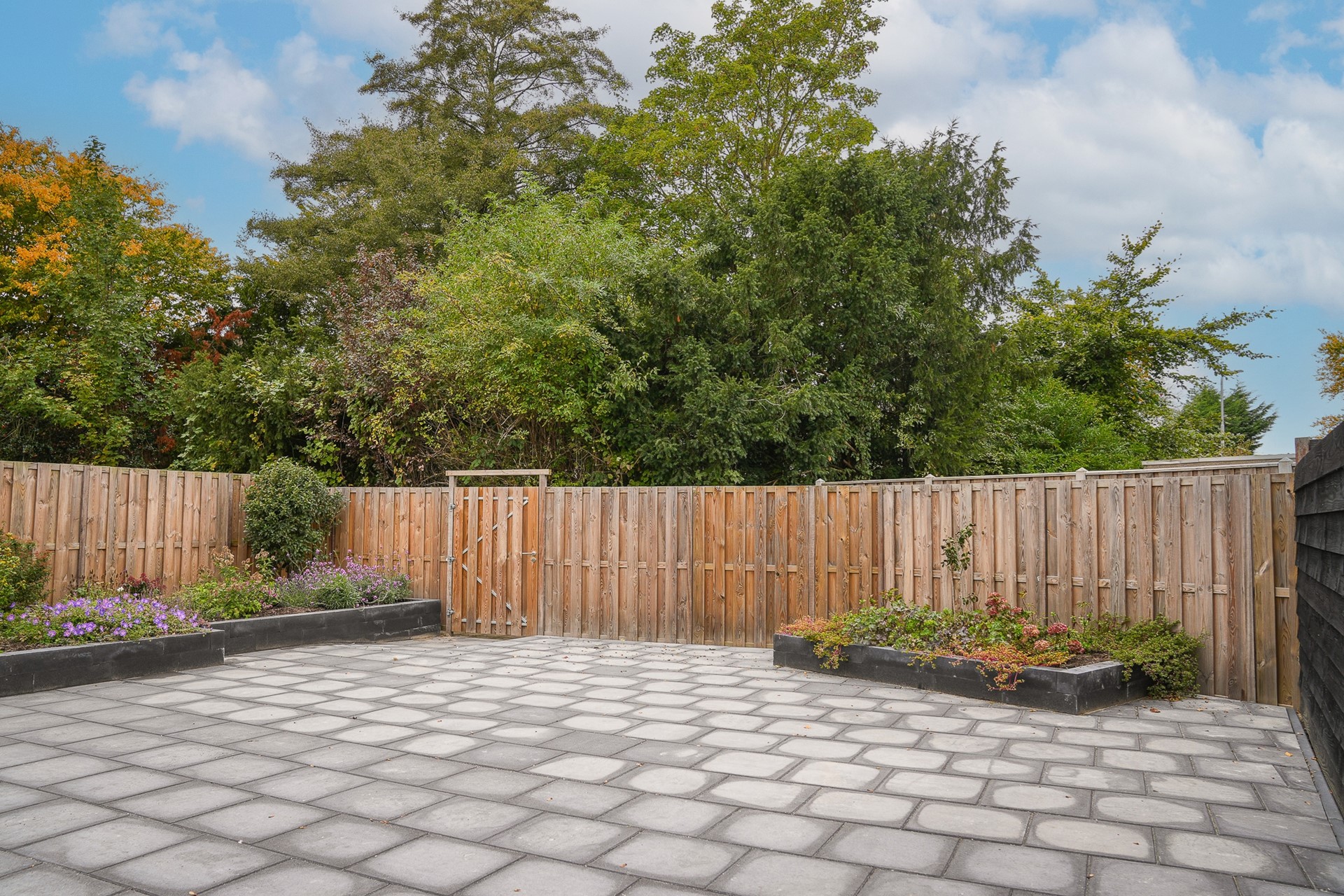 Daarachter strekt de achtertuin zich uit. De tuin is breed, diep en verzorgd aangelegd met grote tegels, verhoogde bloembakken en borders. Dankzij de ligging op het noordwesten is er in de middag en avond zon.