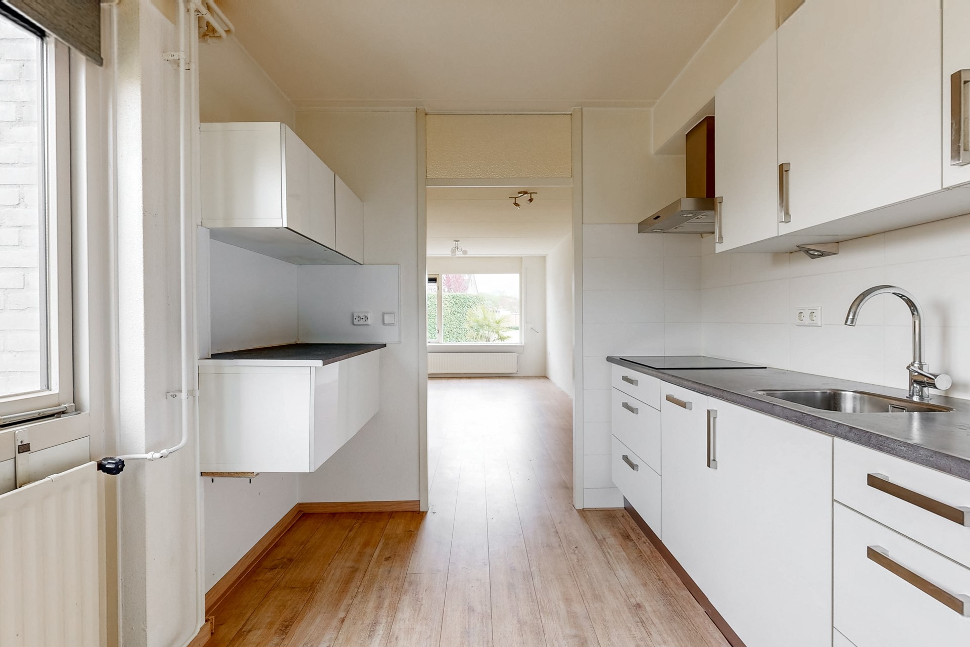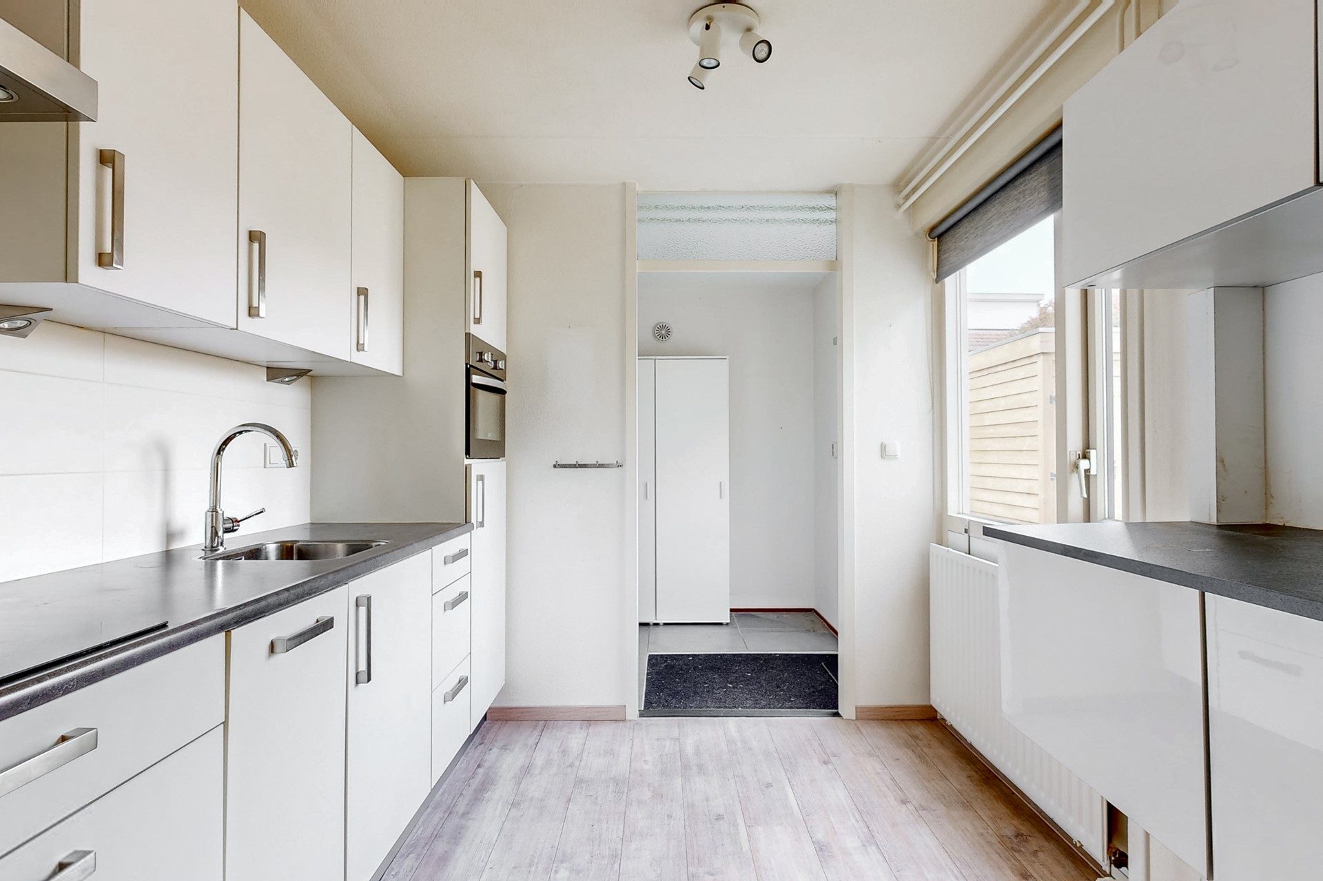 De keuken staat in halfopen verbinding met de woonkamer en is opgesteld in twee delen. Je beschikt over een spoelbak, inductiekookplaat, rvs afzuigschouw, combimagnetron, koelkast en veel kastruimte. Het raam zorgt voor een fijne lichtinval en biedt uitzicht op de tuin.