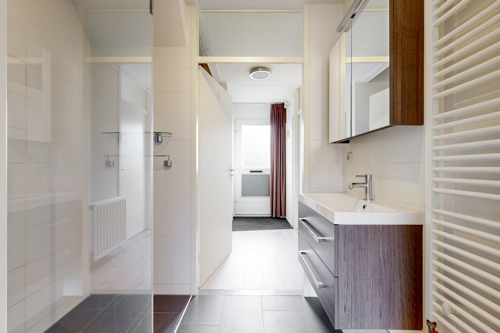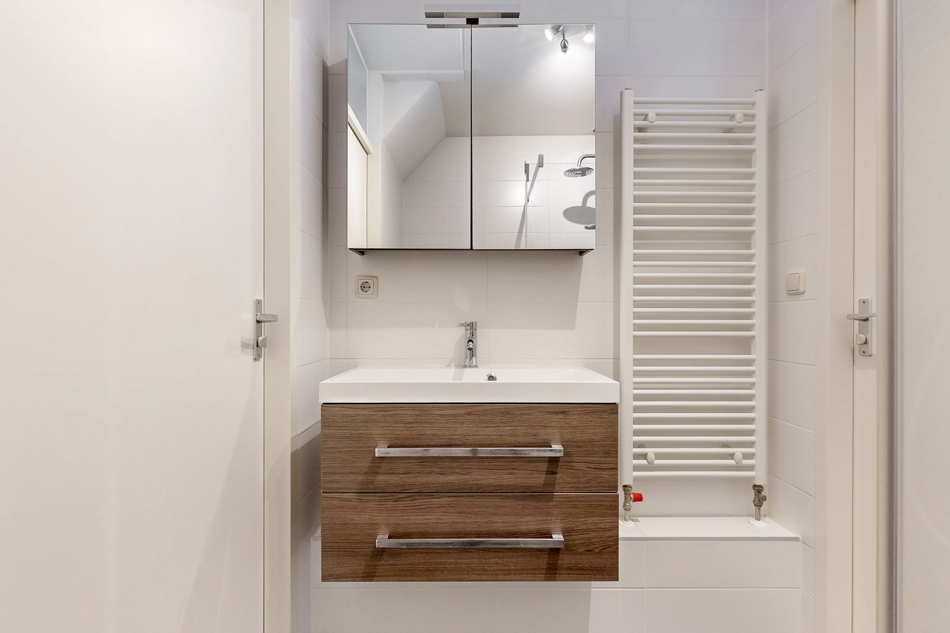De aangrenzende badkamer kenmerkt zich door moderne luxe en comfort. Spoel de drukte van de dag van je af in de ruime inloopdouche met glazen wand, regendouche en thermostaatkraan. Verfris jezelf aan het wastafelmeubel met ladekasten en spiegelkast met stopcontact en verlichting. Deze badkamer is zowel vanuit de ontvangsthal als vanuit de slaapkamer toegankelijk.