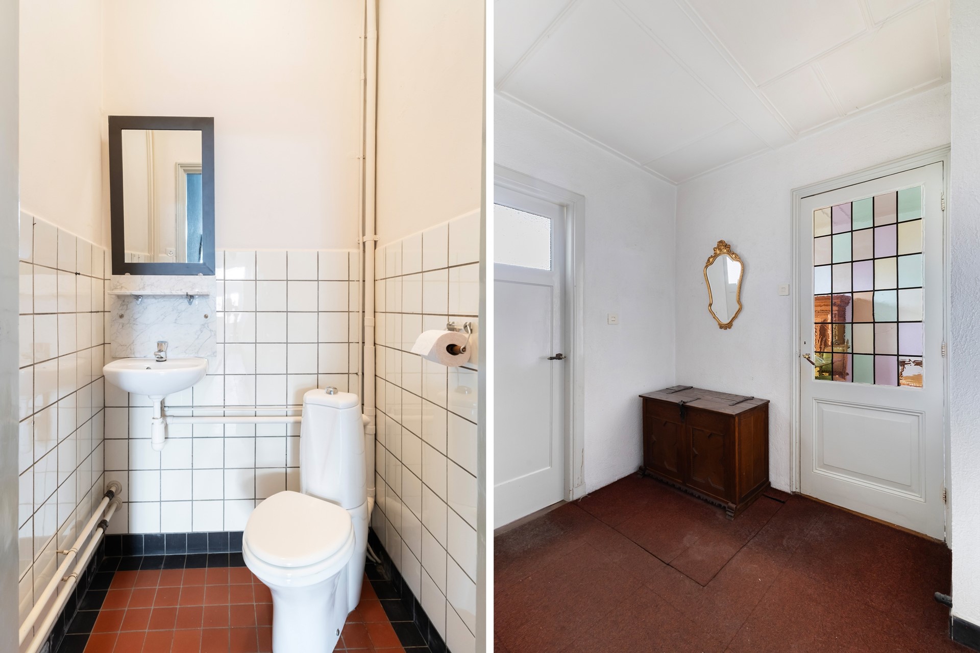Deze hal, voorzien van meterkast en trapopgang naar de eerste verdieping, is afgewerkt met de originele cementtegelvloer en paneeldeuren en biedt toegang tot de woonkamer, de tuingerichte eetkamer, de keuken en het deels betegelde toilet met staand closet en fonteintje. Vanuit de hal is tevens via een kelderluik de ruime kelder met voldoende stahoogte bereikbaar.