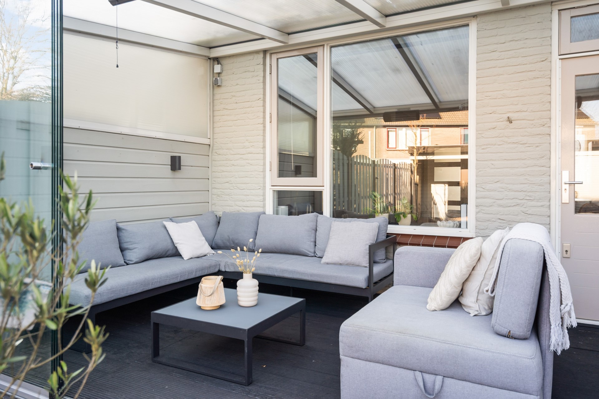 De woning is aan de achterzijde voorzien van een veranda met kunststof dakplaten en een glazen schuifwand. De veranda is uitgerust met sfeerverlichting, elektrische terrasverwarmers en afgewerkt met composiet vlonderplanken.