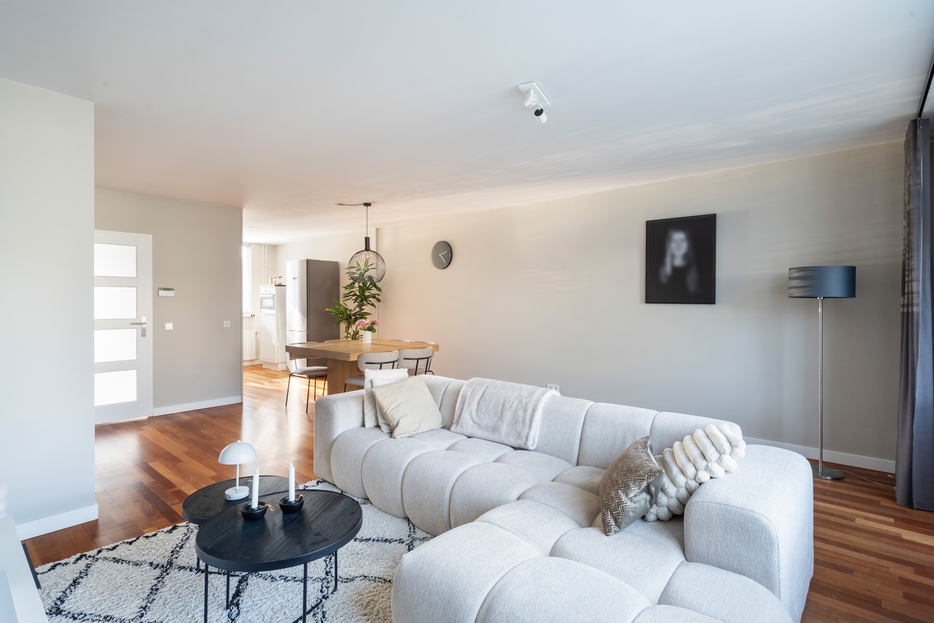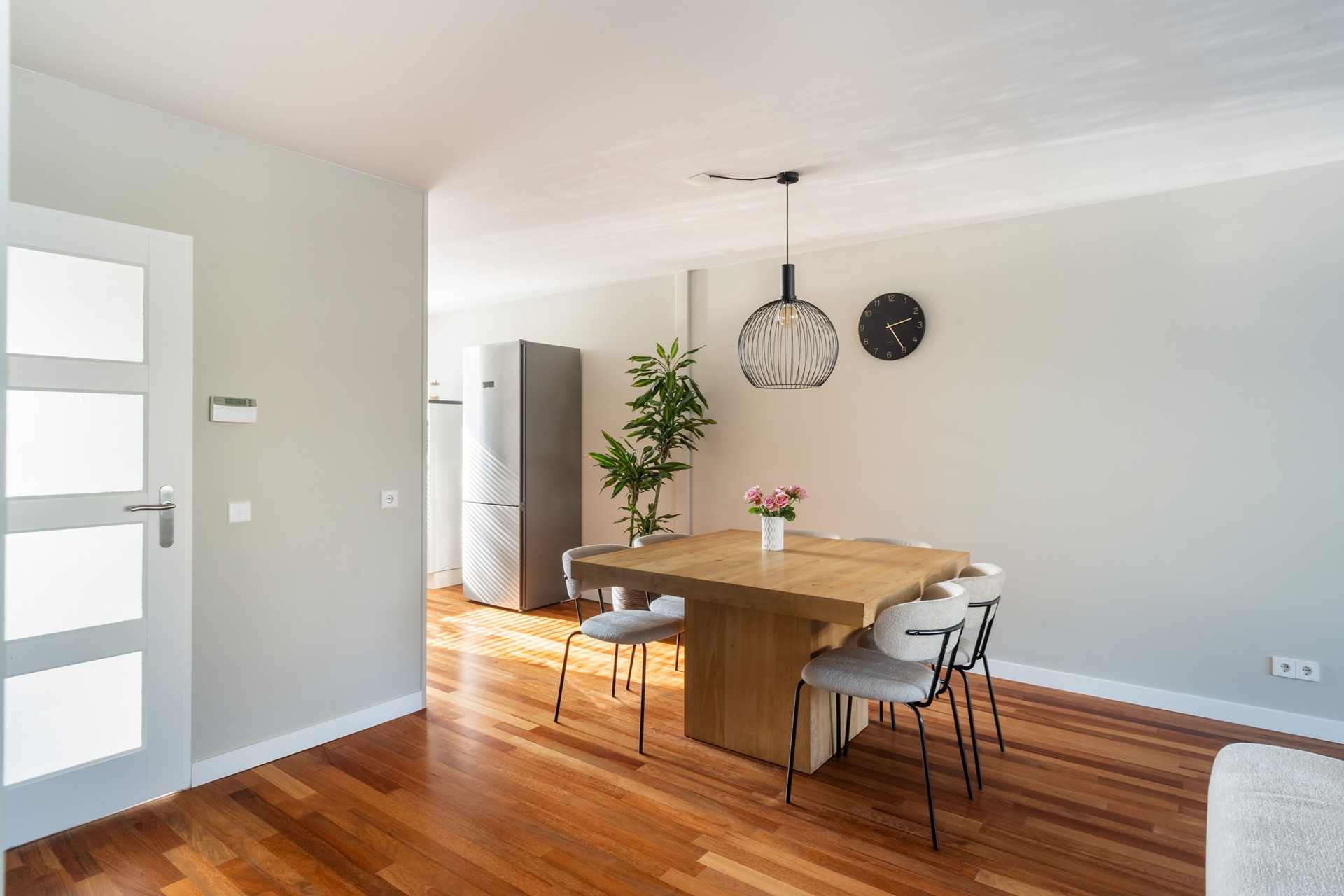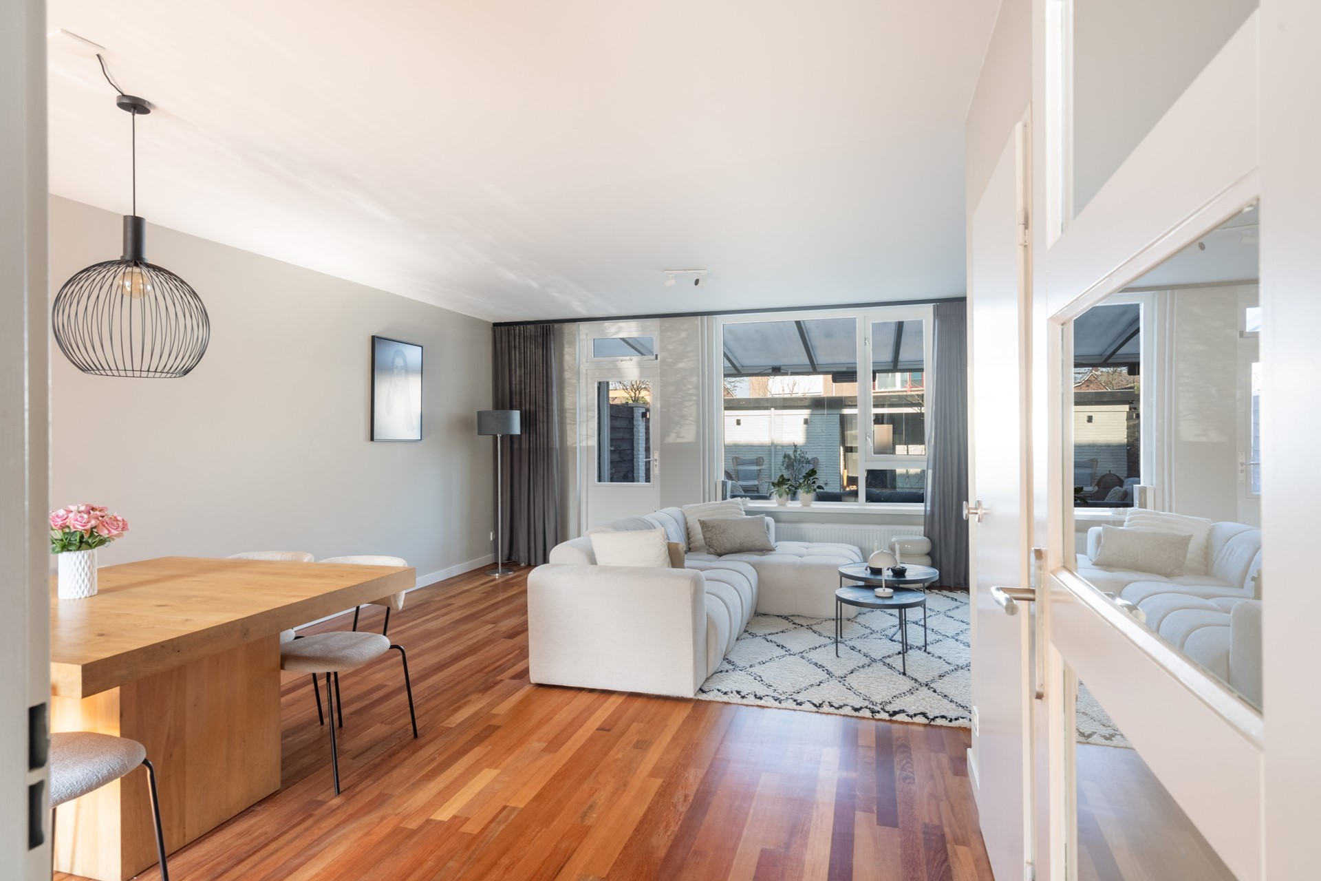 Het gedeelte aan de voorzijde van de woning leent zich perfect voor een fijne, ruime eethoek nabij de keuken. Aan de achterzijde is er ruimte voor een riante zithoek. De tuindeur verbindt de woonkamer met de veranda en de achtertuin. De woonkamer is voorzien van een trapkast met praktische bergruimte en afgewerkt met een massief hardhouten vloer.