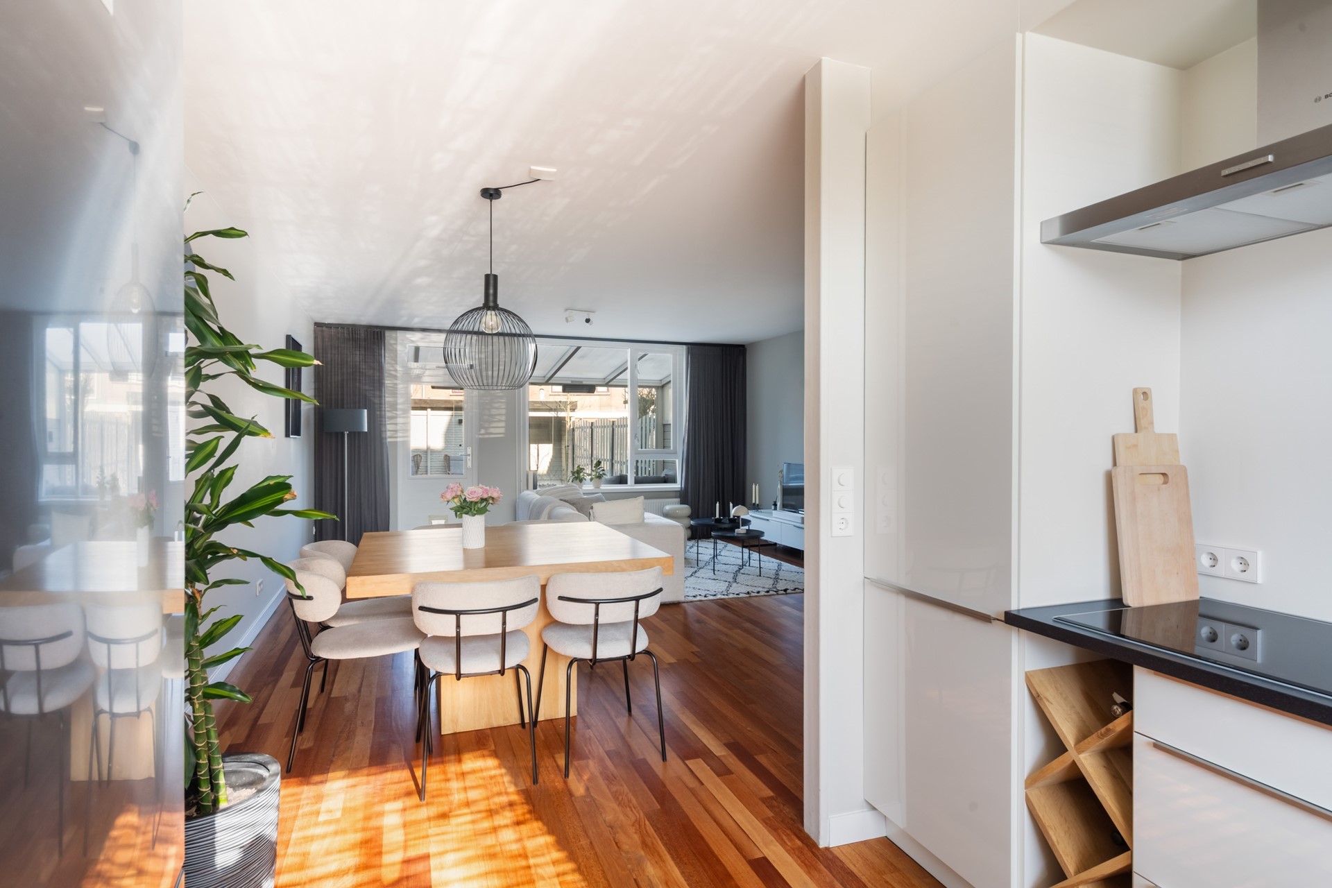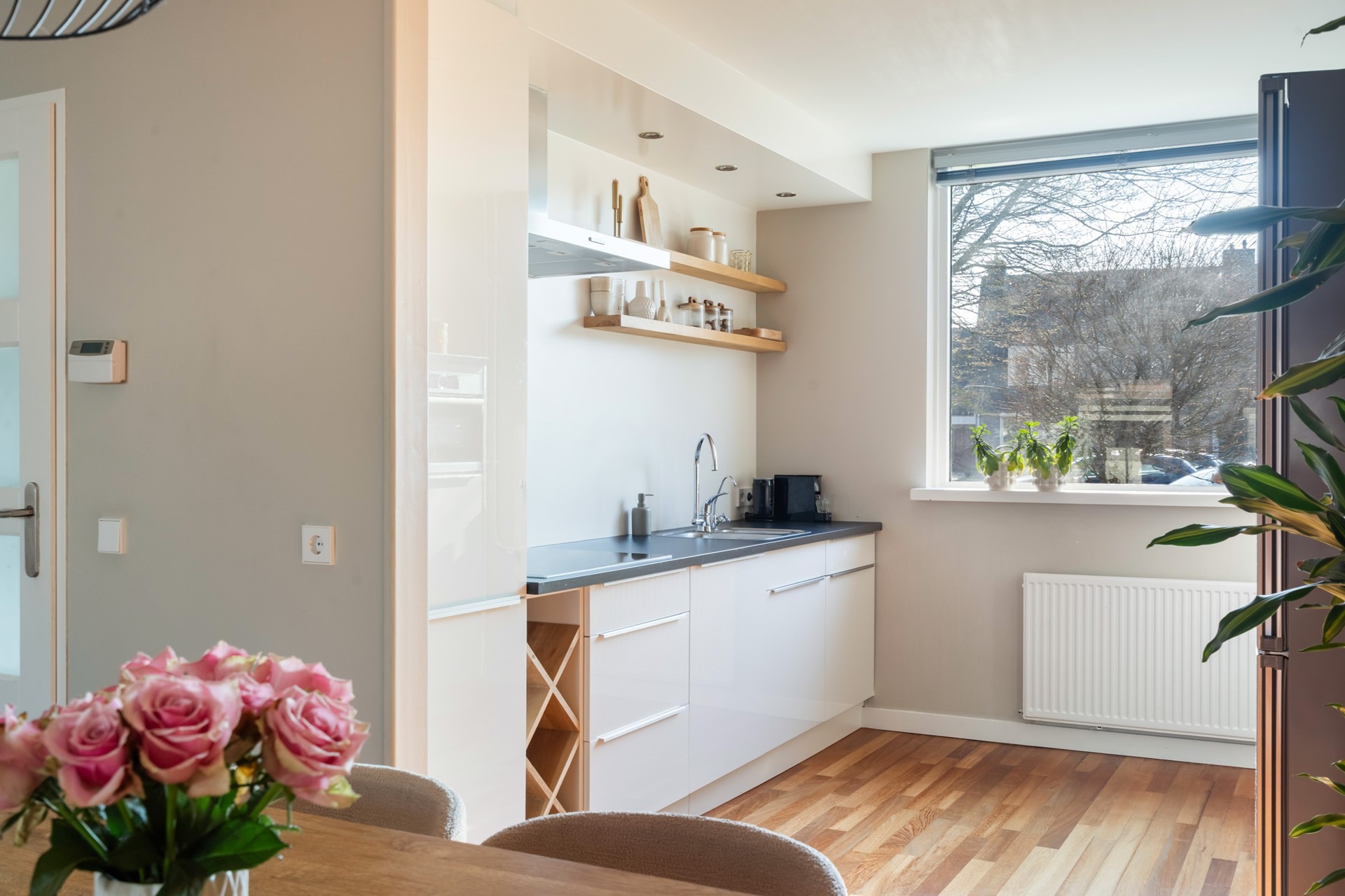 De woonkamer is tuingericht en heeft prettig daglicht door de grote glaspartij. De open keuken aan de voorzijde van de woning is voorzien van een rechte keukenopstelling, uitgevoerd in mat wit met een antraciet gelamineerd aanrechtblad, inductiekookplaat, RVS-afzuigschouw, vaatwasser en close-in boiler. In de bijbehorende parallel geplaatste kast is de combimagnetron geplaatst.
