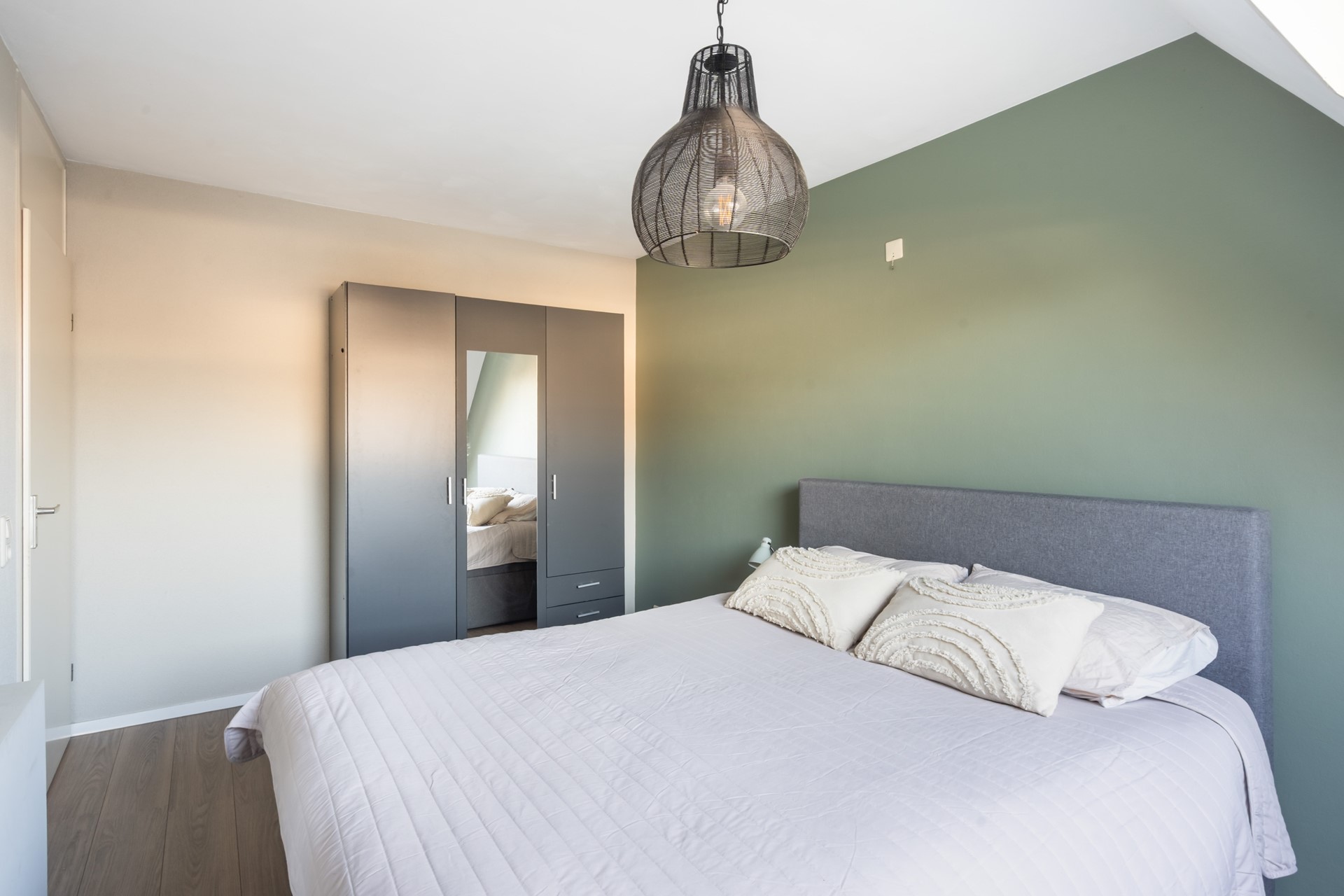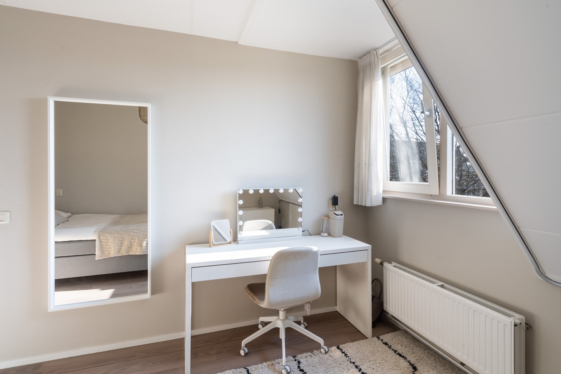 Overloop met vaste trapopgang naar de tweede verdieping. De eerste verdieping is aan de voorzijde voorzien van een dakkapel. Er zijn 3 slaapkamers, waarvan 2 aan de voorzijde en 1 aan de achterzijde. De slaapkamers aan de voorzijde zijn voorzien van een rolluik.