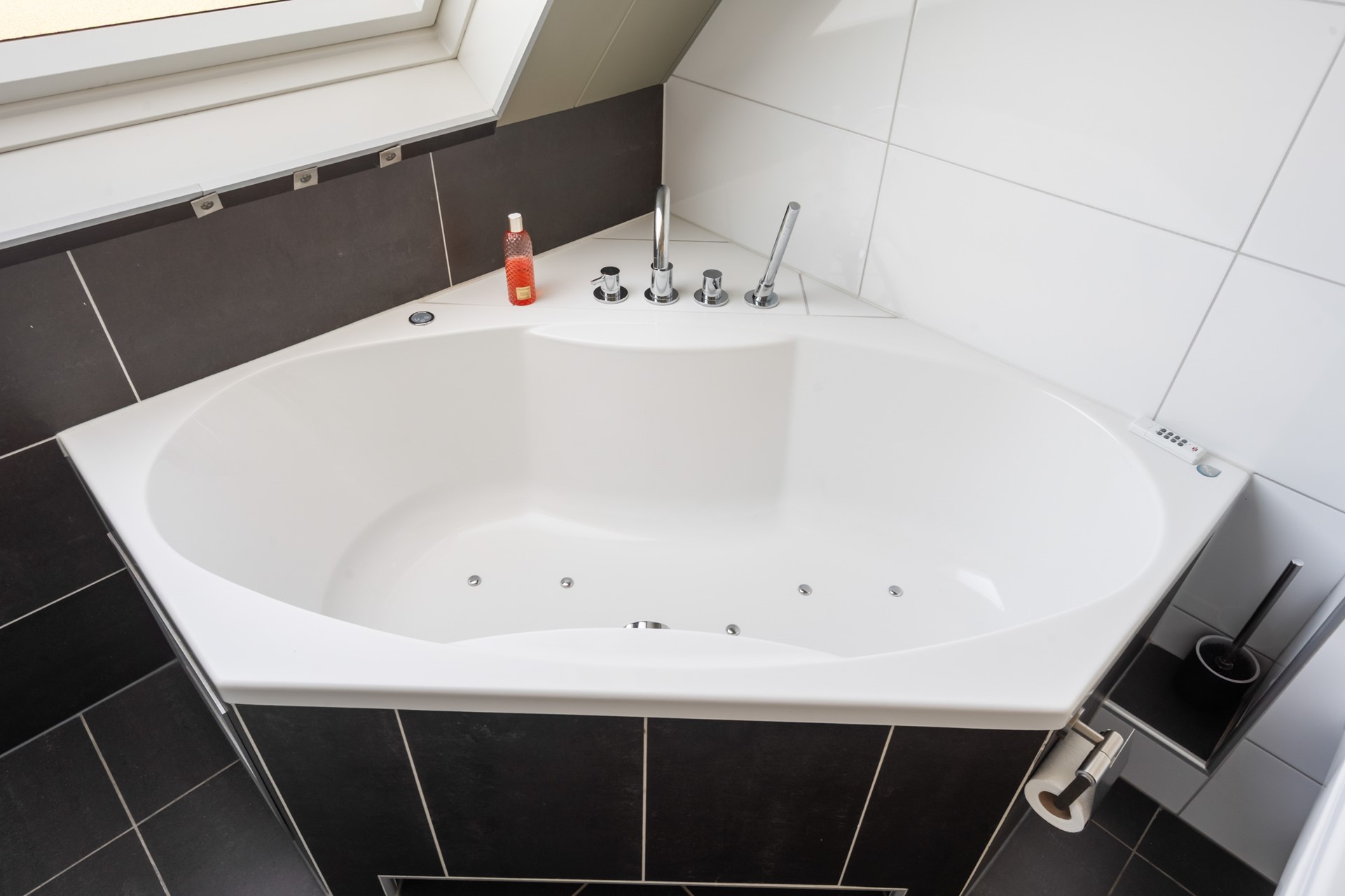 Ruime badkamer met dakvenster, volledig betegelde wanden en voorzien van een ligbad (bubbelbad), inloopdouche, wastafelmeubel met wastafel, verlichte spiegel, hangend closet, designradiator en elektrische vloerverwarming. De verdieping is afgewerkt met een laminaatvloer.