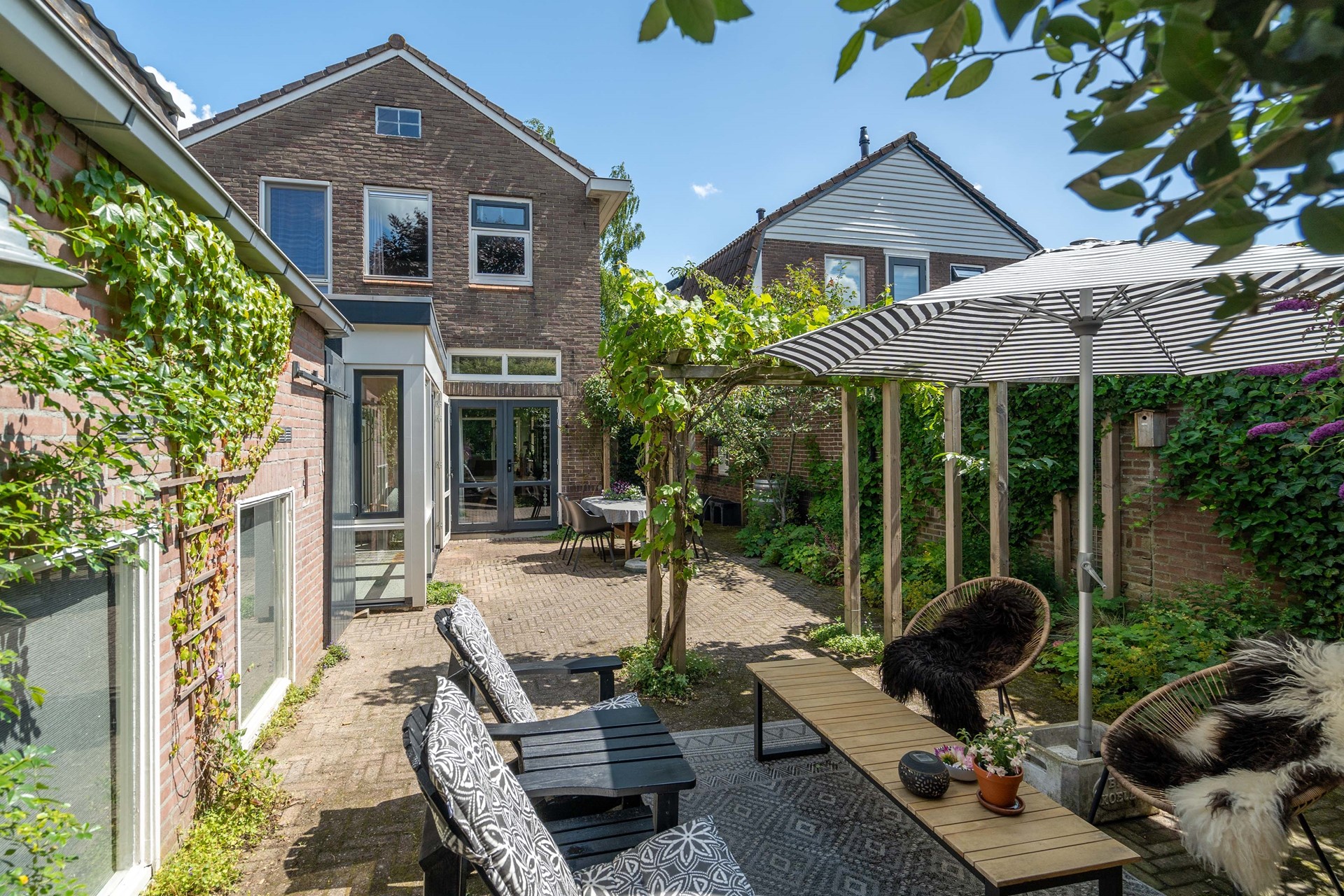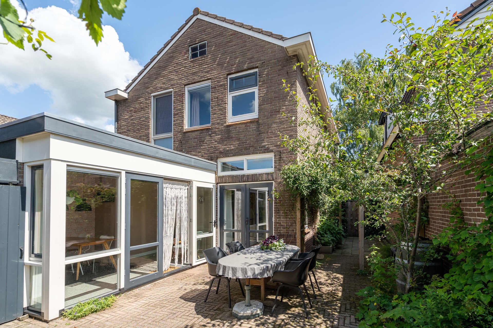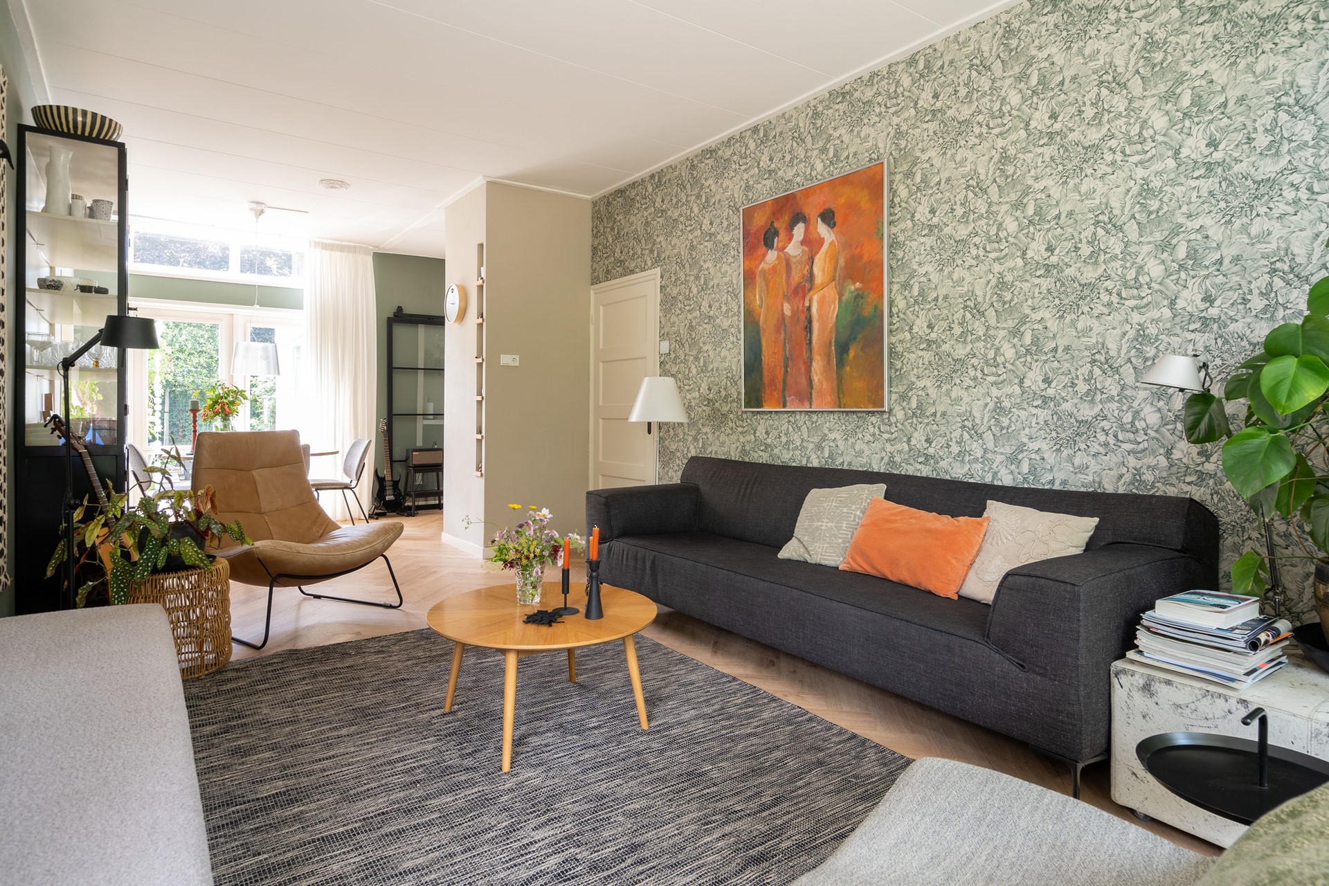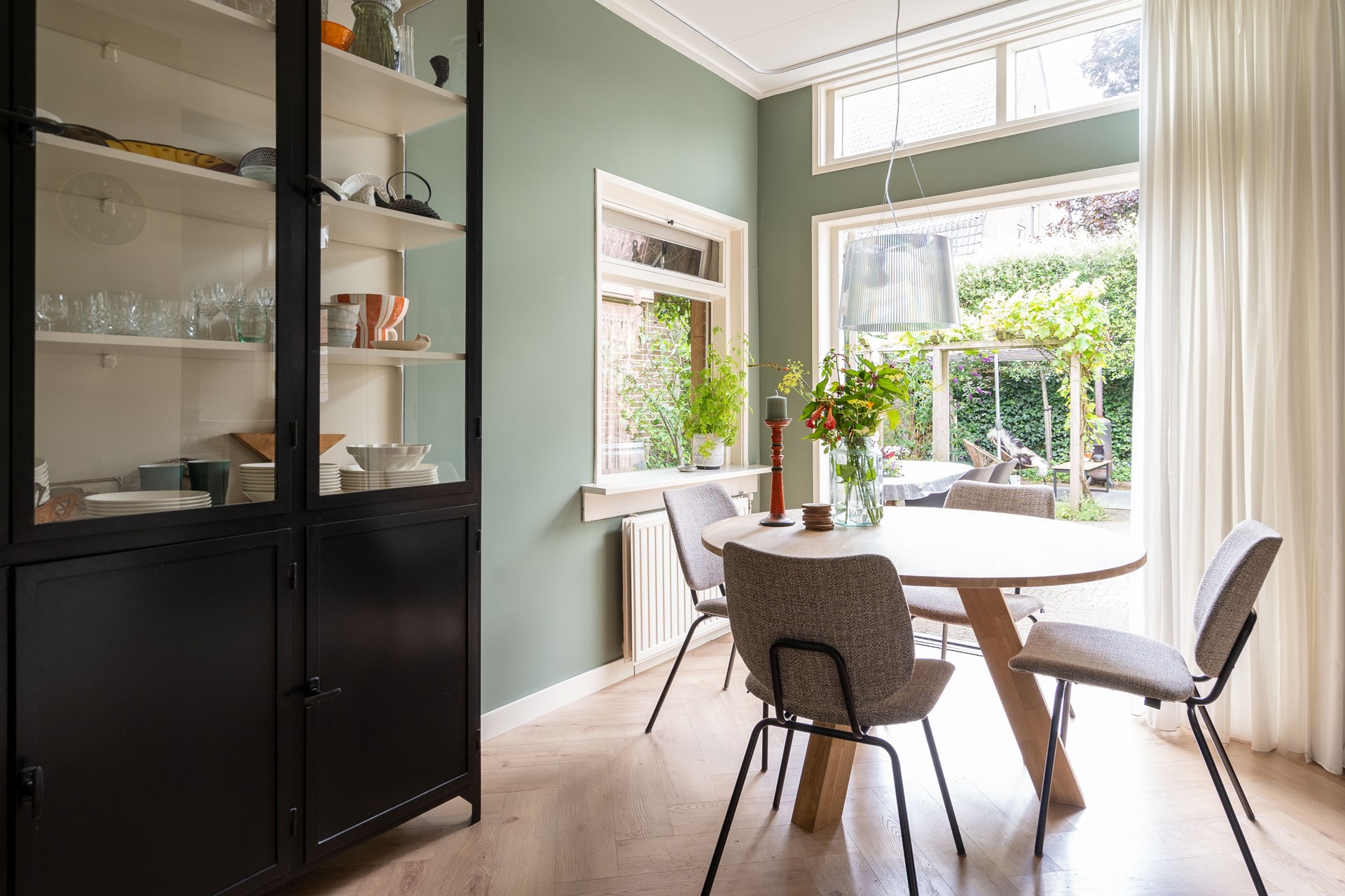 De woning zelf biedt een heerlijke leefruimte. Bij binnenkomst in de prachtige hal, valt direct de lichtinval op, dat ook in de stijlvolle woonkamer, met grote ramen en een doorloop aan de achterzijde naar de fraaie tuinkamer annex eetkamer, met openslaande tuindeuren naar de zonnige tuin. De woonkamer is straatgericht en voelt open en luchtig aan. De moderne, halfopen keuken is compleet uitgerust met inbouwapparatuur, waaronder: vrijstaand elektrisch fornuis (5-pits) en vaatwasser. Een keuken bij uitstek ook geschikt om gelijktijdig het eten te bereiden en ook deel te nemen aan het gesprek met familie/vrienden.