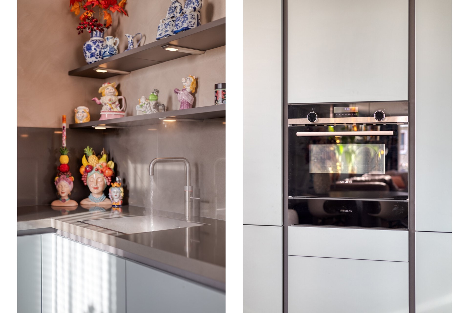 Heerlijke open keuken in een warme kleurstelling met een composiet aanrechtblad. Door de L-vormige opstelling is de keuken voorzien van alle gemakken en is er veel werkruimte om de mooiste gerechten te bereiden. Een echté smaakmaker van de woning. De keuken is voorzien van: