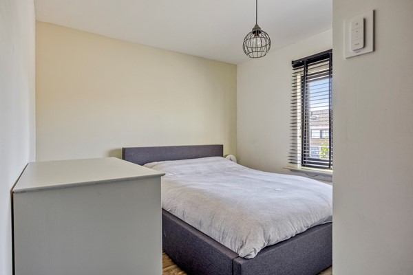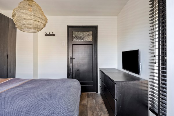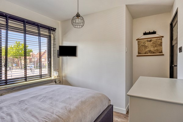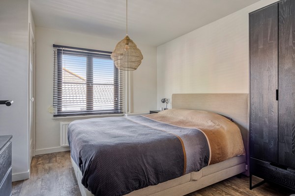 De hoofdslaapkamer is aan de achterzijde gelegen en heeft opvallend veel daglicht. Zowel via het raam aan de zijkant als aan de achterzijde van de kamer. De vaste kasten zorgen al voor de nodige ruimte voor de kleding.