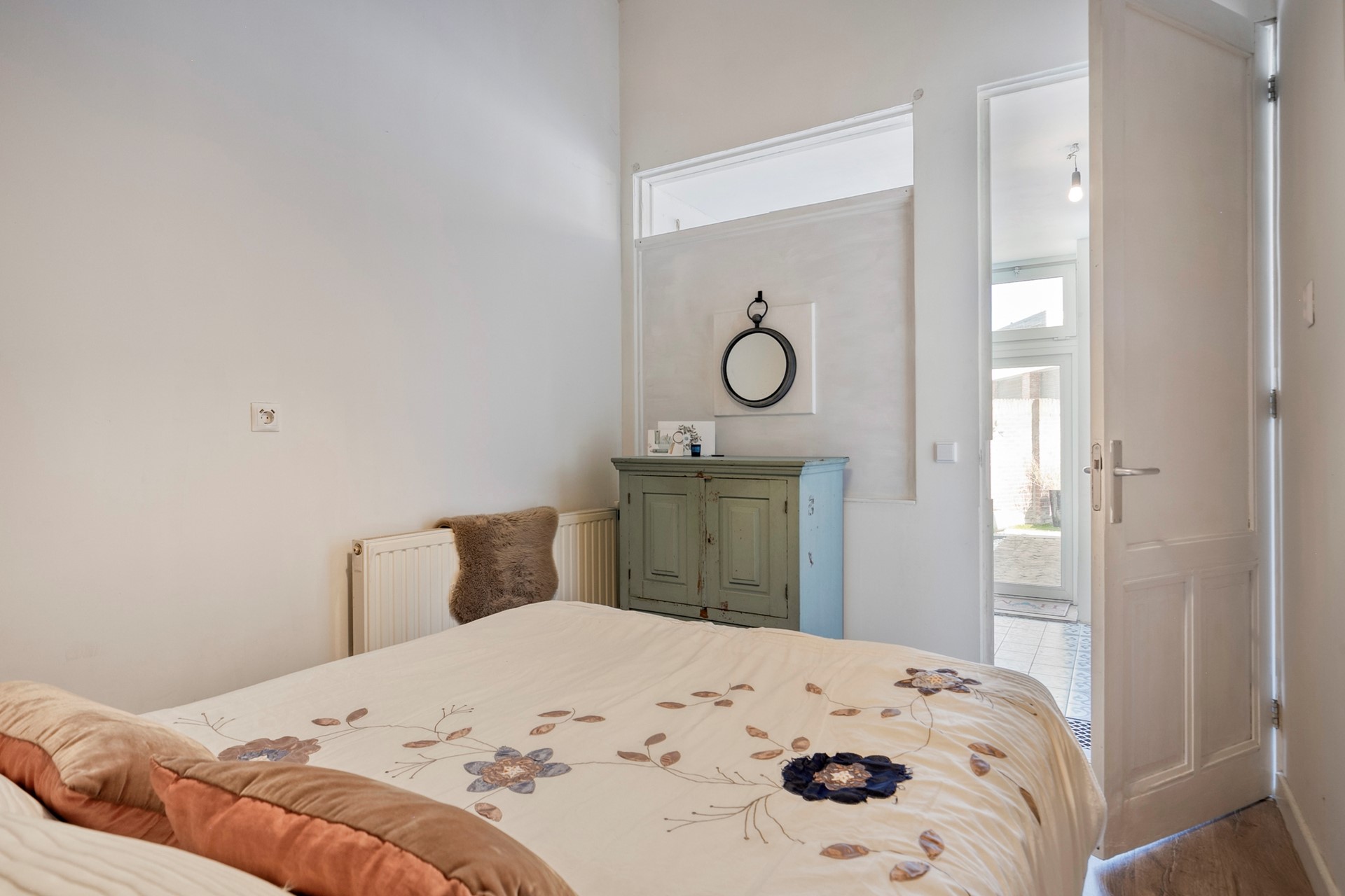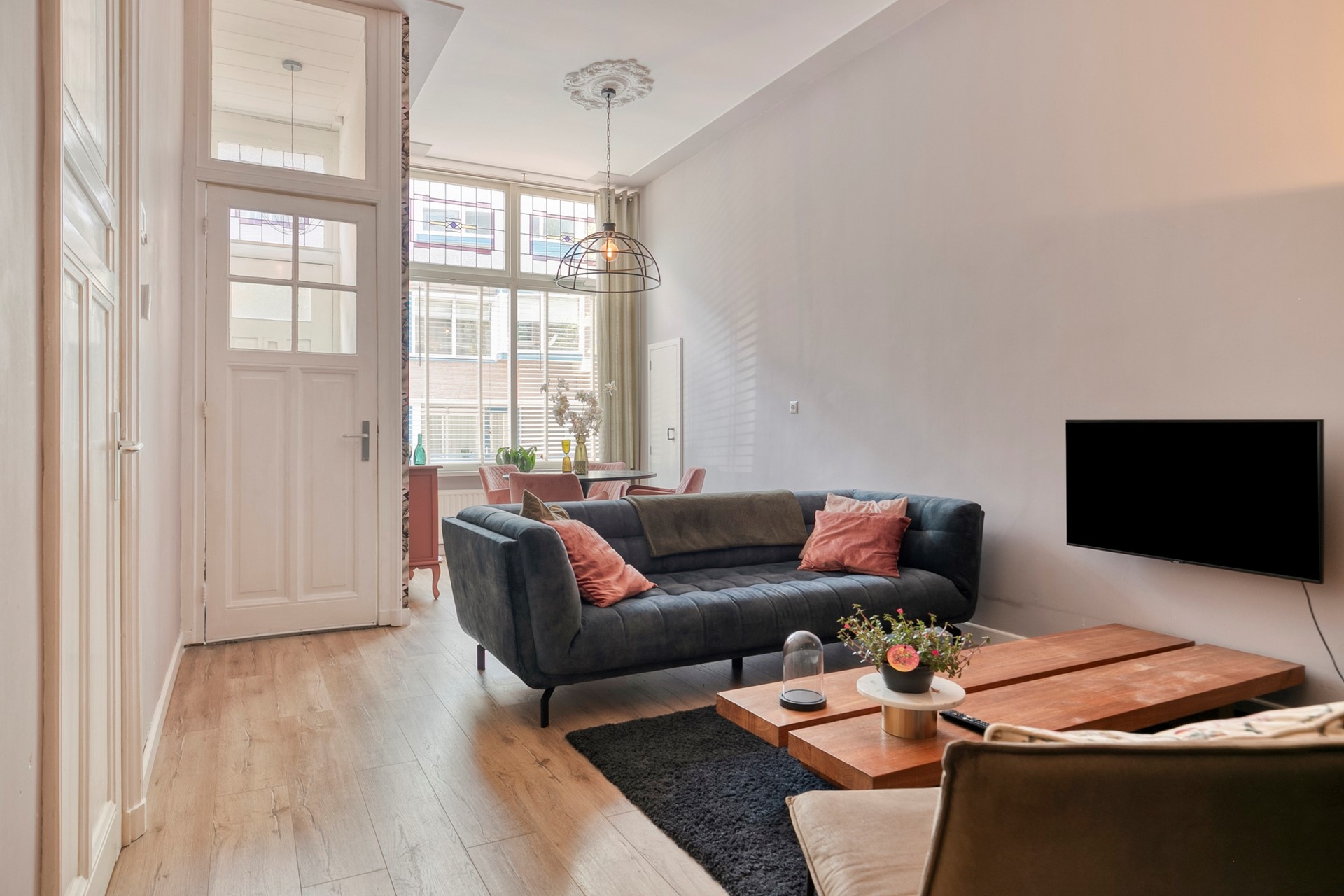 Sfeervolle woonkamer met mooie authentieke details. Denk aan de paneeldeuren, glas-in-loodramen en de sierlijsten aan het plafond. Een leuke eet- en zithoek kunnen hier met gemak worden geplaatst. Gezellig met familie of vrienden tafelen en geniet van een leuke film. Via de woonkamer is er toegang tot de meterkast en een handige bergkast.