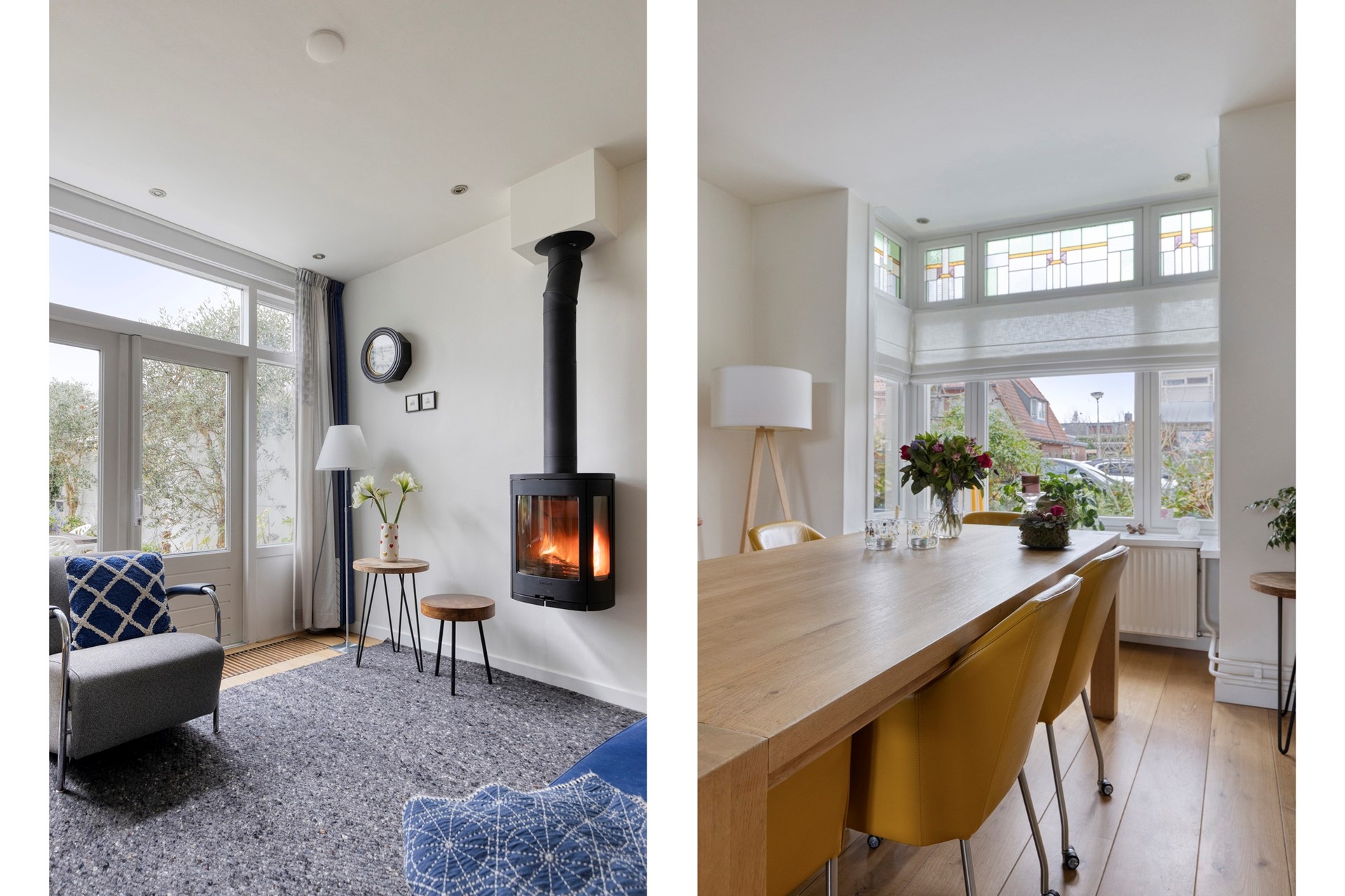 Sfeervolle woonkamer met een speelse indeling. De erker aan de voorkant geeft een mooi uitzicht over de straat en details zoals het glas-in-lood maken het plaatje compleet. Bij de houtkachel is het in de wintermaanden heerlijk vertoeven. De woonkamer staat doormiddel van de openslaande tuindeuren in verbinding met de tuin. De vaste kast zorgt voor extra opbergruimte. De kamer laat zich vrij natuurlijk inrichten met een leuke zit- en eethoek.