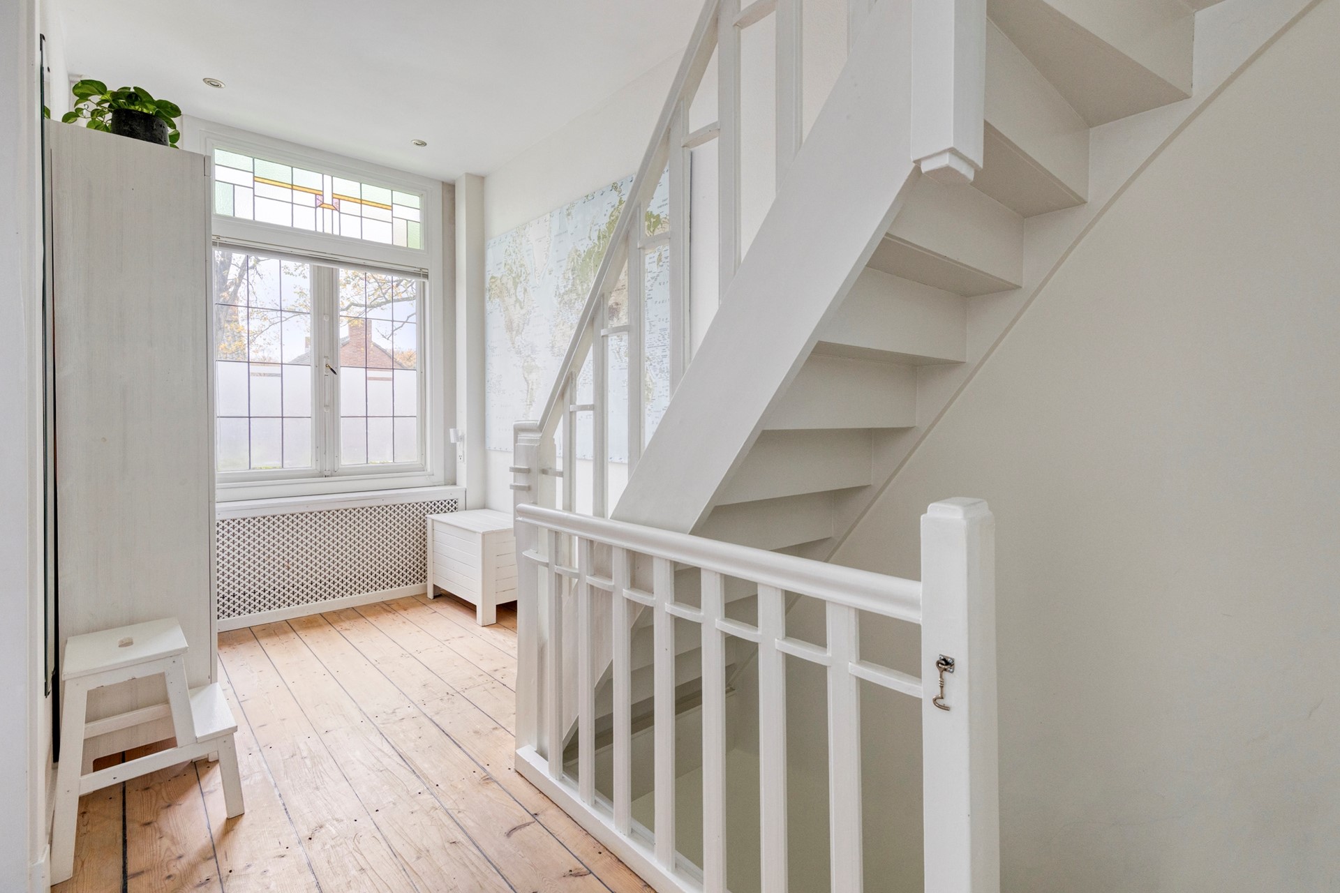 Ruime overloop met een prachtig raampartij aan de voorzijde van de woning met kleurrijk glas-in-lood. Door de royale opzet is het mogelijk om hier een werkhoek te maken voor de thuiswerkers onder ons. De overloop geeft toegang tot twee slaapkamers, de badkamer en trapopgang naar de tweede-/zolderverdieping.