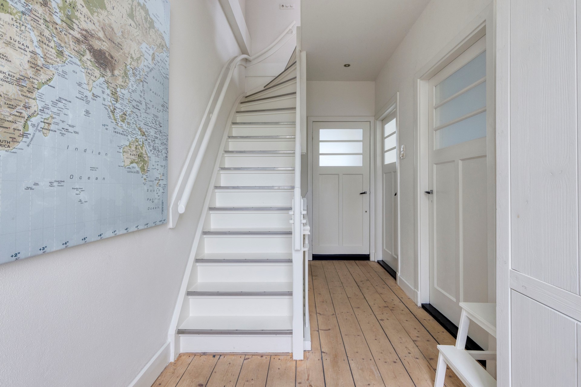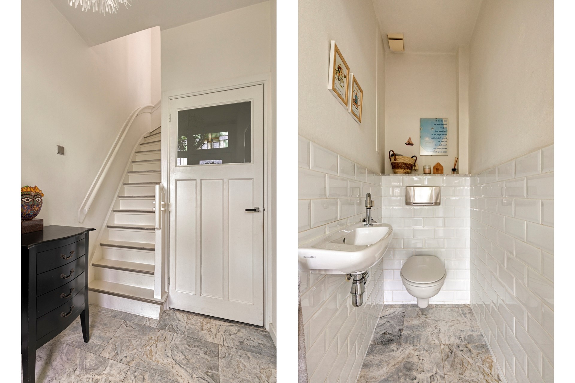 Fijne binnenkomst van de woning in deze ruim opgezette hal. Direct valt het mooie afwerkingsniveau op. Authentieke details als de paneeldeuren en het glas-in-lood laten het karakter van de woning volop zien. Via de hal is er toegang tot de woonkamer, het toilet, de meterkast en de trapopgang.