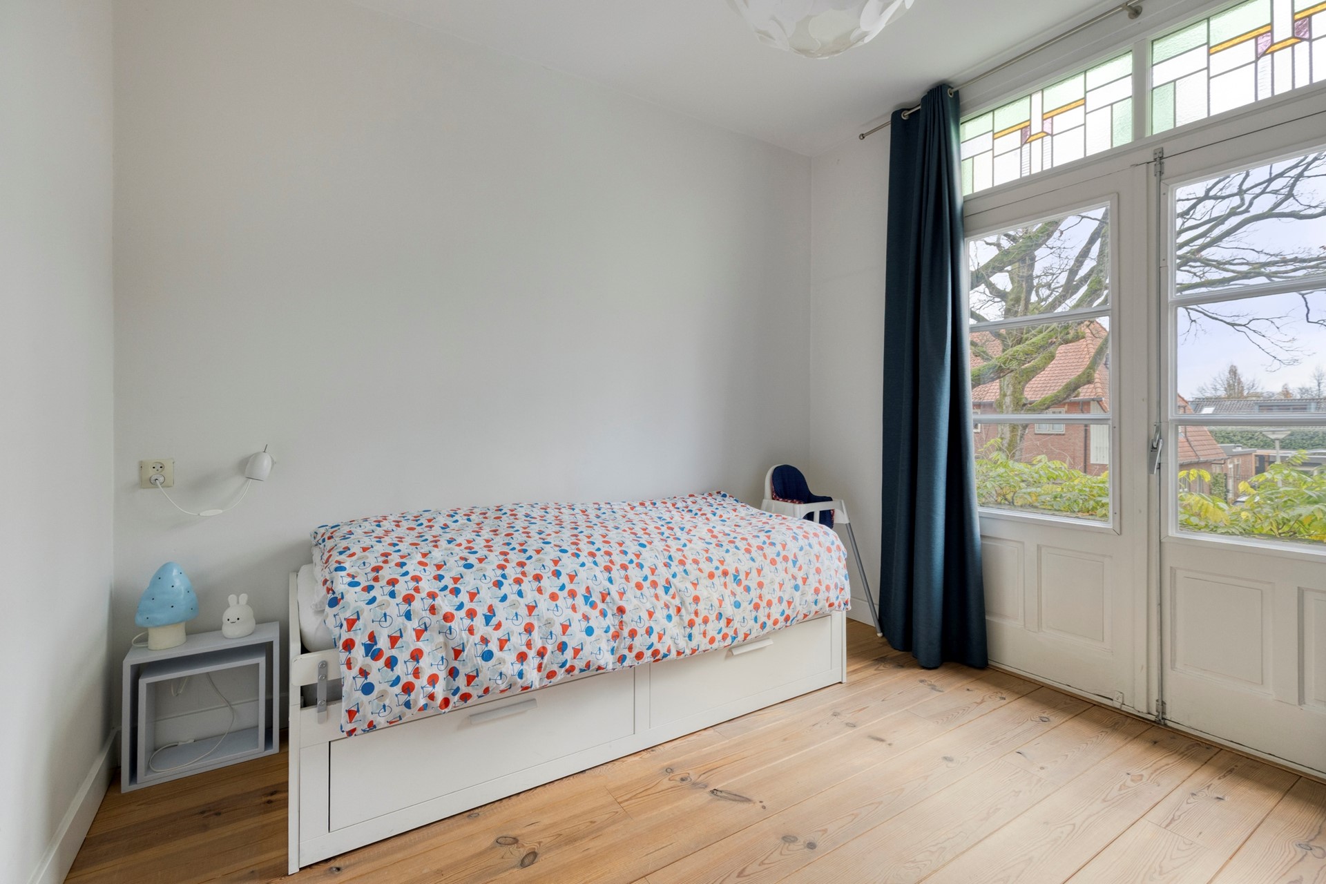 Wat een heerlijke slaapkamer zo aan de voorzijde van de woning. Via de openslaande deuren kan het daglicht goed binnenkomen. Door de bomen aan de voorzijde blijft de kamer lekker koel tijdens de warme zomerdagen. Het balkon is zeker het extraatje van deze kamer. De twee vaste kasten zorgen voor bergruimte.
