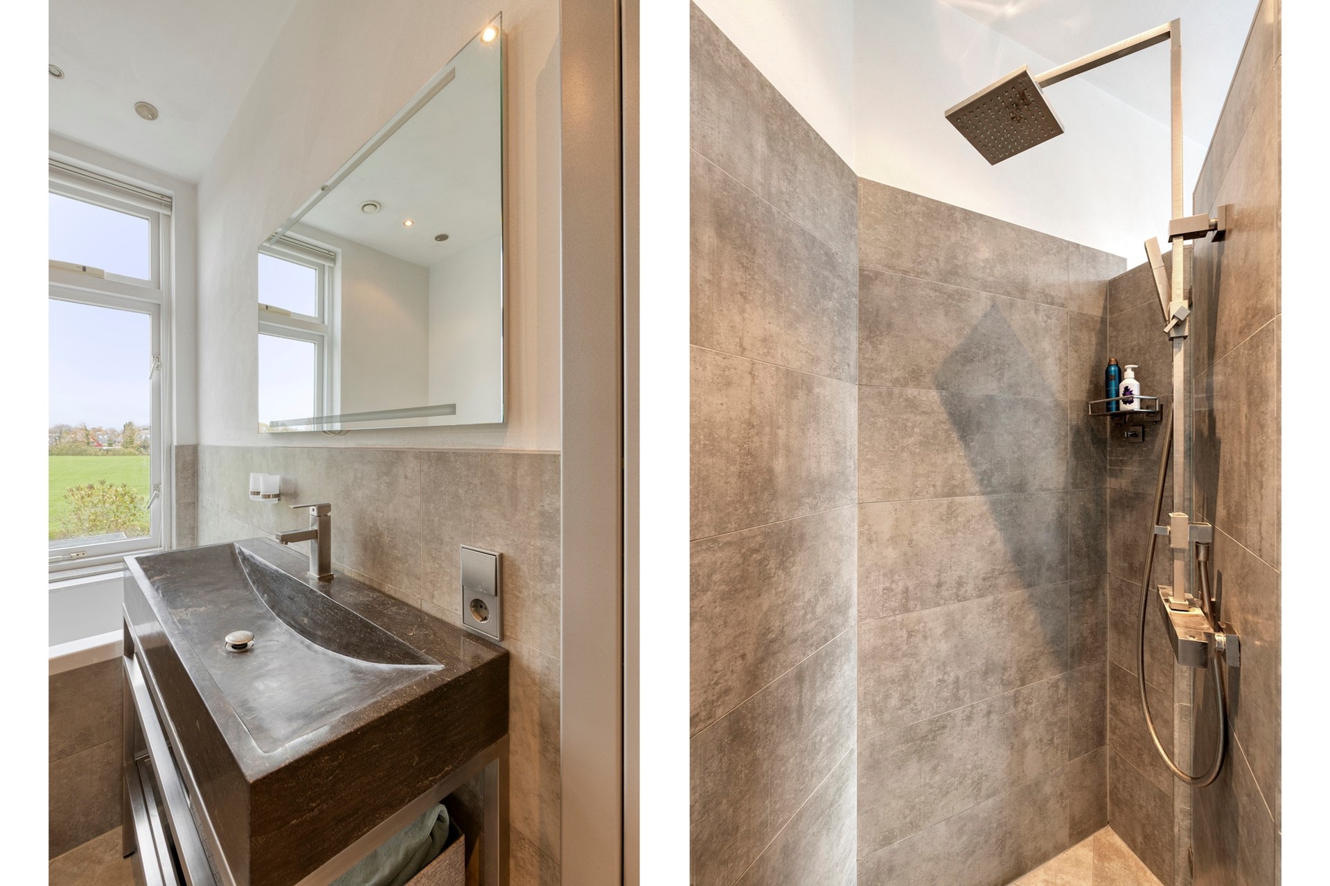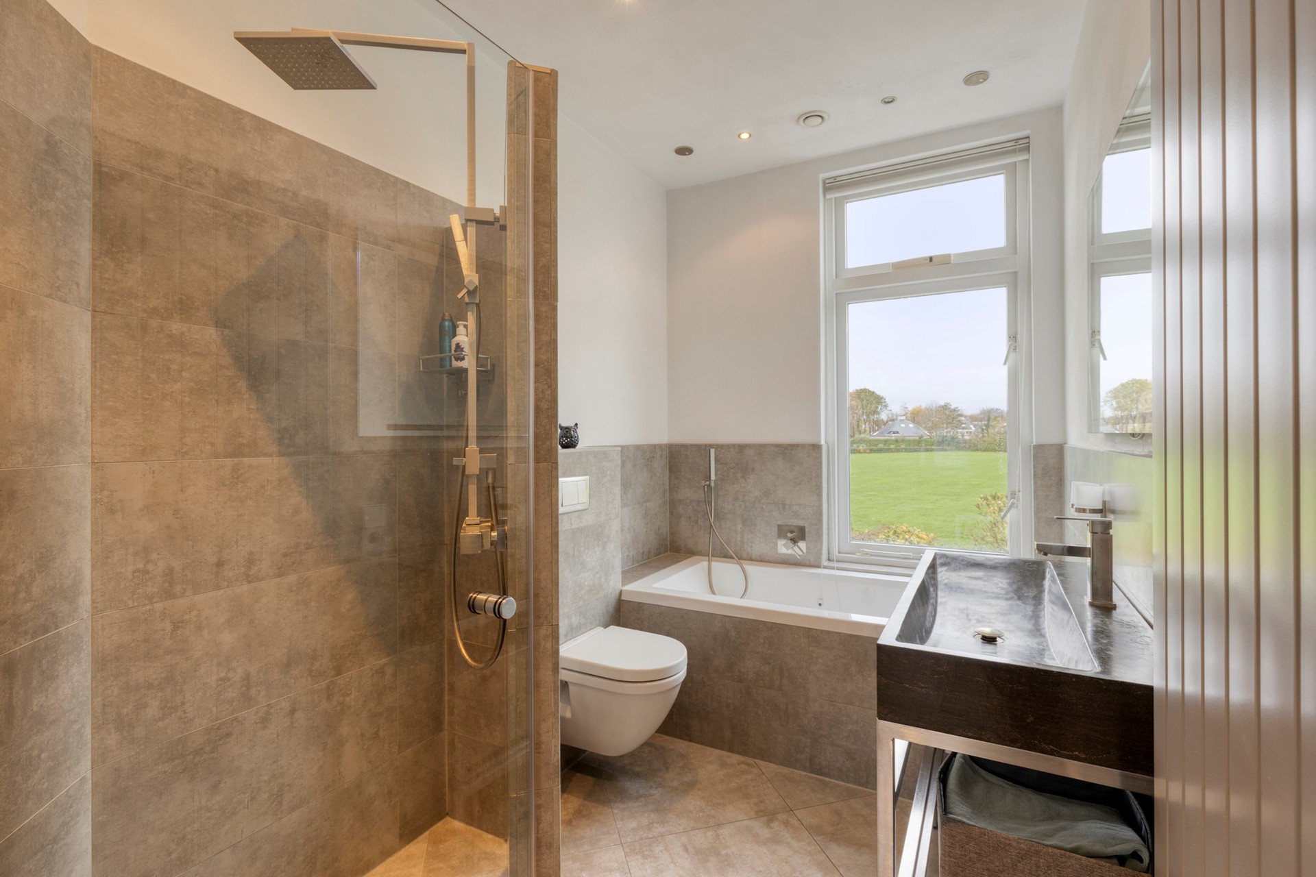Wat een plaatje van een badkamer, haast een wellness ruimte. De badkamer heeft een prettig lichtinval door het raam, die naast het vrije uitzicht ook voor natuurlijke ventilatie zorgt. De badkamer is van alle luxe voorzien die je in een hedendaagse badkamer mag verwachten, zoals: