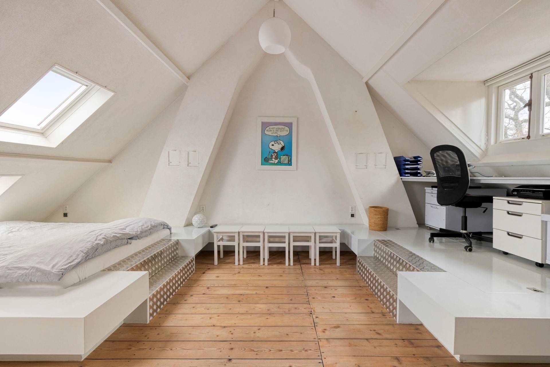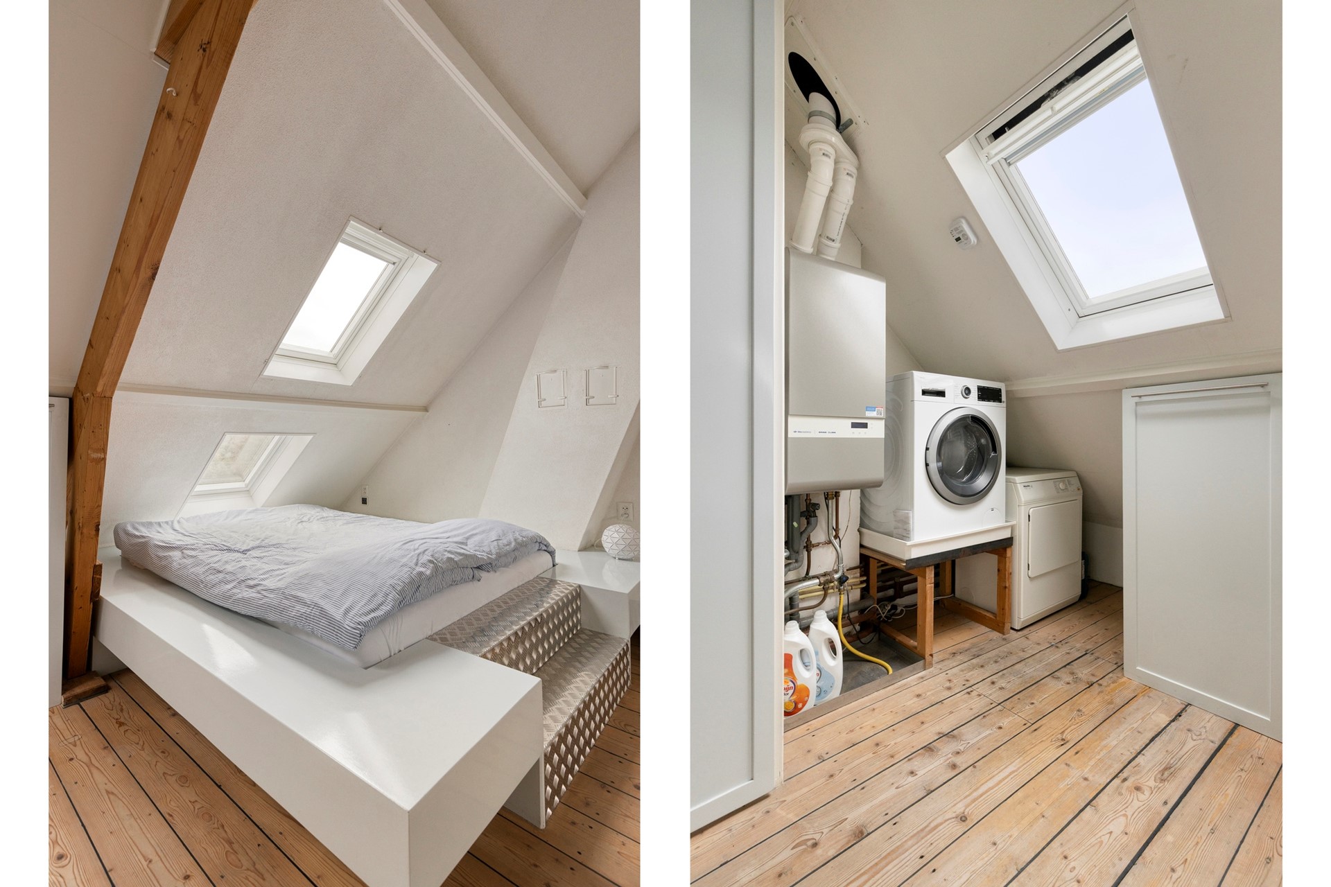 Het zal nog lastig kiezen worden wie deze prachtige ruimte in gebruik gaat nemen. Een hele fijne en speelse ruimte met de verhogingen. Het bureau plaats je op het verhoogde gedeelte bij het dakkapel. Onder het dubbele dakraam tref je het tweepersoonsbed om heerlijk weg te dromen onder de sterrenhemel. In de kamer tref je naast de nodige handige opbergruimtes ook de combiketel en de wasmachine aansluiting.