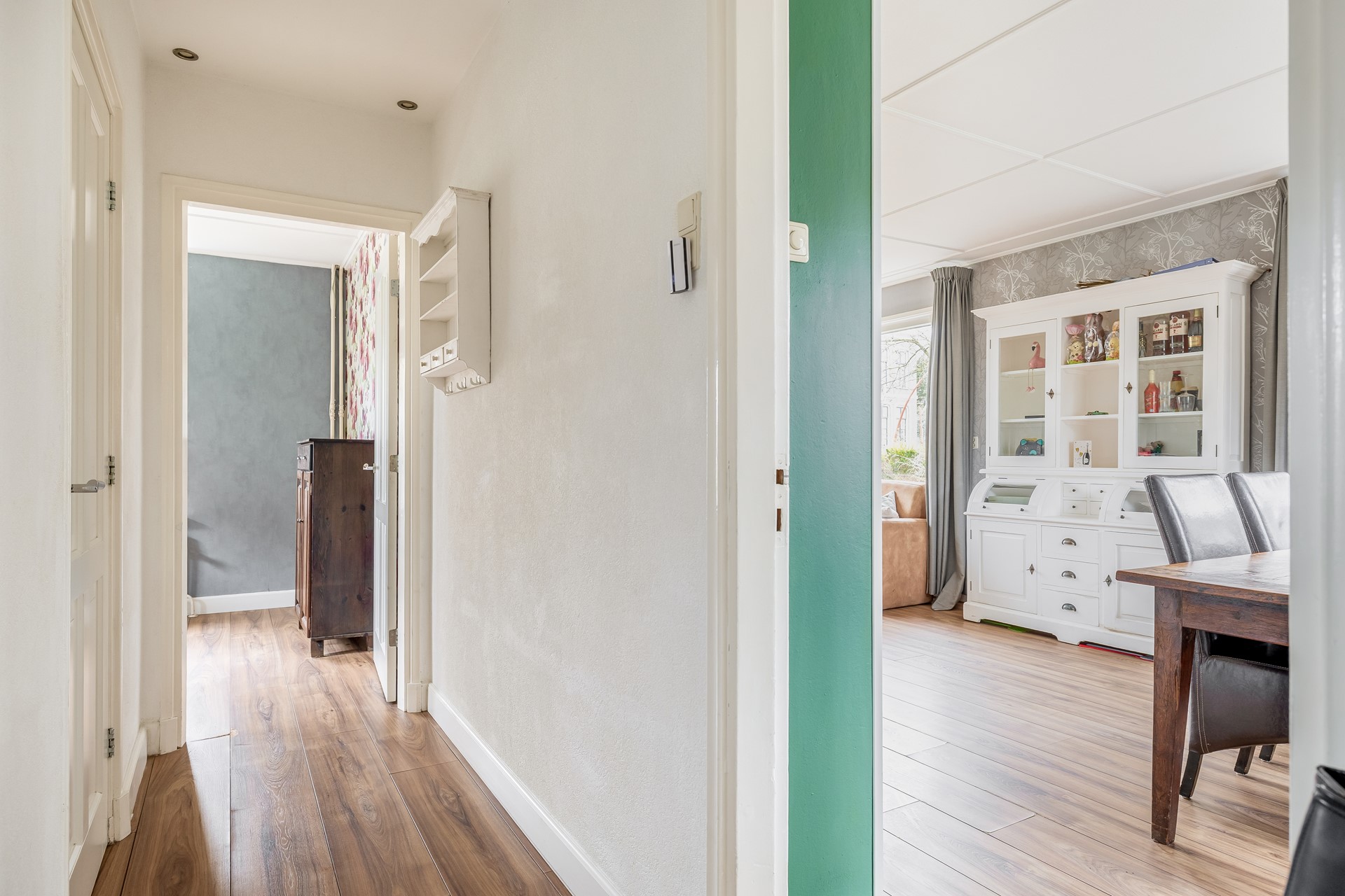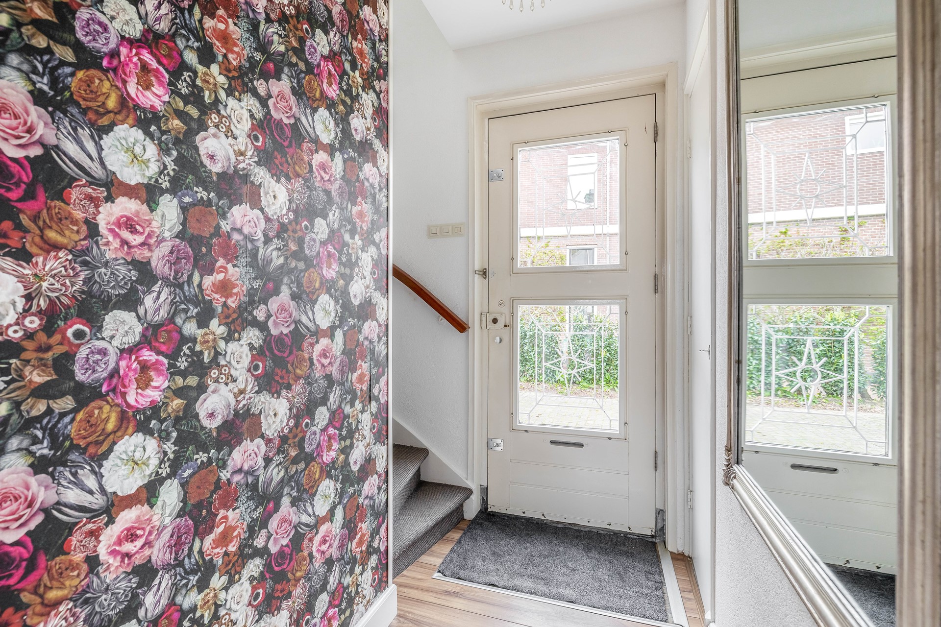 De fraaie gevel rondom de voordeur is op zich al het vermelden waard, zodra u binnenstapt geeft de entree toegang tot de meterkast, trapopgang naar de etage en de achtergelegen hal.
