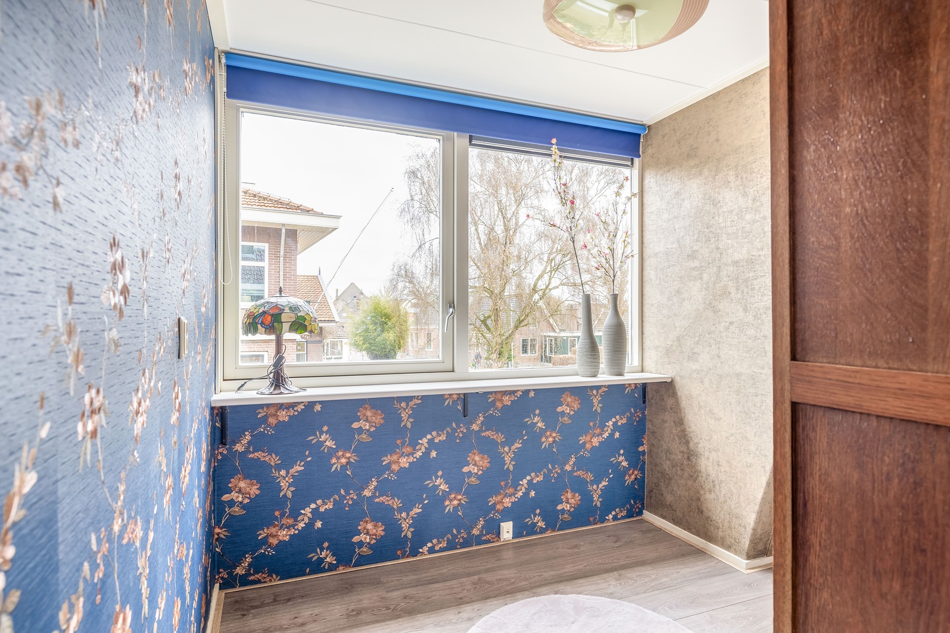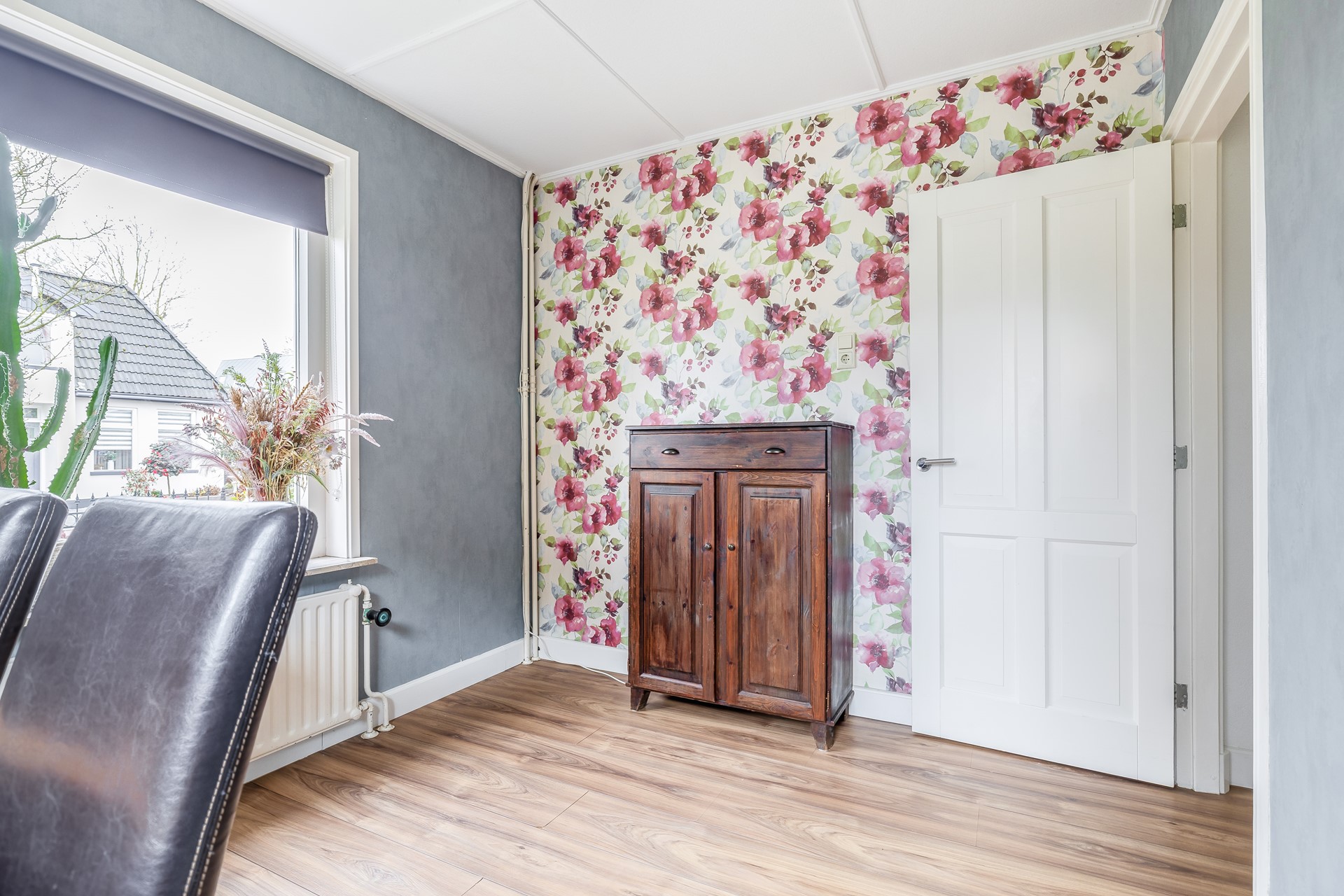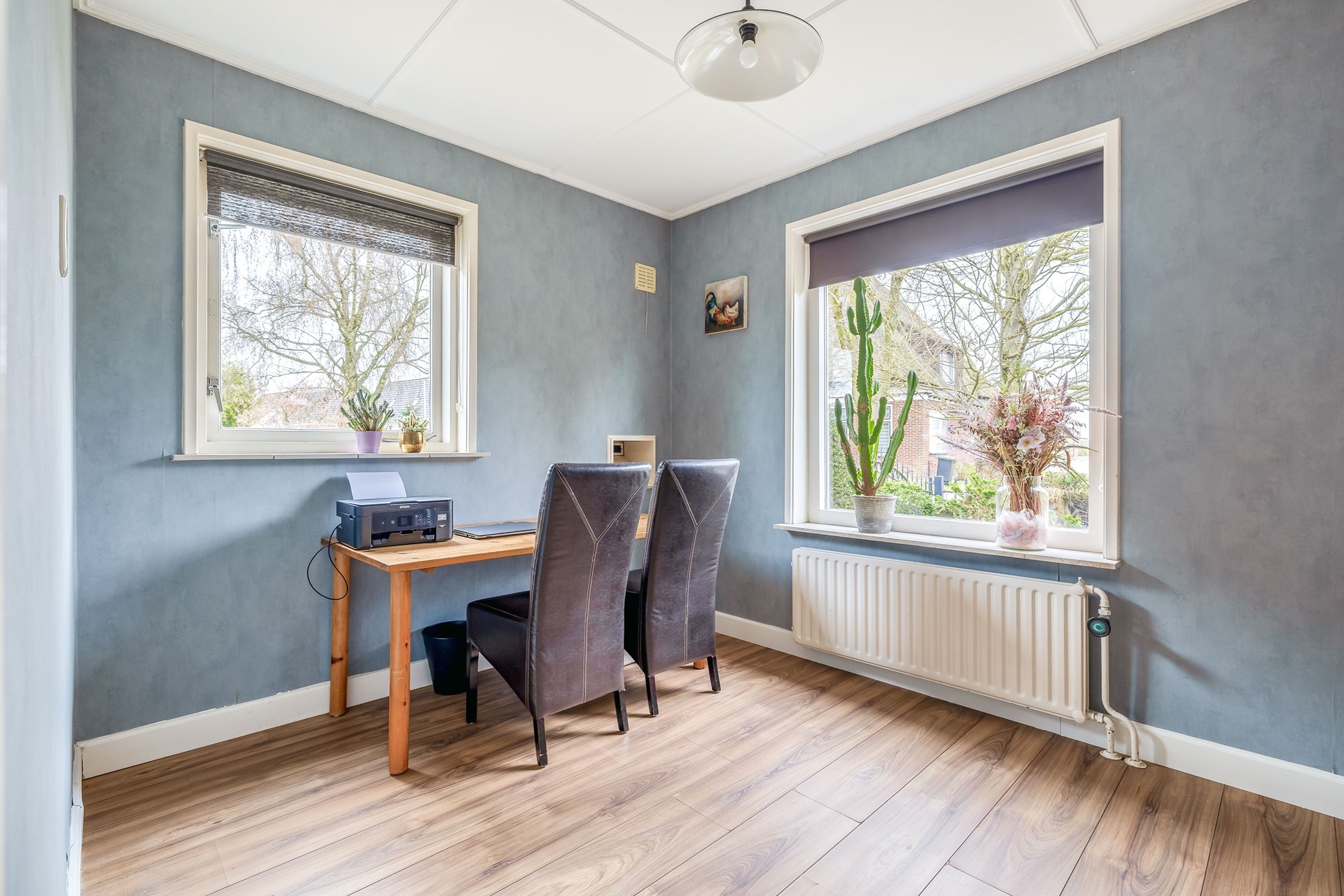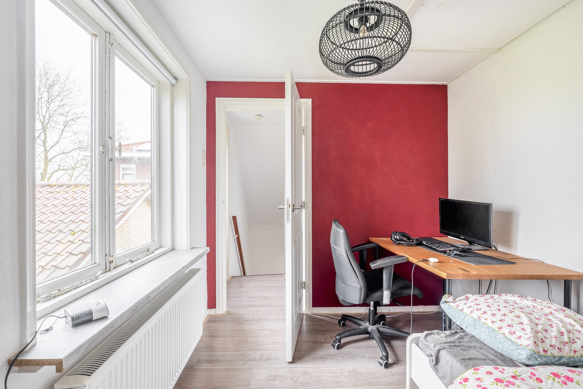 Aan de voorzijde van de woning naast de woonkamer is een slaapkamer of wellicht kantoor aan huis gesitueerd, ook hier is veel daglichtinval o.a. vanwege het zijraam.