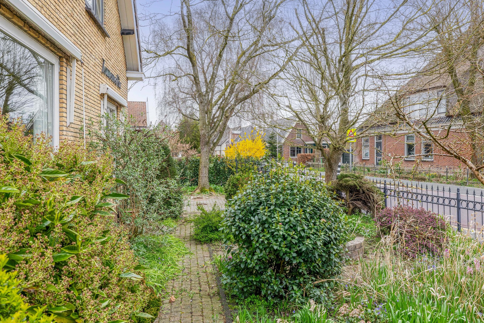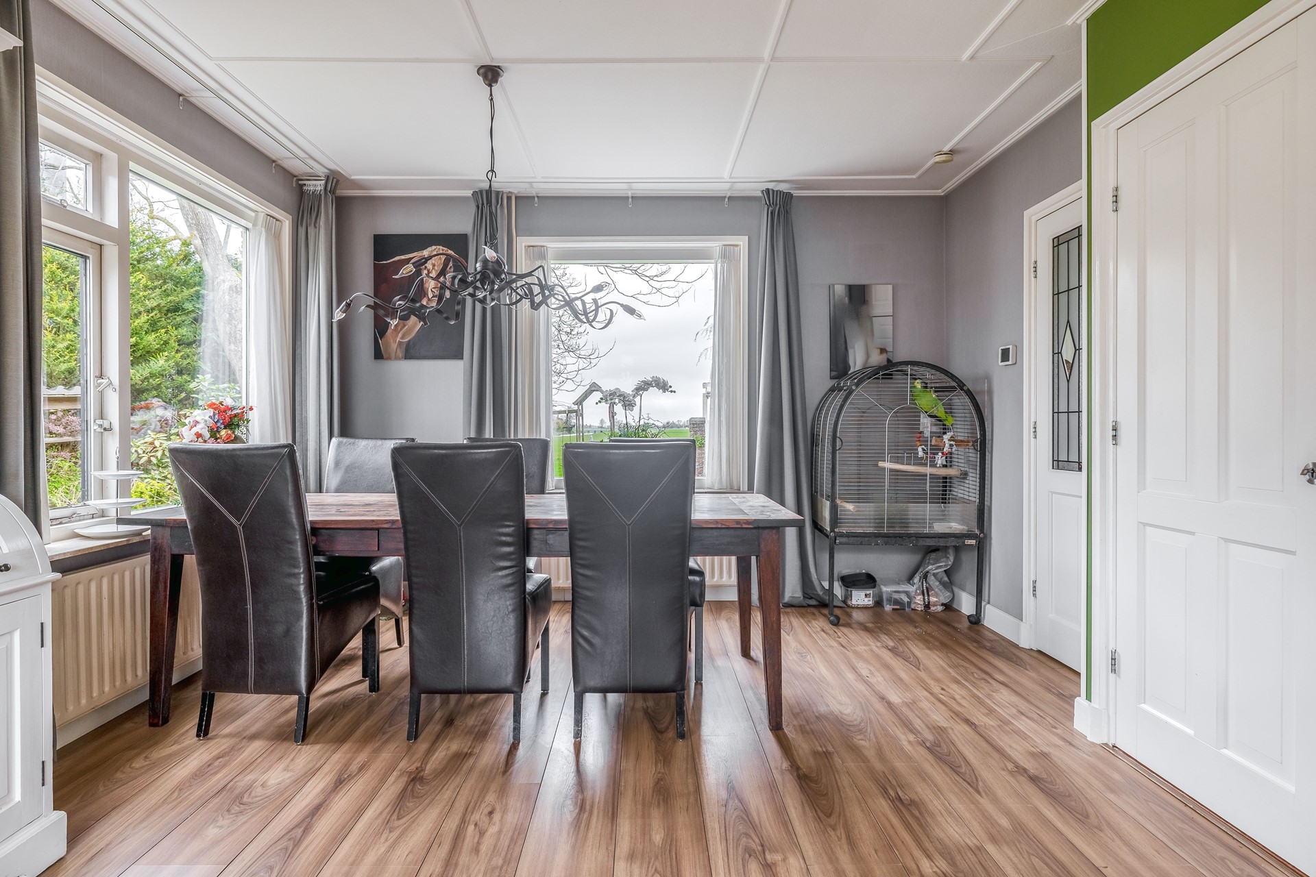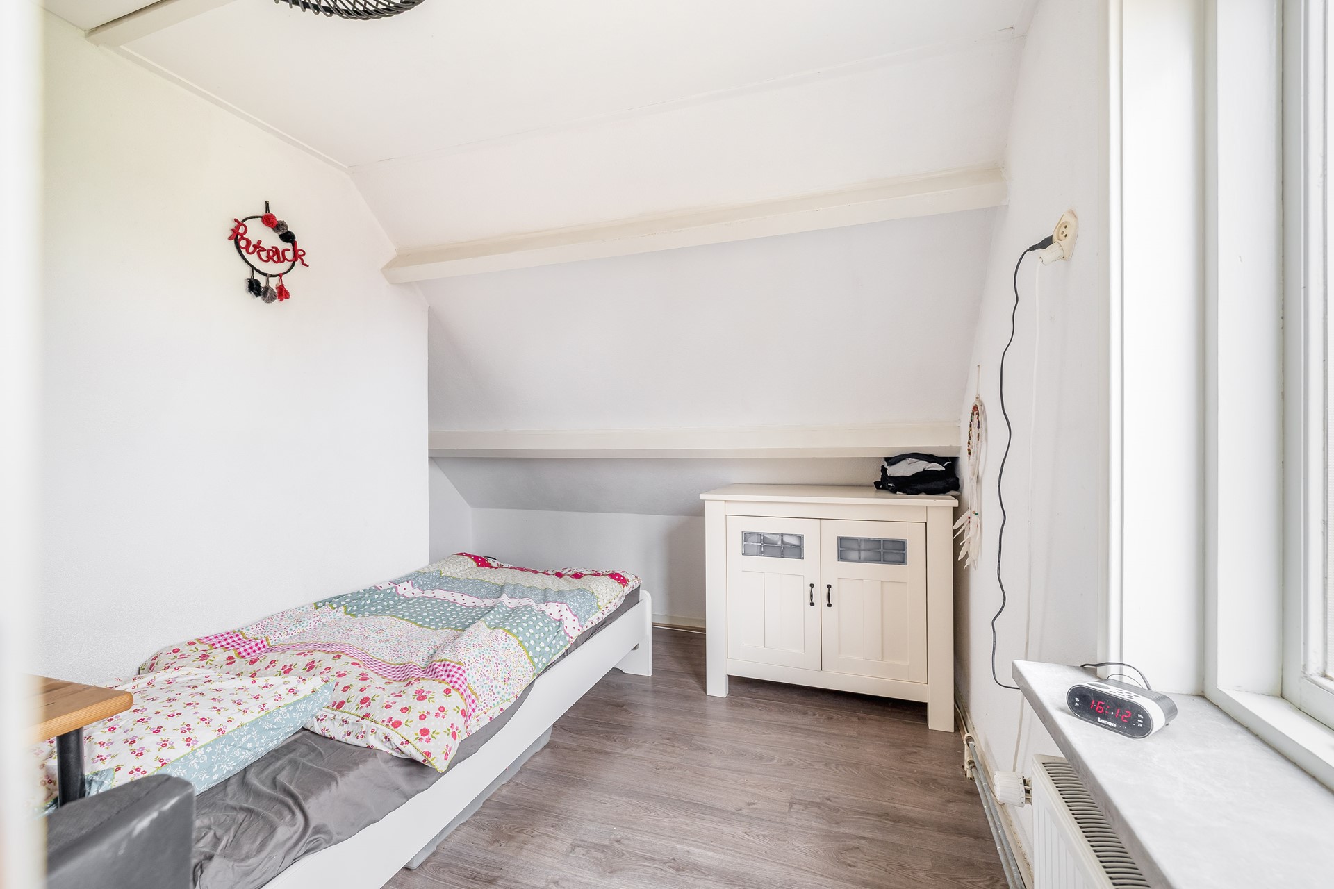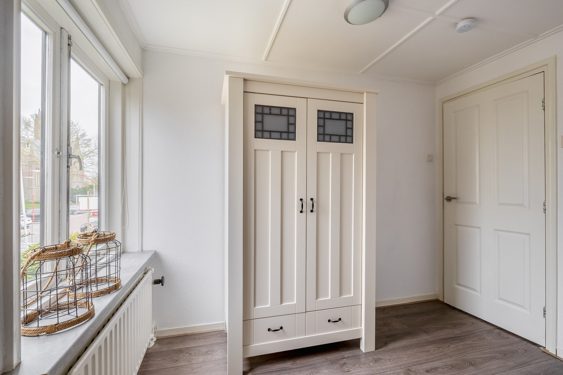 Aan de voorzijde van de woning naast de woonkamer is een slaapkamer of wellicht kantoor aan huis gesitueerd, ook hier is veel daglichtinval o.a. vanwege het zijraam.
