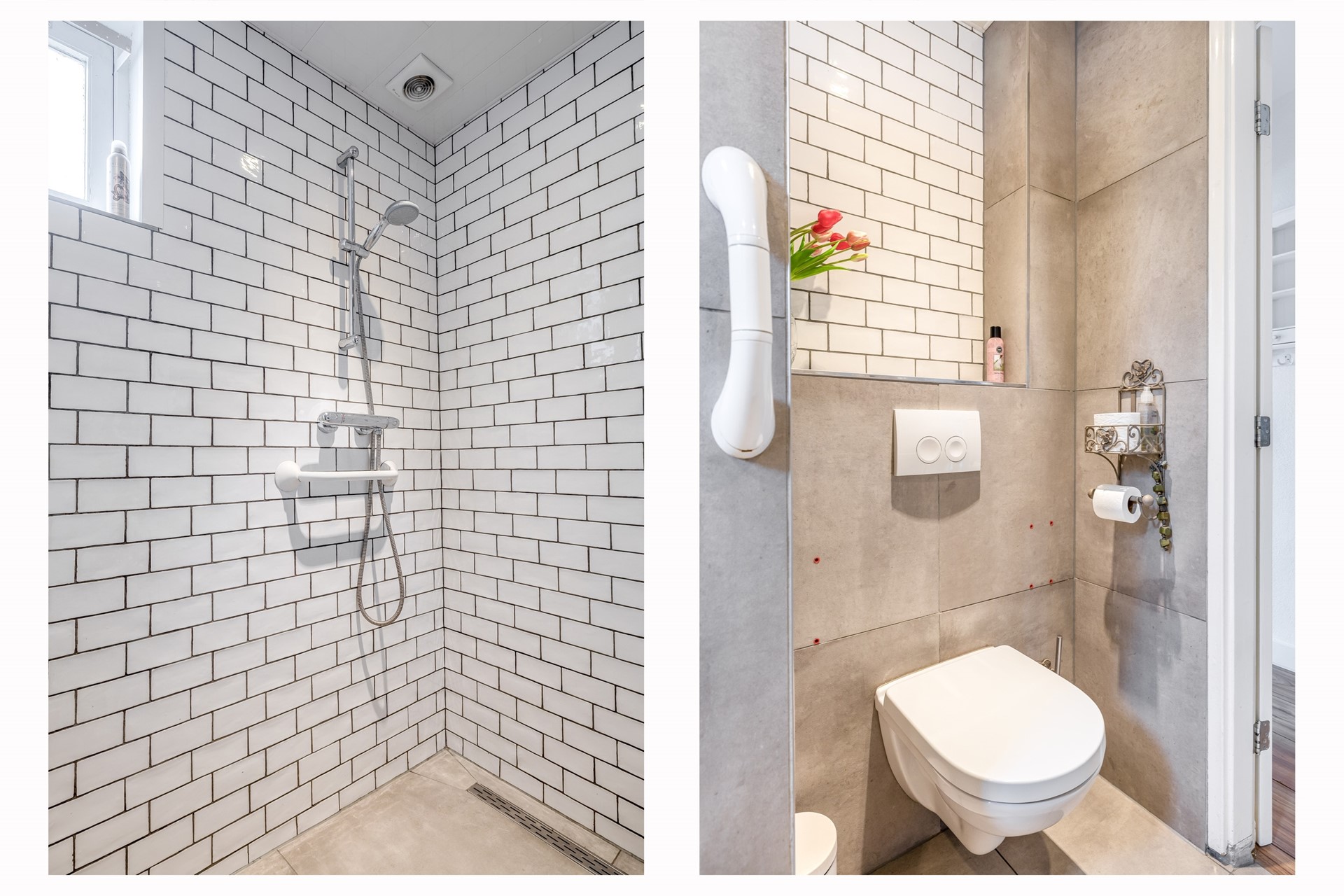 Naast de entree vind u de badkamer met elektrische vloerverwarming, deze is geheel betegeld en voorzien van daglichtinval, een wandcloset, een wastafelmeubel en een doucheruimte.