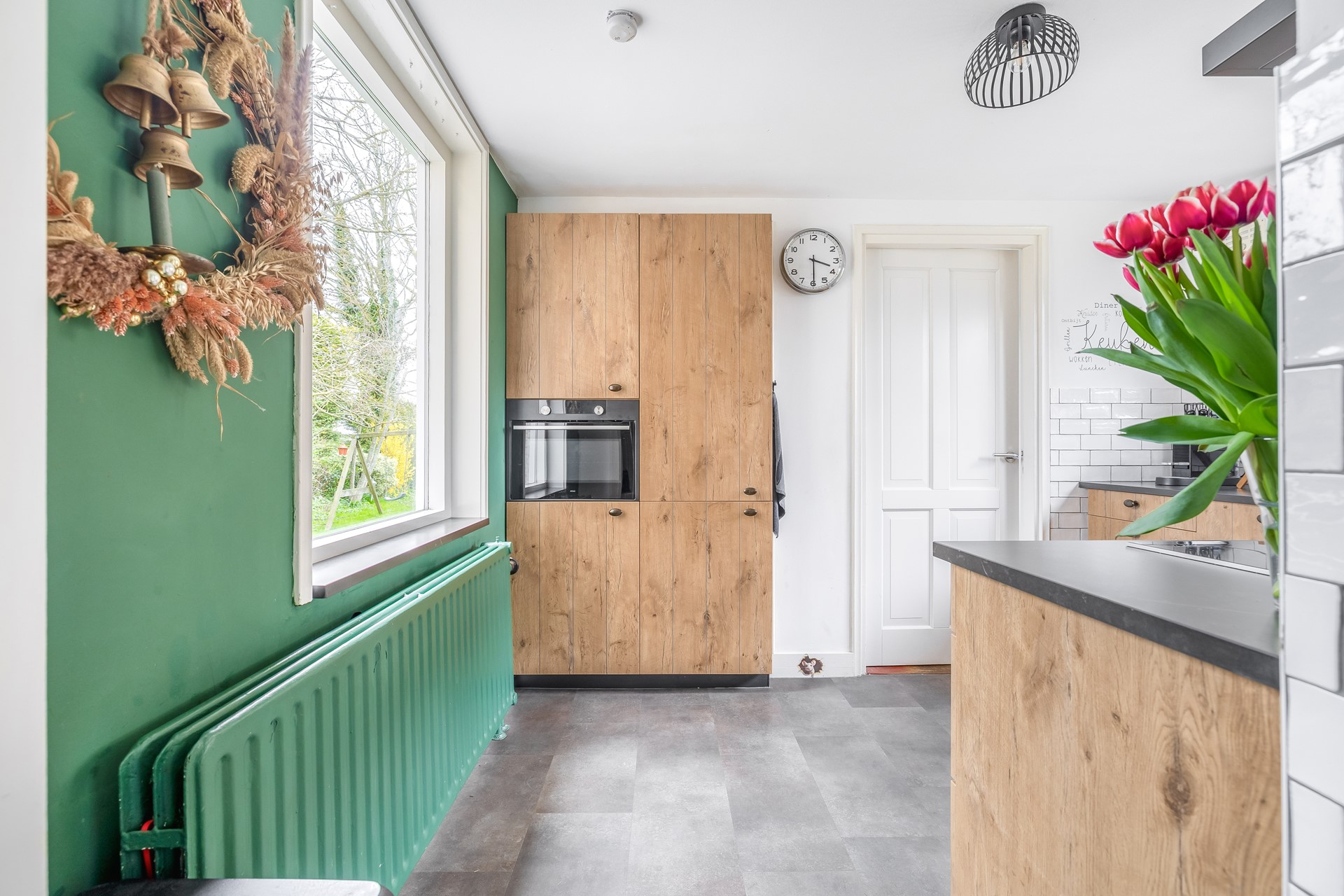 De keuken is halfopen, heeft daglichtinval van twee kanten en is voorzien van een RVS 1½ spoelbak met mengkraan, een Siemens vaatwasser, een Atag 5-pits inductie kookplaat met afzuigkap en een Atag combimagnetron. De keuken bied toegang tot de bijkeuken en de aangebouwde garage.